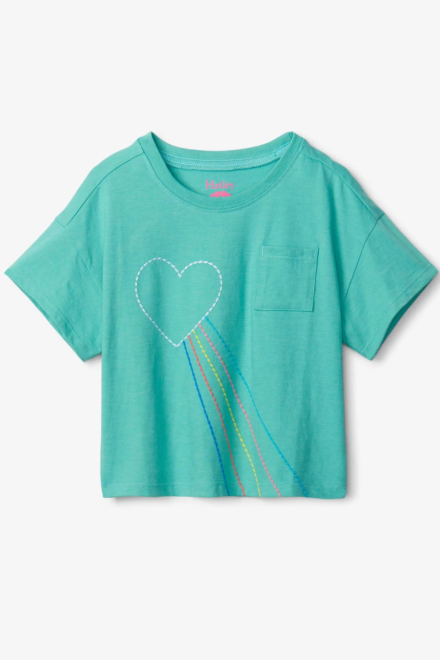 to any outfit. Featuring a white embroidered heart with a colorful rainbow on the front, along with a front pocket. The boxy shape is a fun twist on a