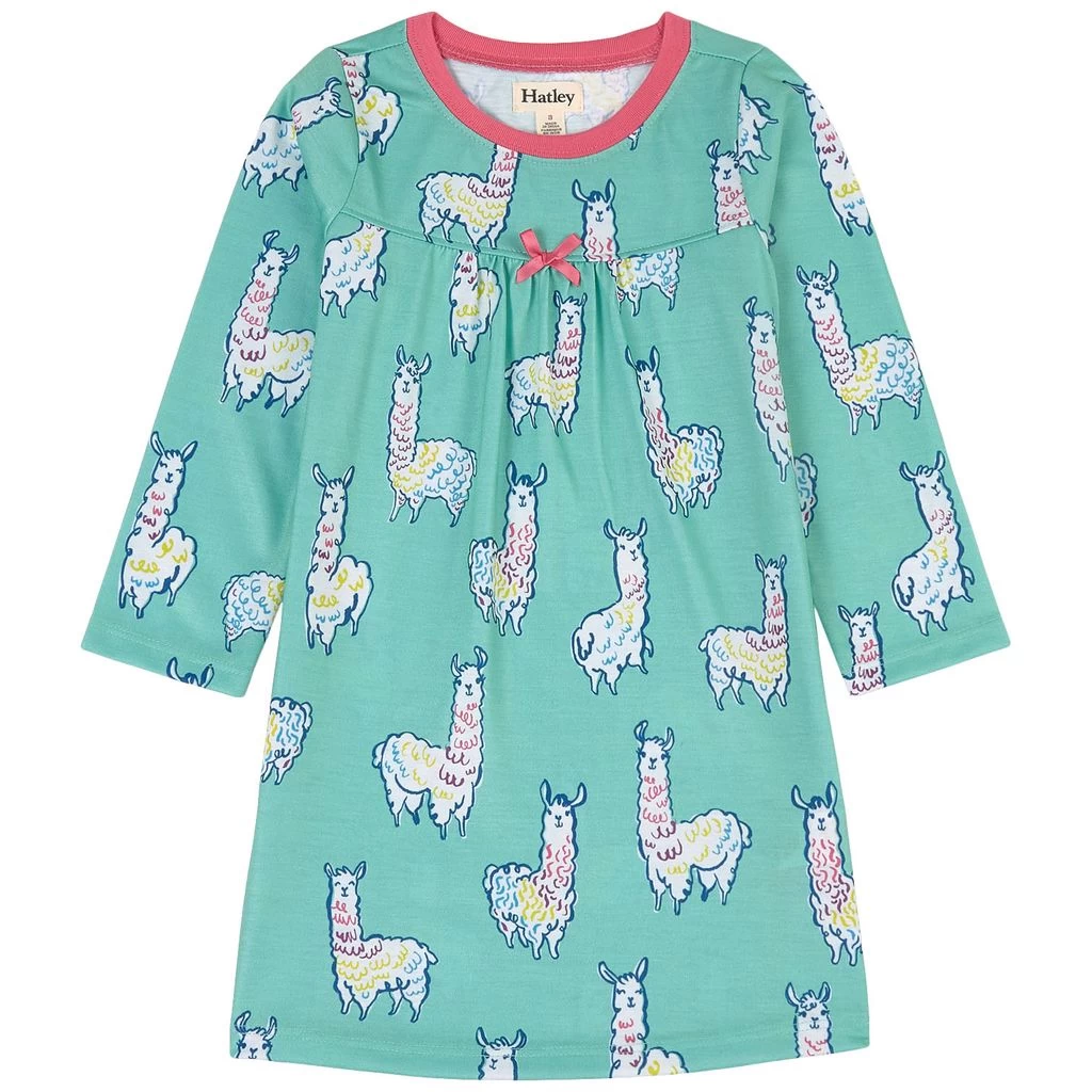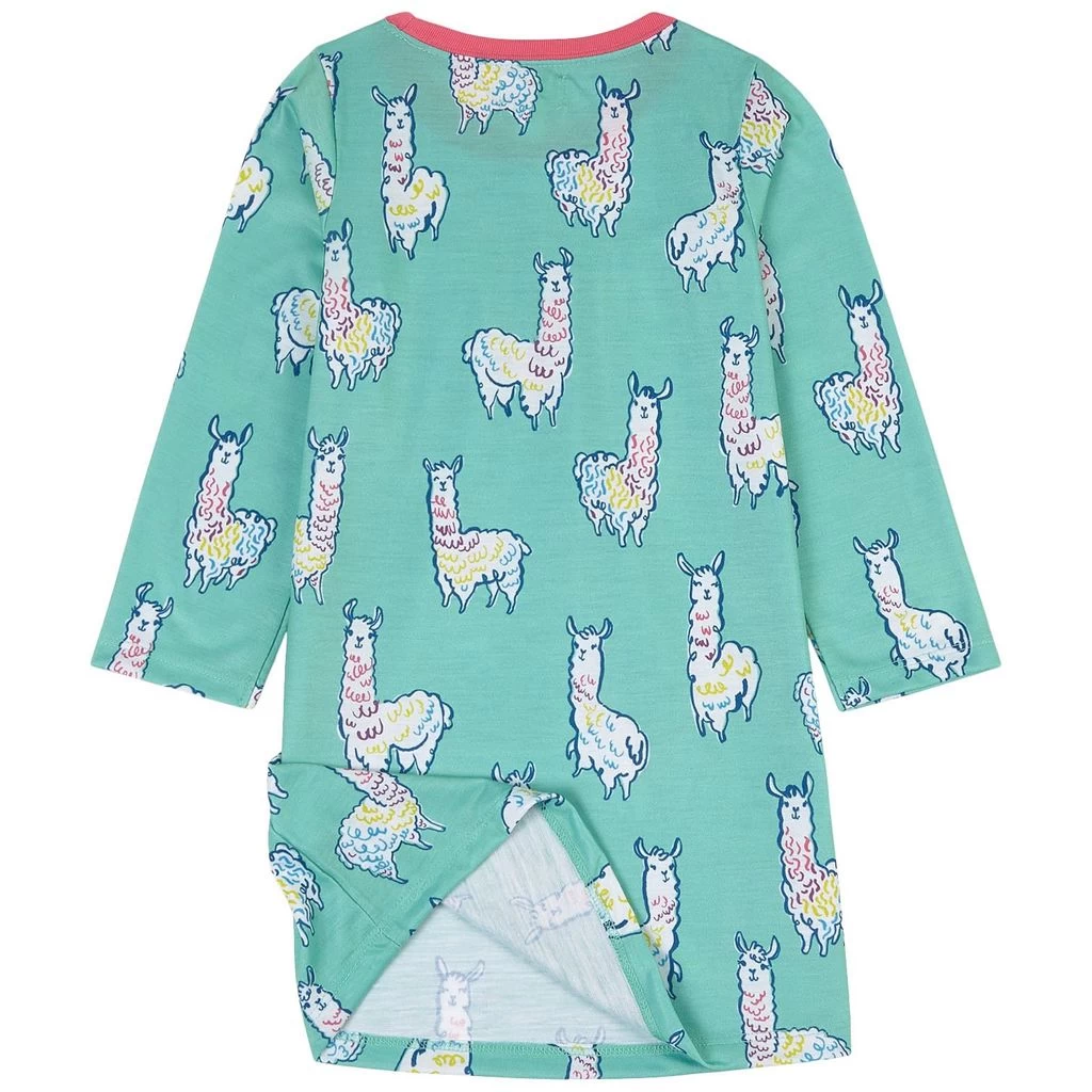 Perfect for a good night’s sleep. Green Adorable Alpacas night dress by Hatley. The nightgown has a playful all-over print. It has a ribbed, contrasting crew-neck and gathering with a bow detail at the front.