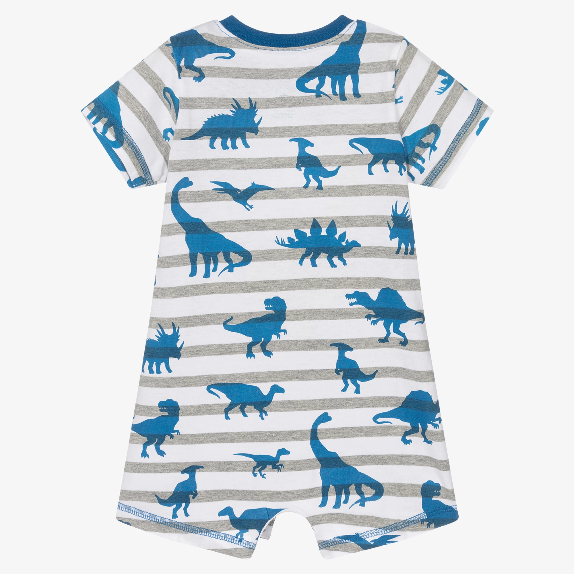 White and grey striped shortie for baby boys by Hatley, with a fun all-over blue dinosaur print. Made in soft and comfy cotton jersey, it has easy fastening poppers on the shoulder and between the legs.