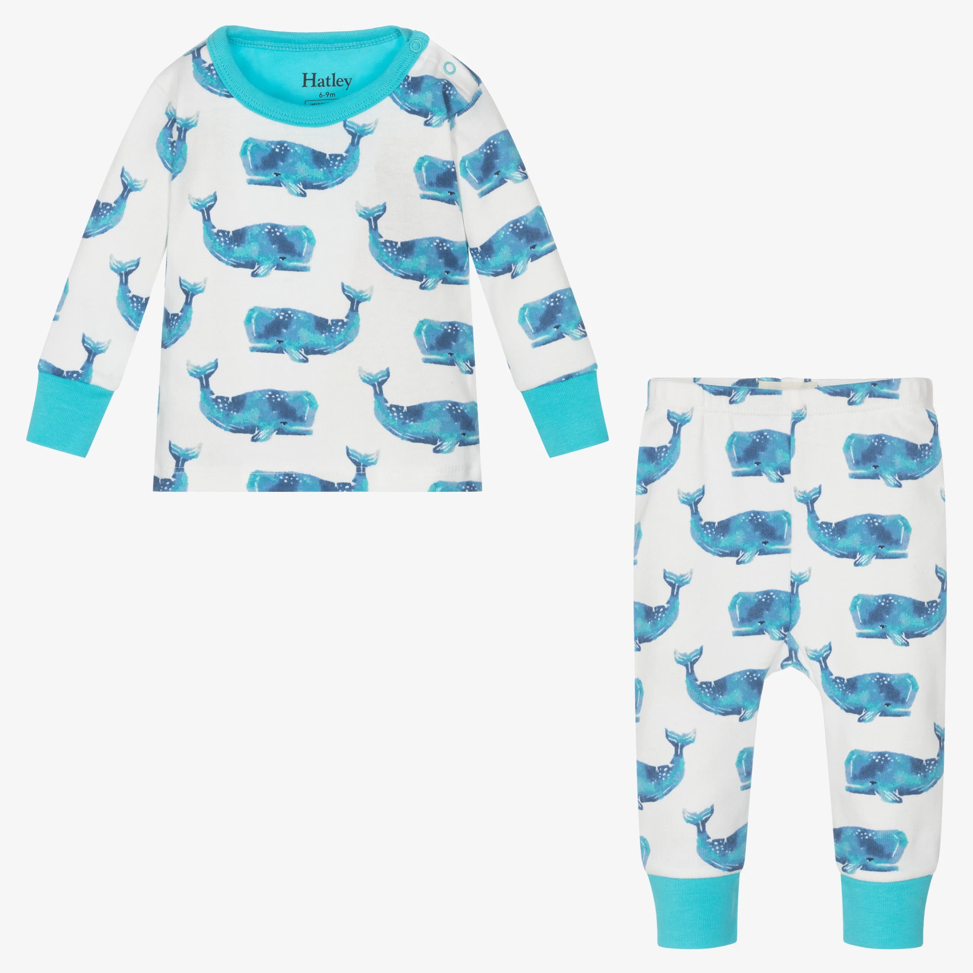 White and blue pyjamas for baby boys by Hatley, printed with whales in a watercolour design. Designed to fit snugly, these pyjamas are made in soft and lightweight cotton jersey, making them ideal for bedtime lounging. To make dressing easier for parents, the top has useful popper fastenings on one shoulder.