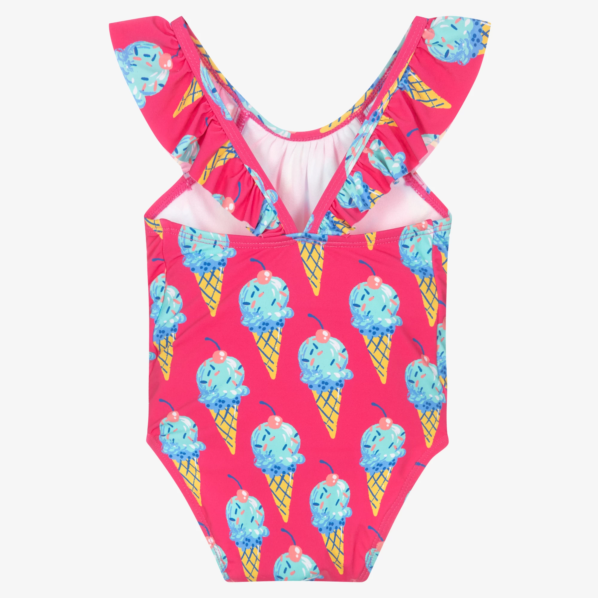 Pink swimsuit for baby girls by Hatley, with sun protection UPF50+. Silky soft and stretchy, it has a blue and yellow ice cream print, and pretty ruffle trim. There are popper fastenings between the legs.