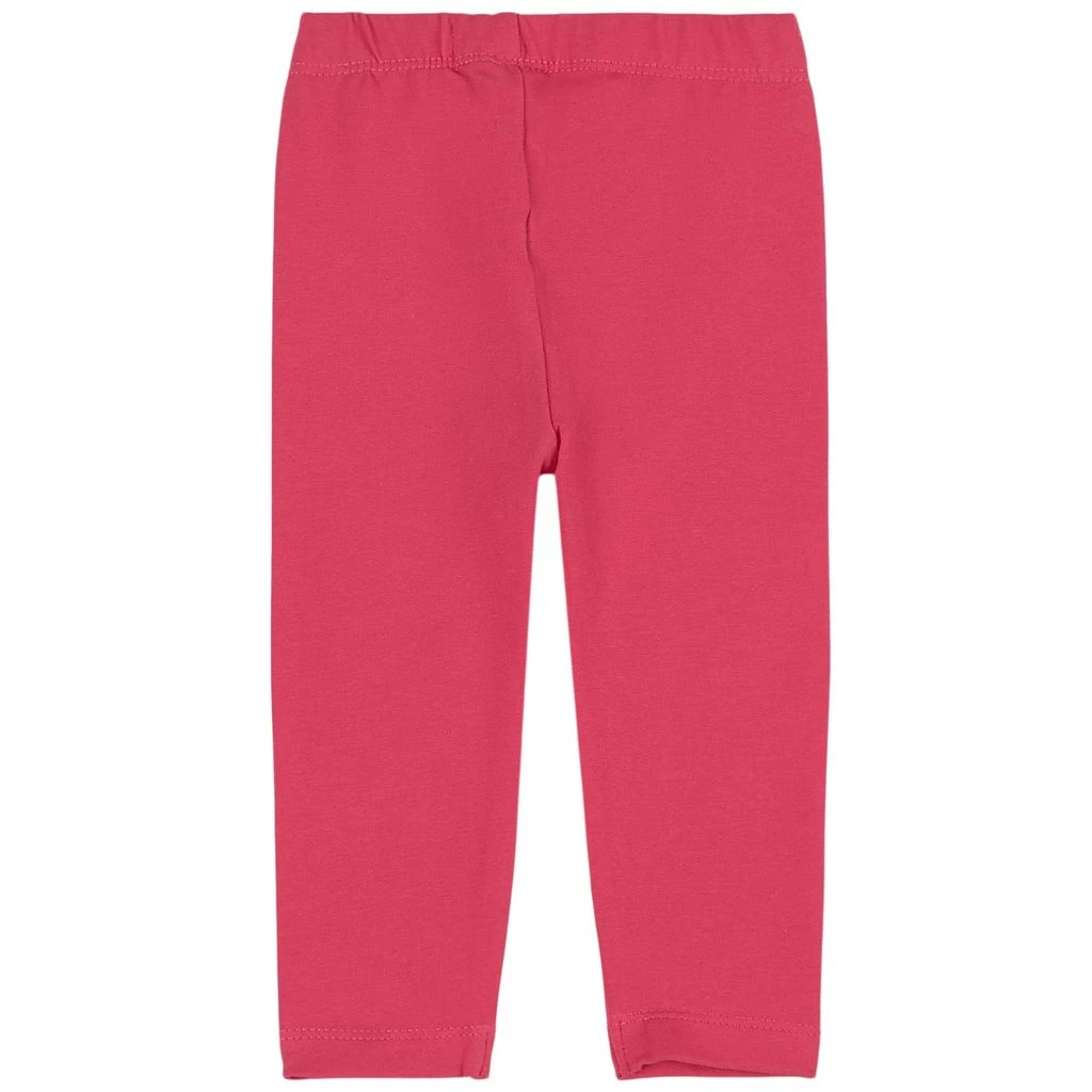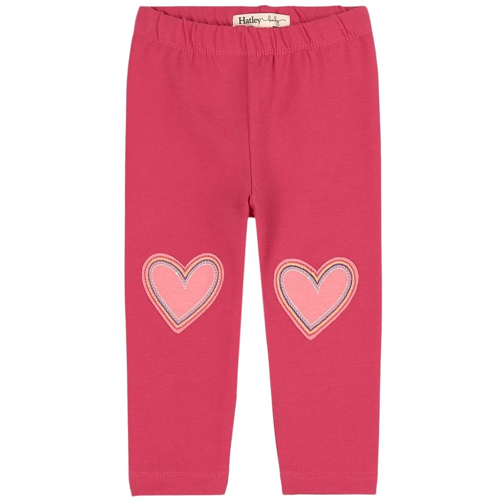 Look cute in these comfy leggings. Pink, magenta baby leggings by Hatley. The baby leggings have an elasticated waist. They have heart-shaped knee patches for added durability.
