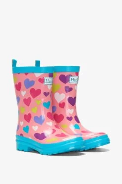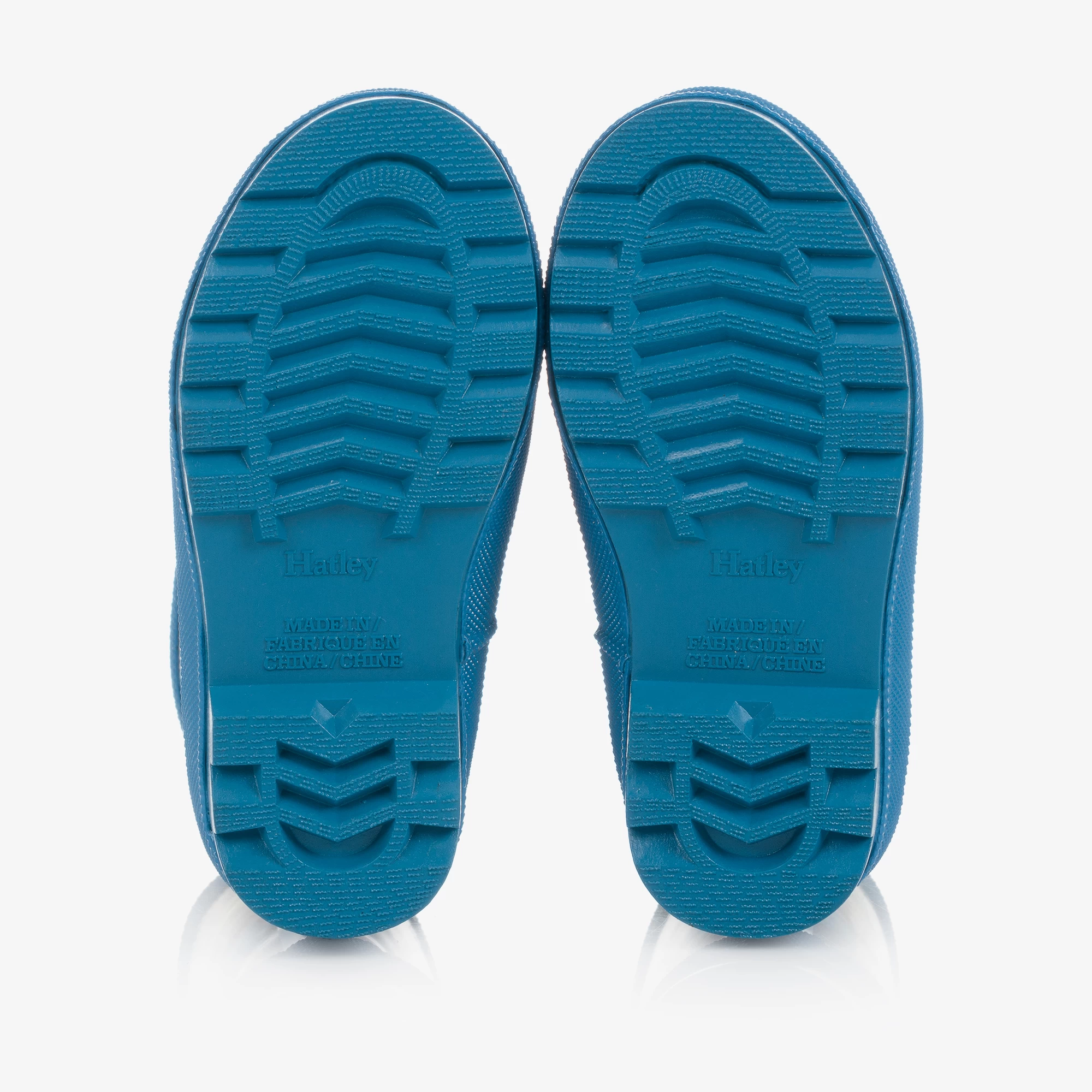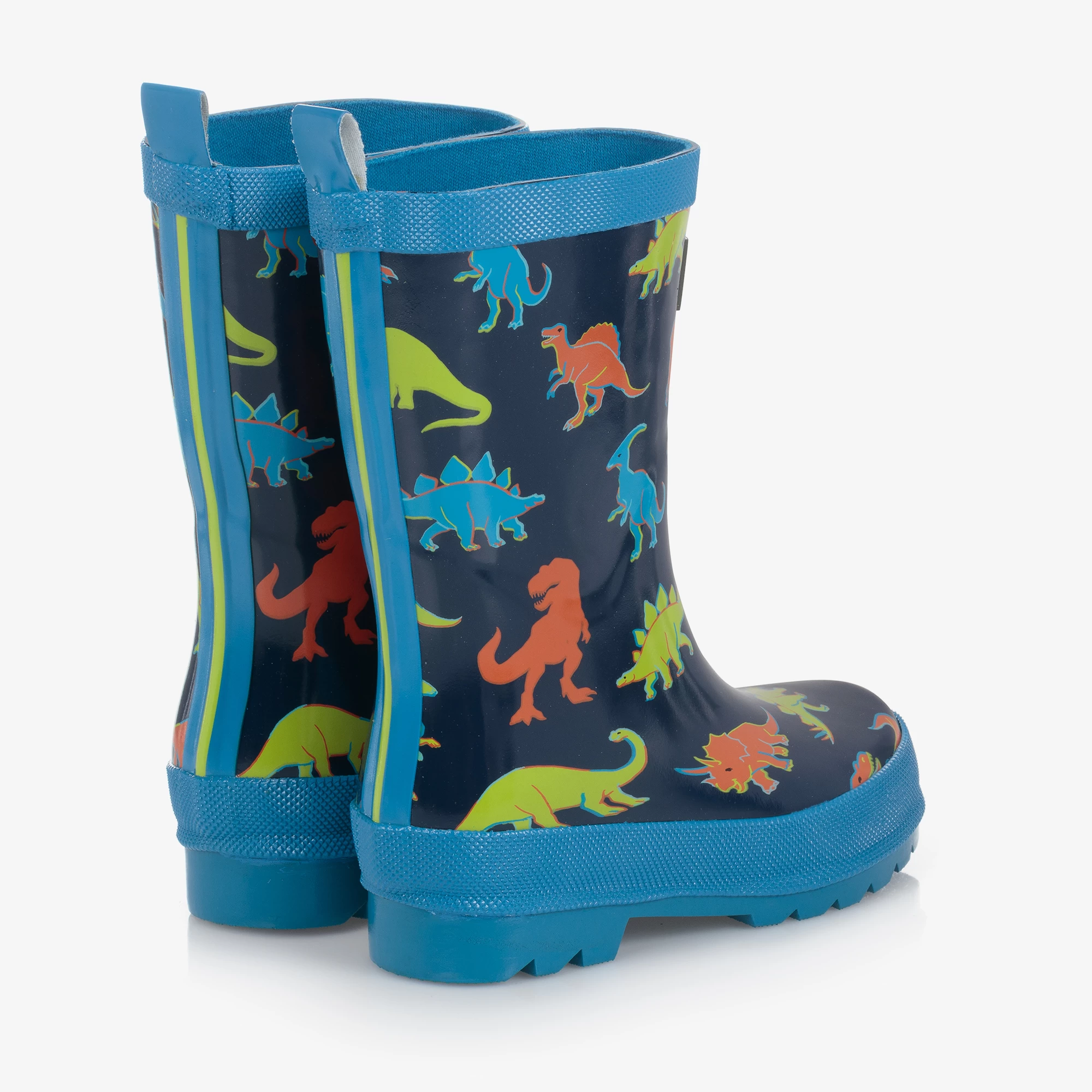 Boys shiny blue rubber rain boots by Hatley, with a green, orange and blue dinosaur print. They have moulded rubber soles for a good grip and a soft cotton lining. There is a pull tab on the back and a reflective logo patch on the front.