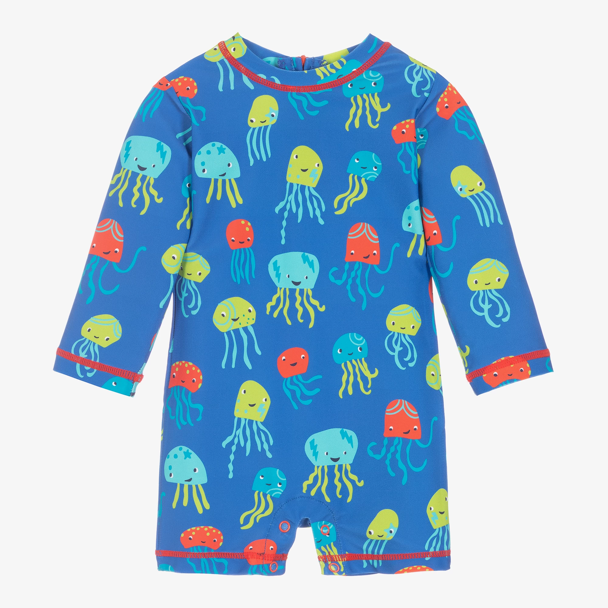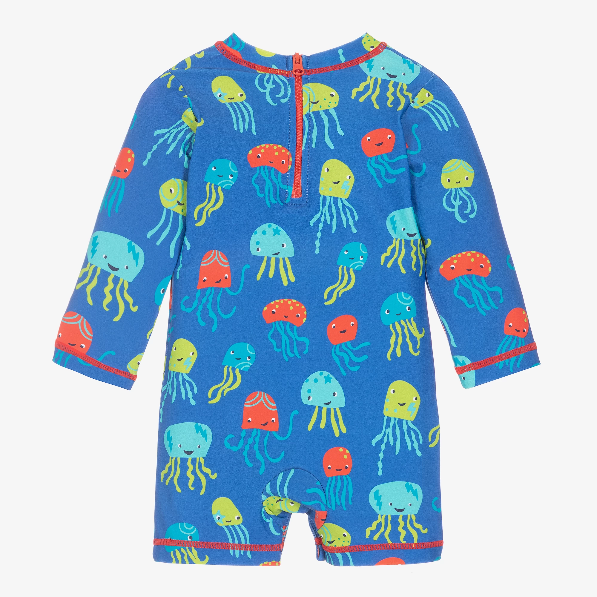 Cute blue sun suit for baby boys and girls by Hatley, patterned with vibrant and playful jellyfish. Silky smooth and stretchy, it is made with UPF50+ fabric with red stitchings for accent. There are popper fastenings between the legs and a zip on the back to help make changing easier.