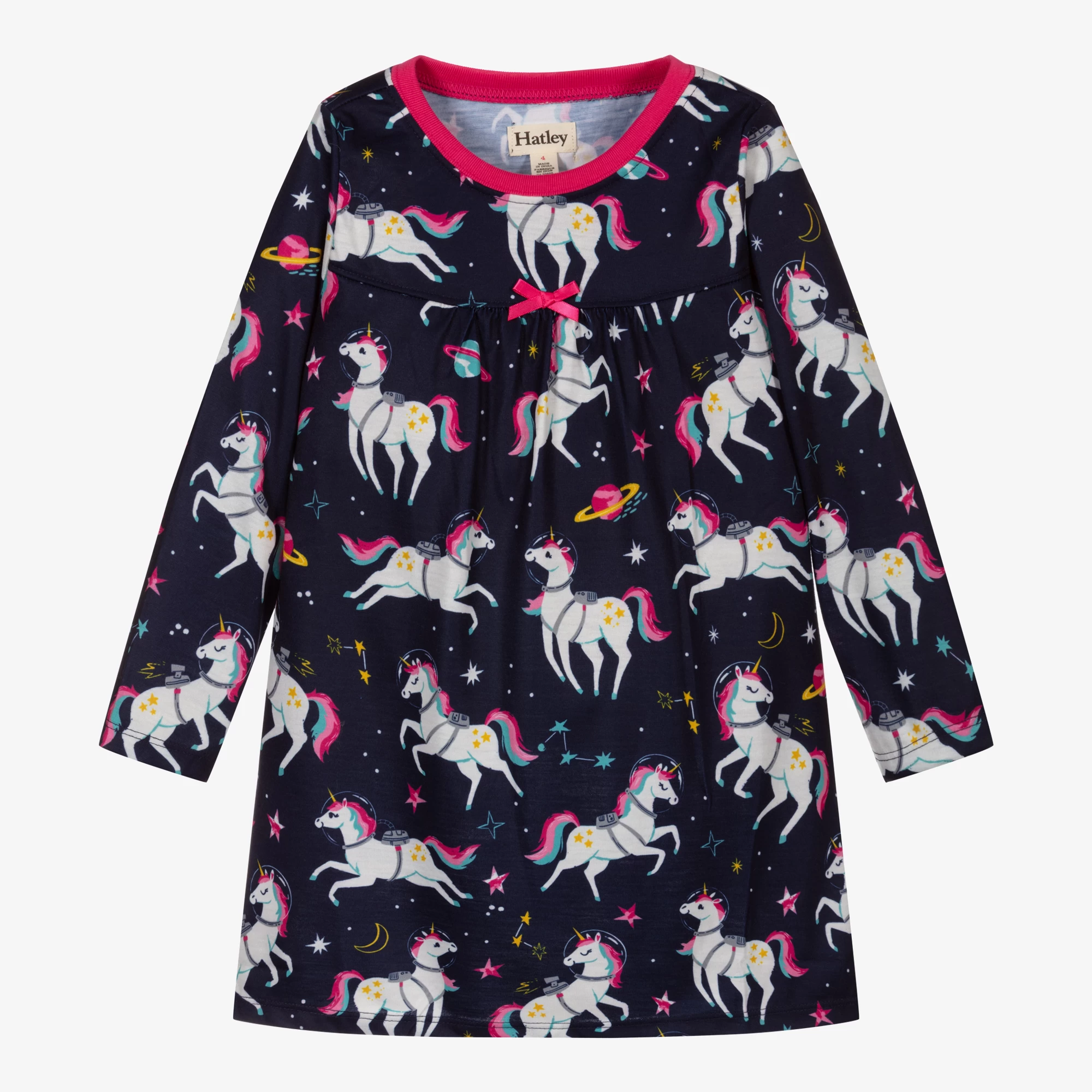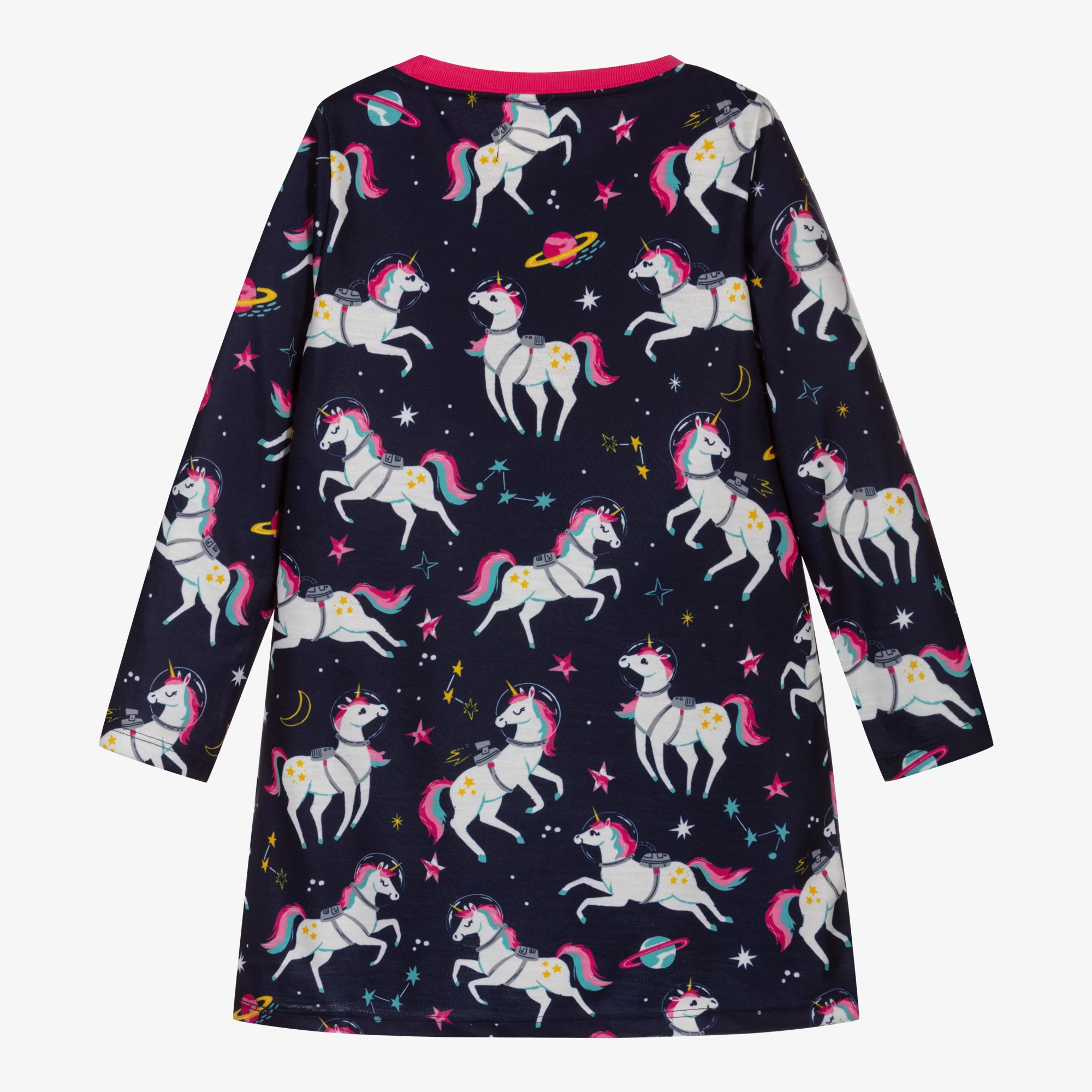 Girls navy blue nightdress from Hatley, made in super-soft polyester jersey. It has a colourful ‘Space Unicorn’ pattern and fuchsia pink trims. There are gathers from the bodice forming a comfortable, loose shape.