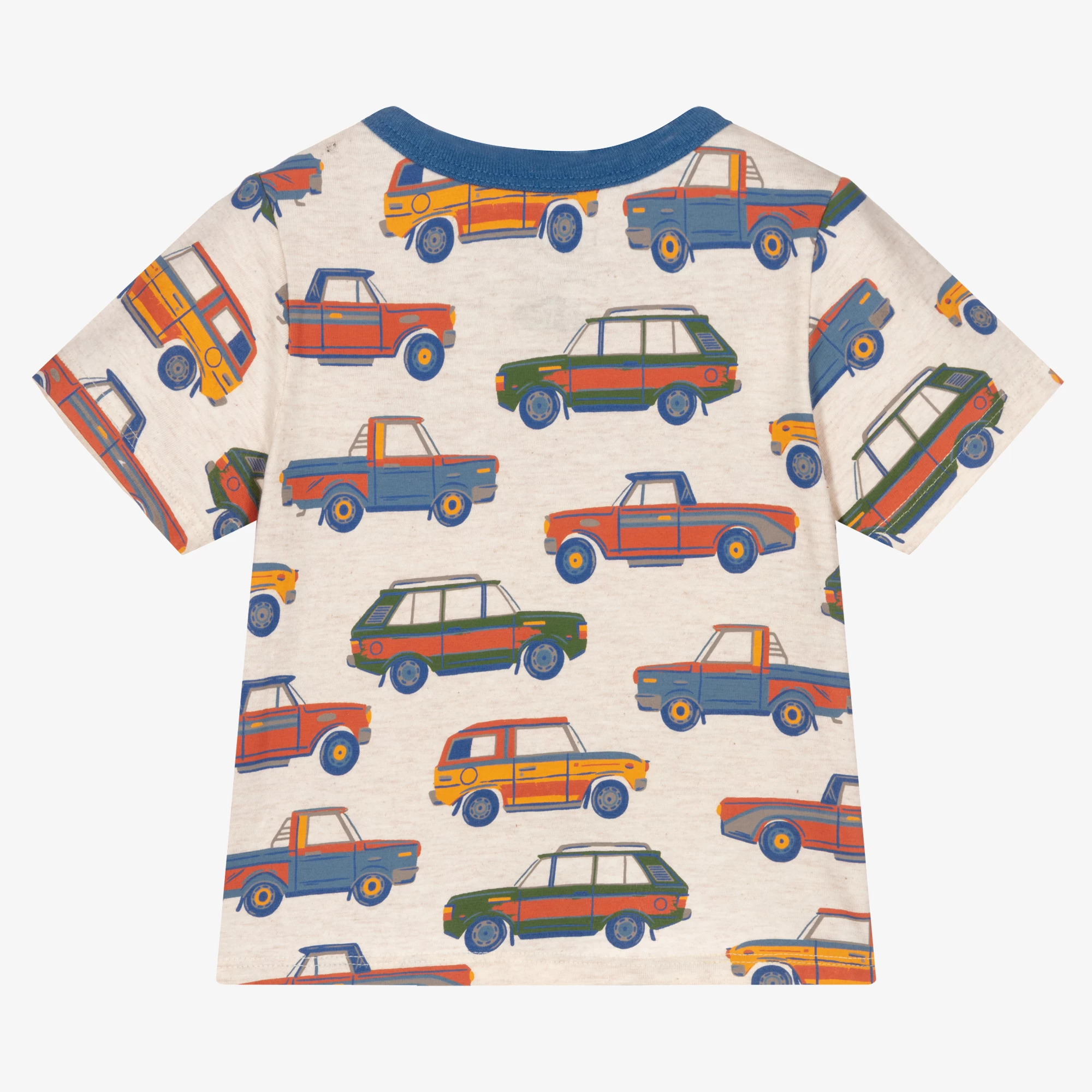 A beige marl T-shirt for boys by Hatley. Made in soft, stretchy cotton jersey, it has a fun car print in terracotta orange, blue and green. There are useful button fastenings on the front and blue trim around the neckline.