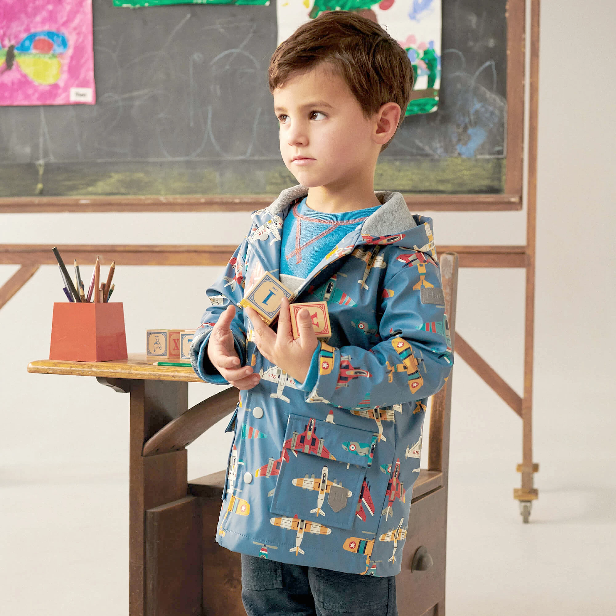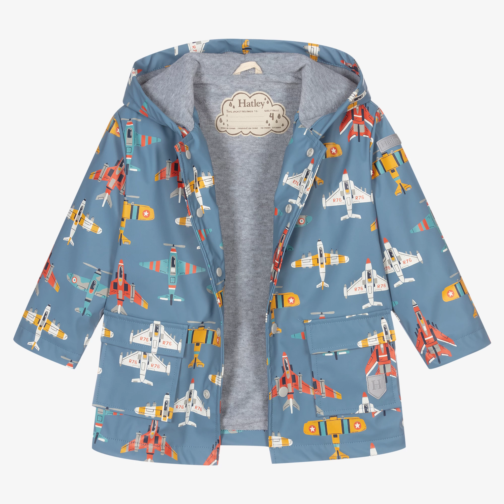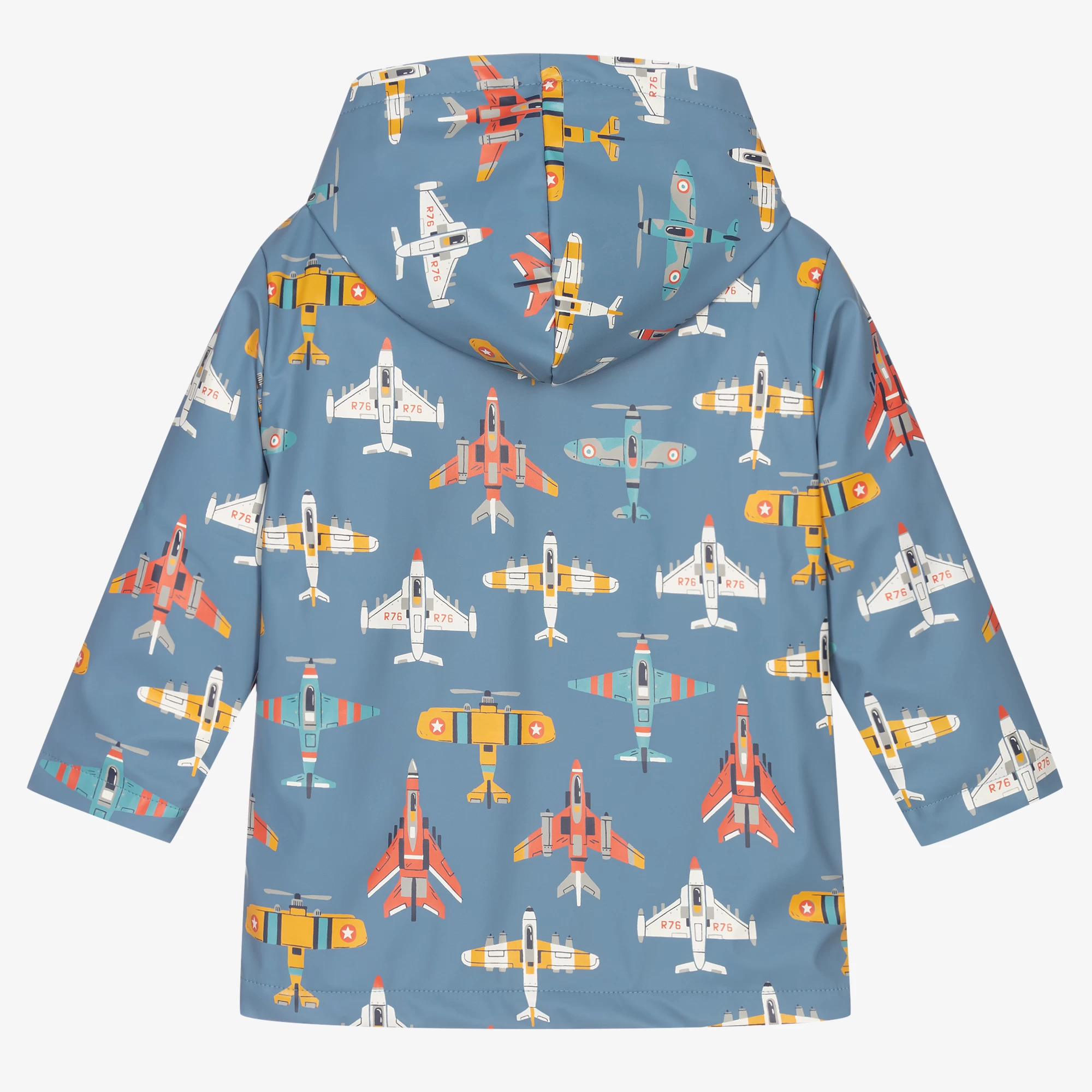 Blue waterproof raincoat for boys by Hatley, with a hood. Made in polyurethane-coated polyester, it is patterned with yellow and red aircraft and fastens with grey poppers. There is a reflective logo badge on one sleeve and pocket and it has a lightweight grey towelling lining.