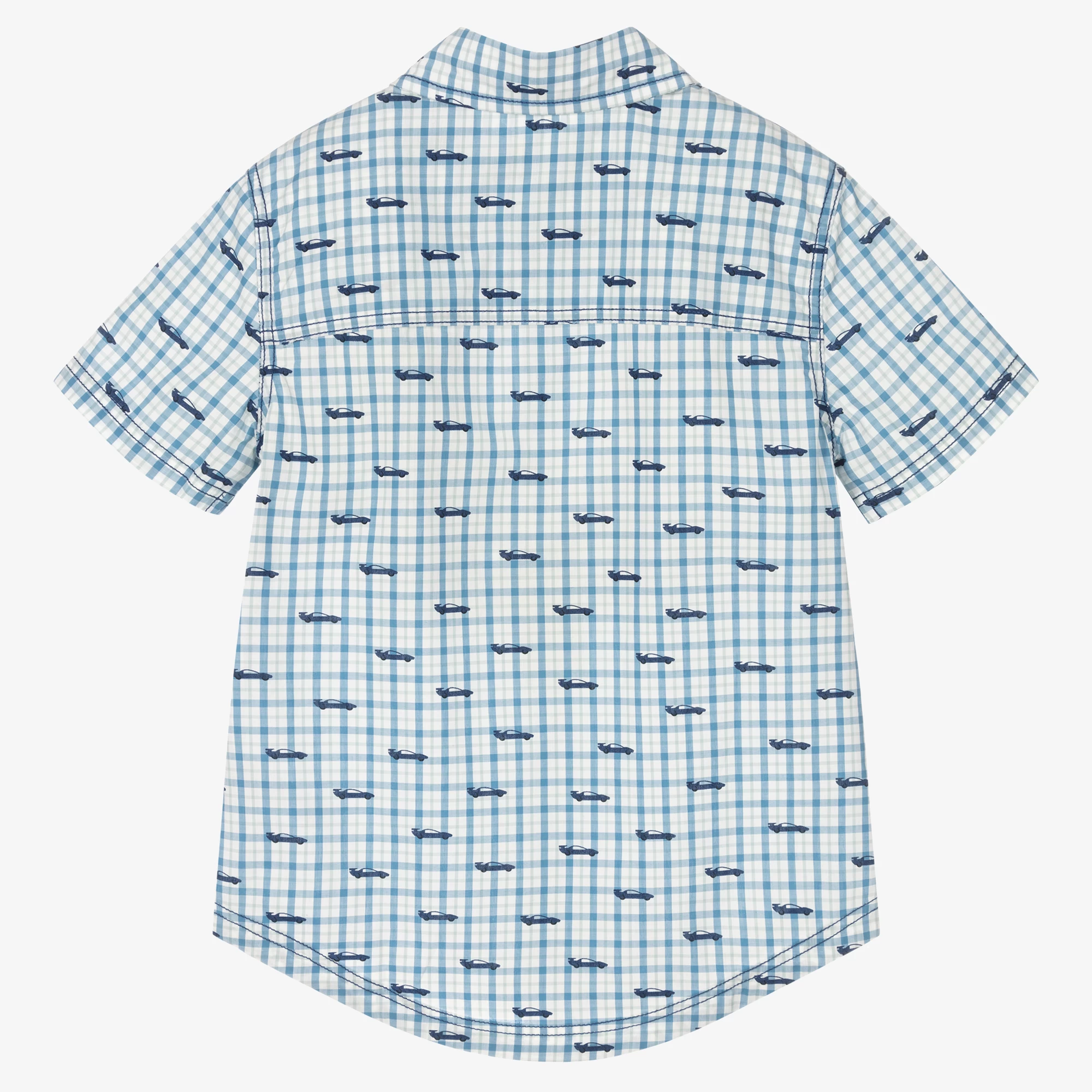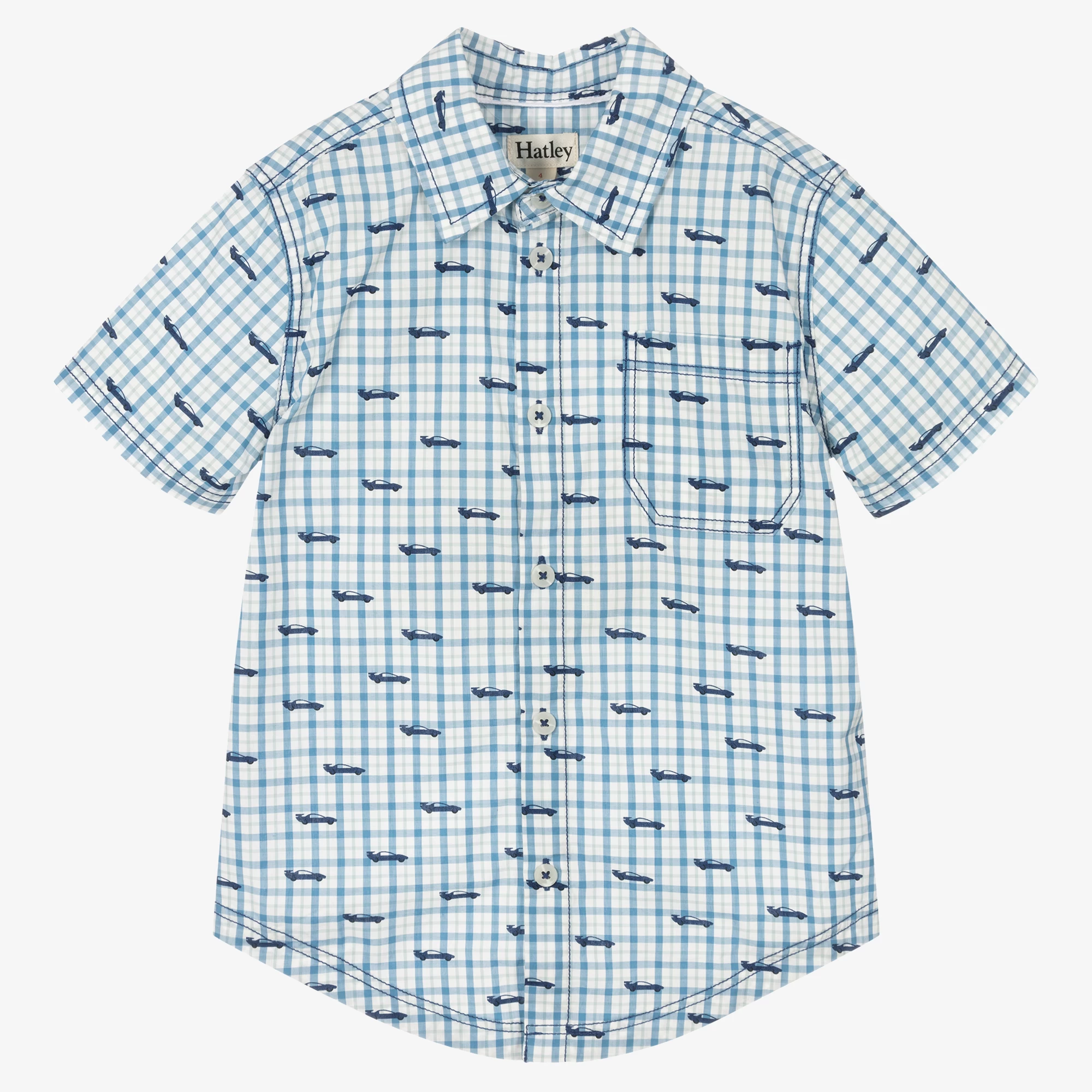 Blue and white checked shirt for boys by Hatley, with an all-over fun car print in navy blue. It is woven in soft cotton poplin and has a chest pocket.