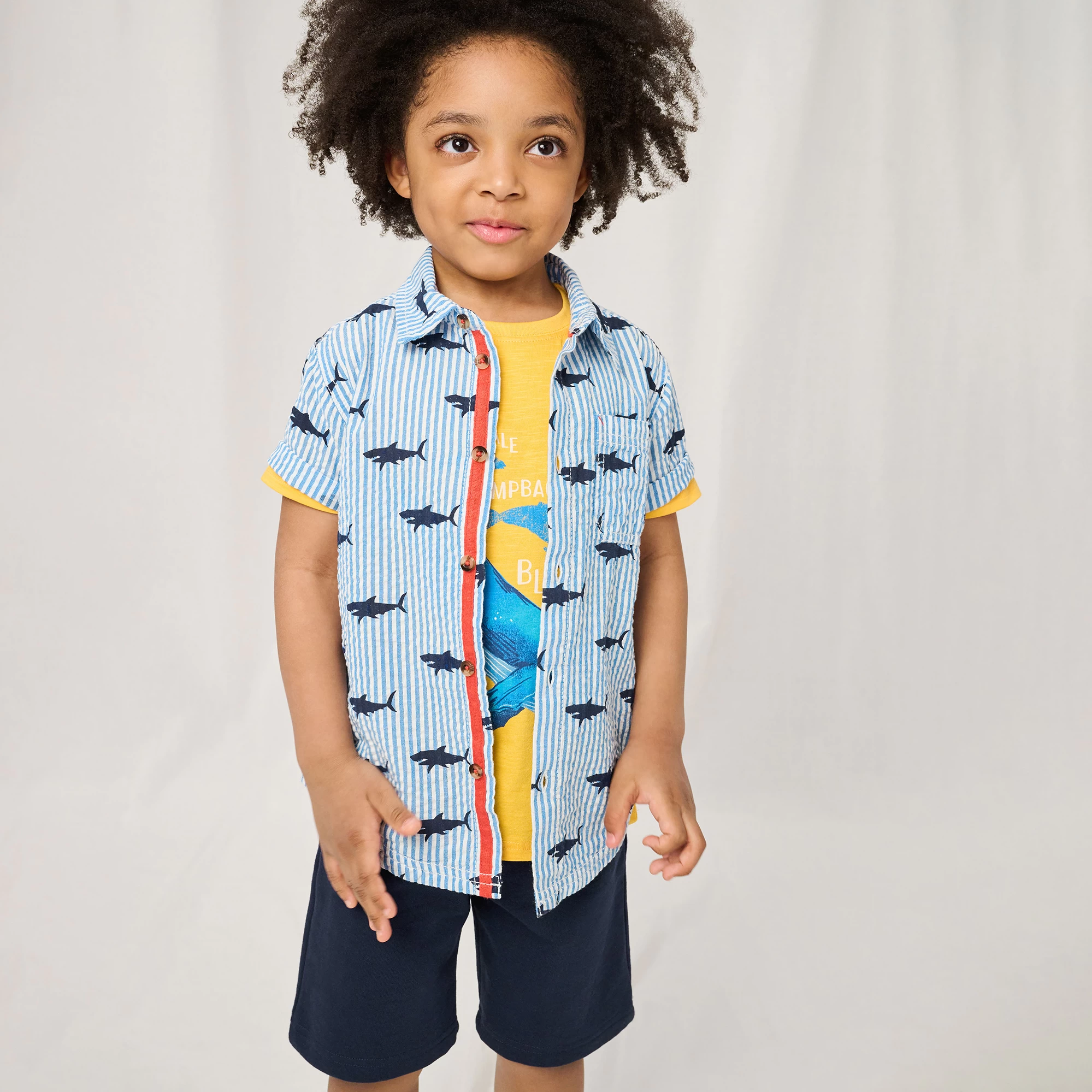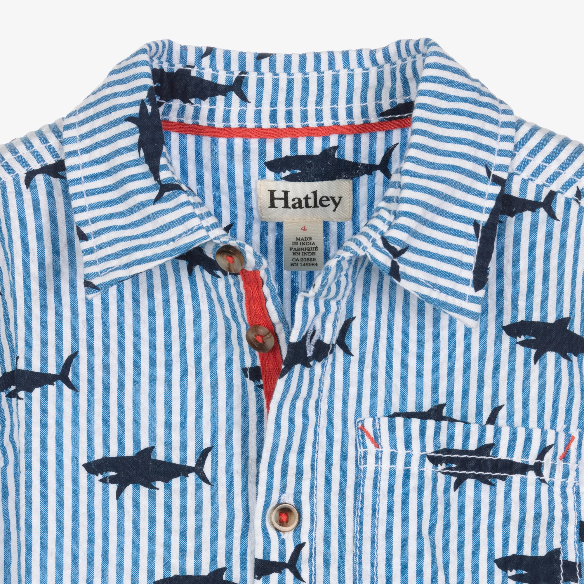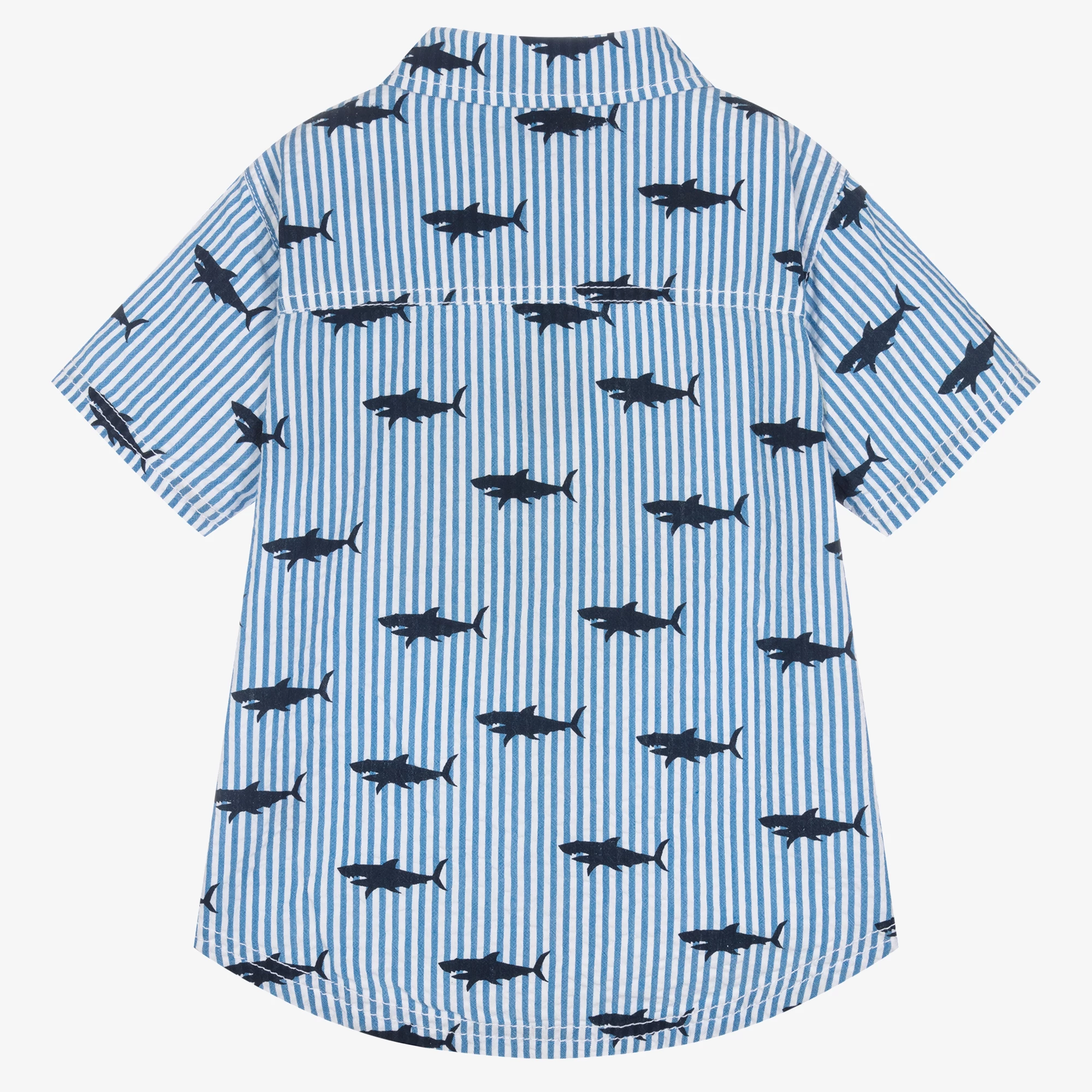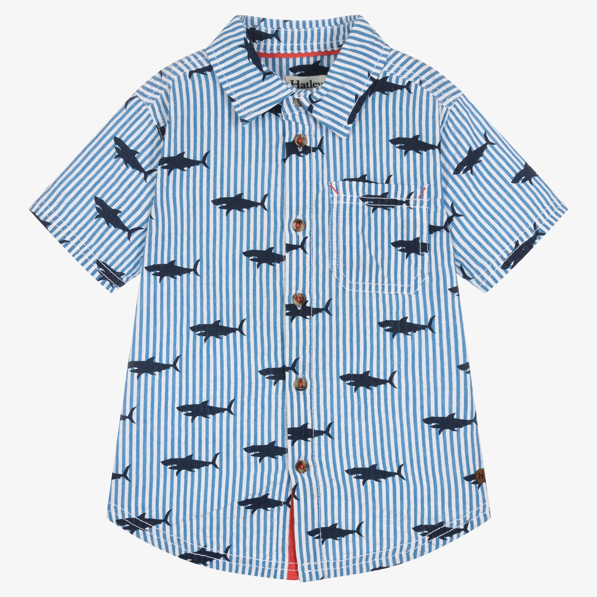 Blue striped shirt for boys by Canadian brand Hatley, made in lightweight cotton seersucker. Worn day or night, this button-down shirt has an all-over shark print in dark navy blue. A great smart-casual piece, it has a classic point collar, short sleeves and a patch pocket on the chest.