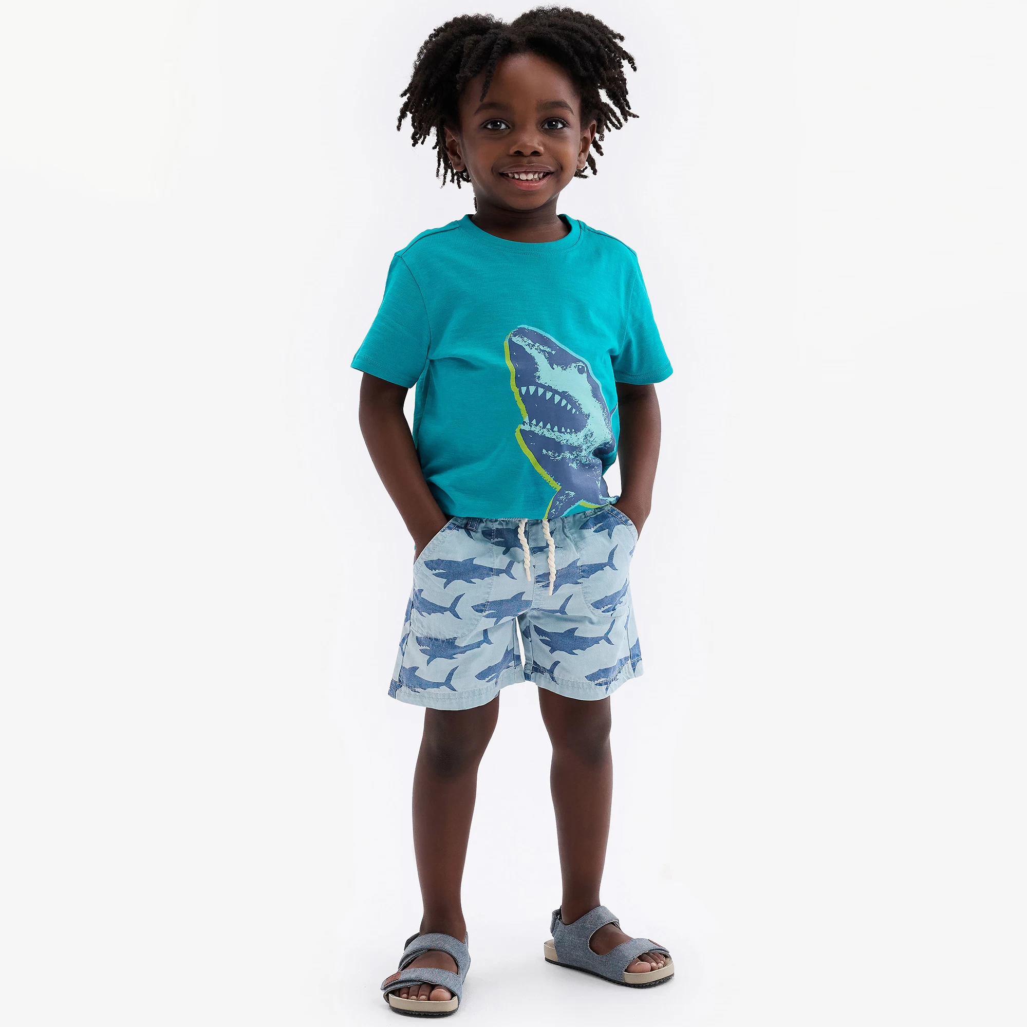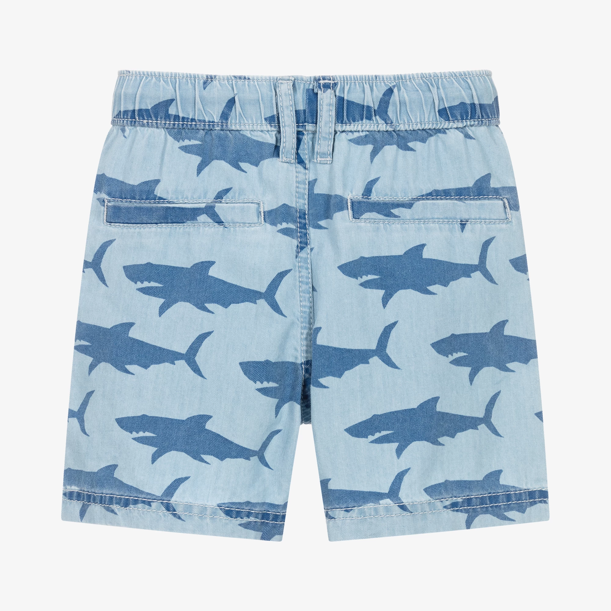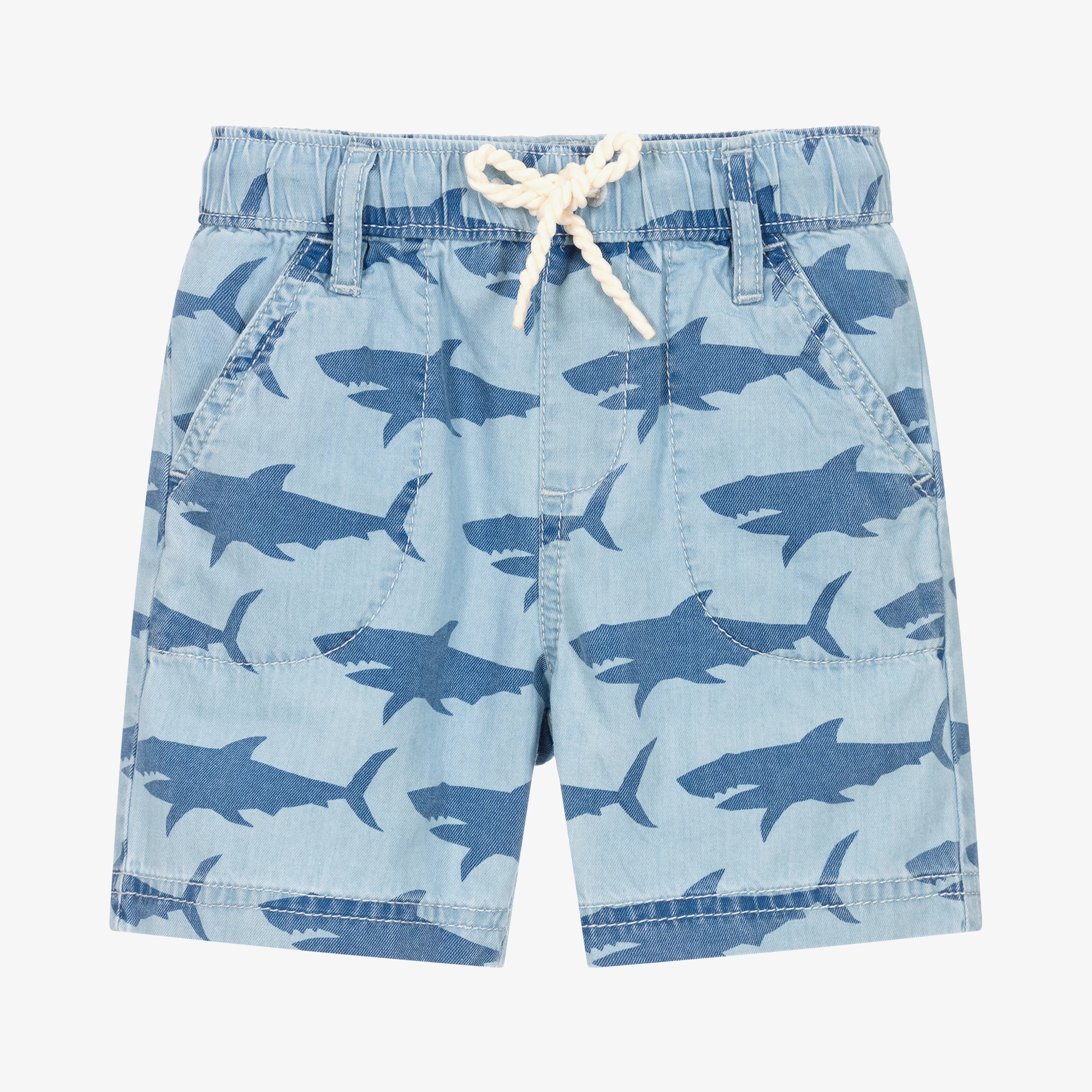 Two-tone blue shorts for boys by Hatley, made from soft, lightweight, cotton. These easy-to-wear casual shorts have a fun shark print and fixed rope drawstring ties, to complete the nautical look. The elasticated waistband allows for a comfortable fit and they have slanted front pockets and faux back pockets.