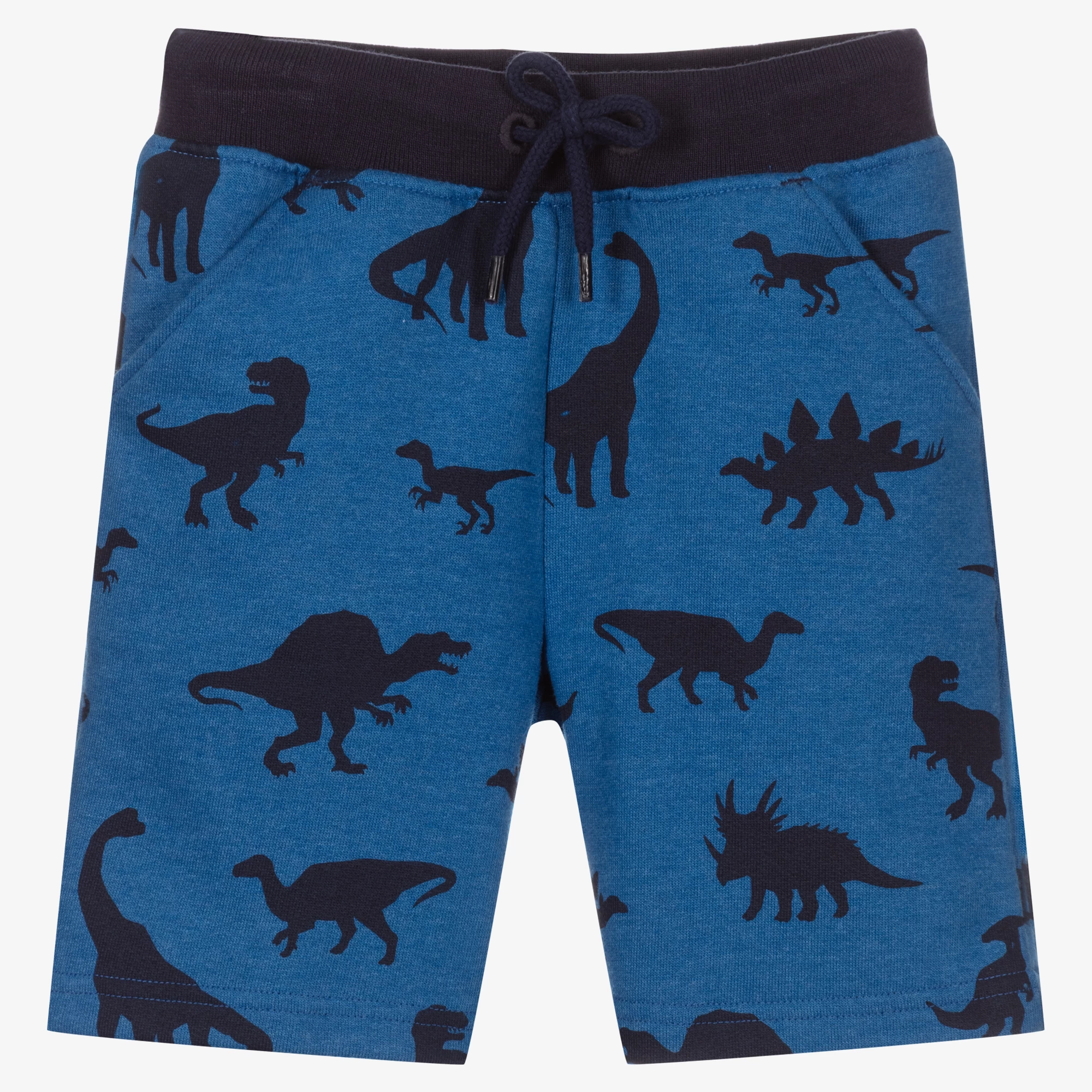 Boys blue and navy blue Bermuda length shorts by Hatley. Made in soft, stretchy cotton jersey they have a fun navy blue dinosaur print. The matching elasticated waistband has a useful drawstring, to ensure a comfortable fit. There are useful side pockets.