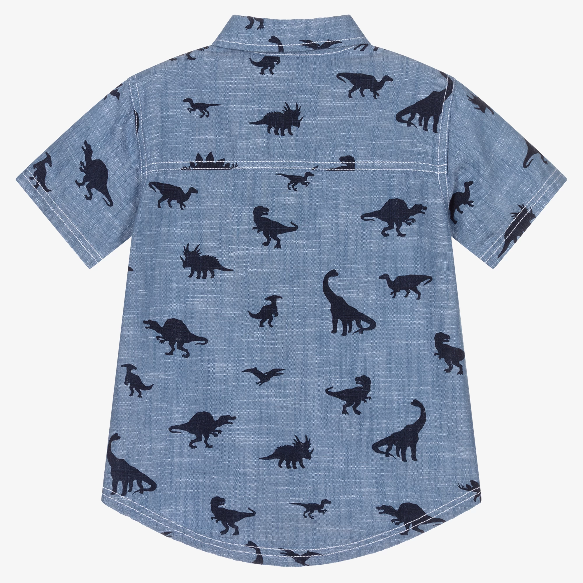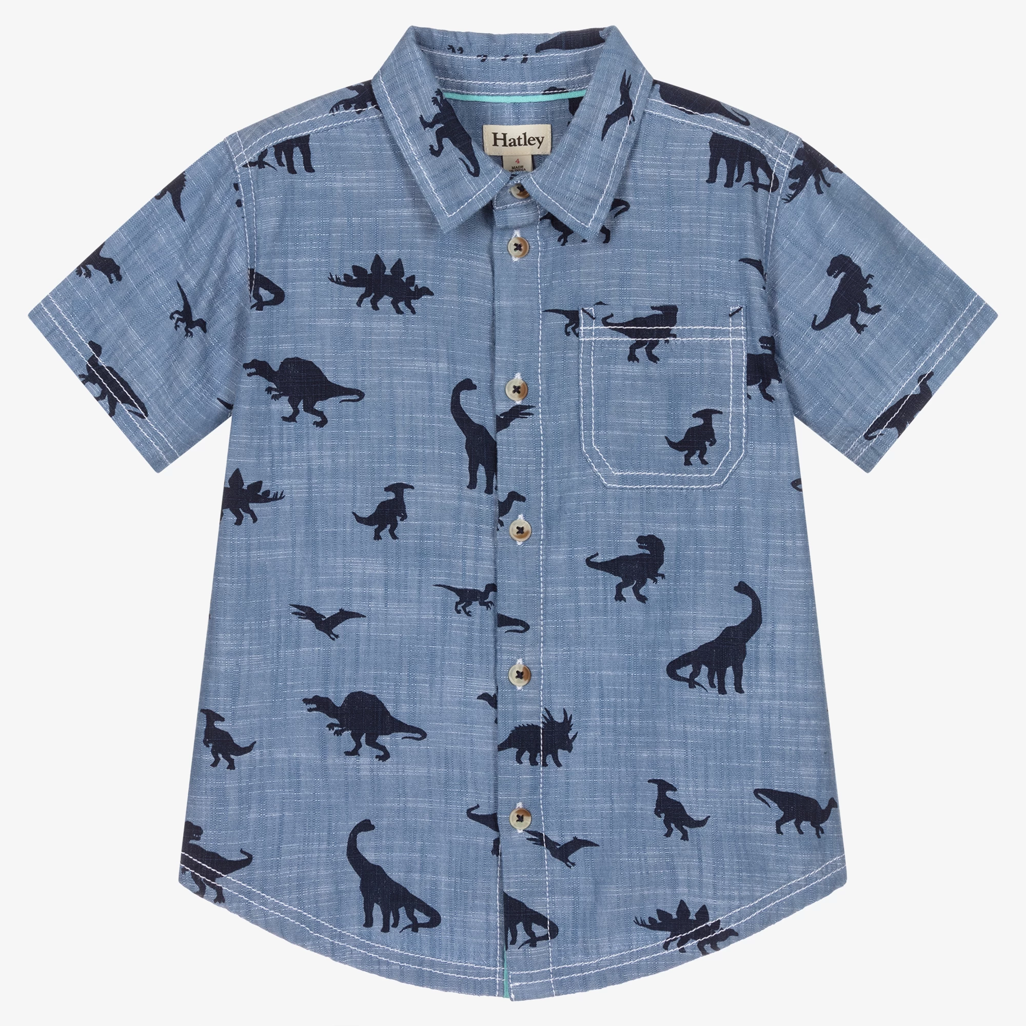 A fun short sleeved blue cotton shirt for boys by Hatley, with white slub in the fabric and a linen feel. Soft and mid-weight, it has a navy blue dinosaur print and white top stitching. There is a useful patch pocket on the chest and button fastenings on the front.