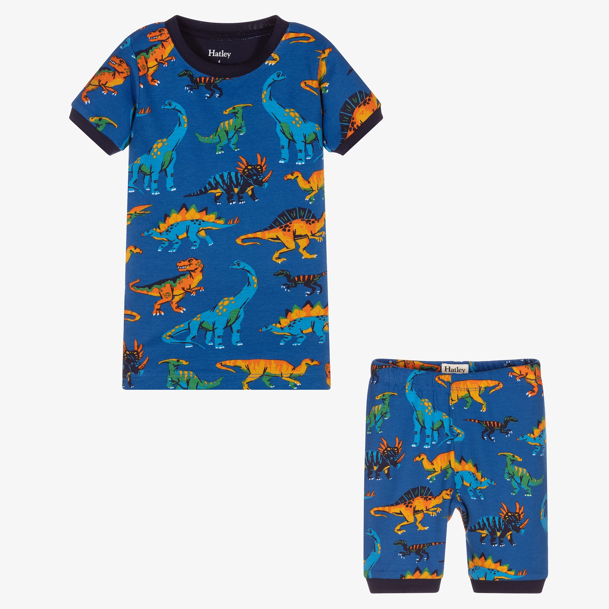 Boys blue short pyjamas from Hatley, with a colourful ‘Dino Park’ pattern. They are made in soft organic cotton jersey, with navy blue ribbed trims. There is logo embroidery on the back neckline and the shorts have a comfortable elasticated waist.