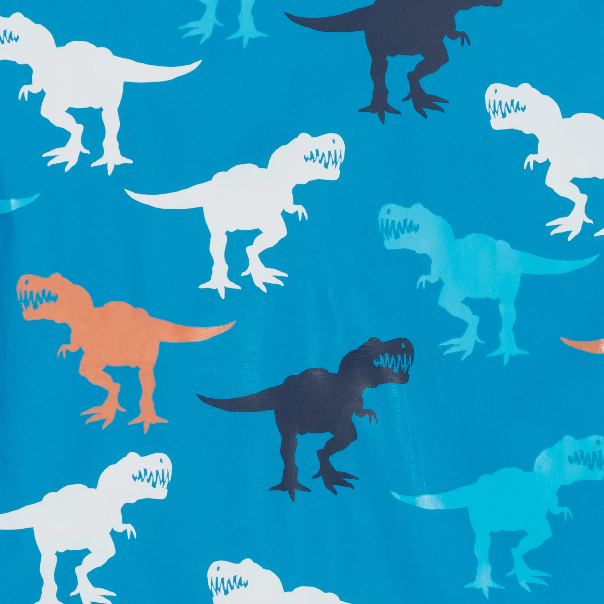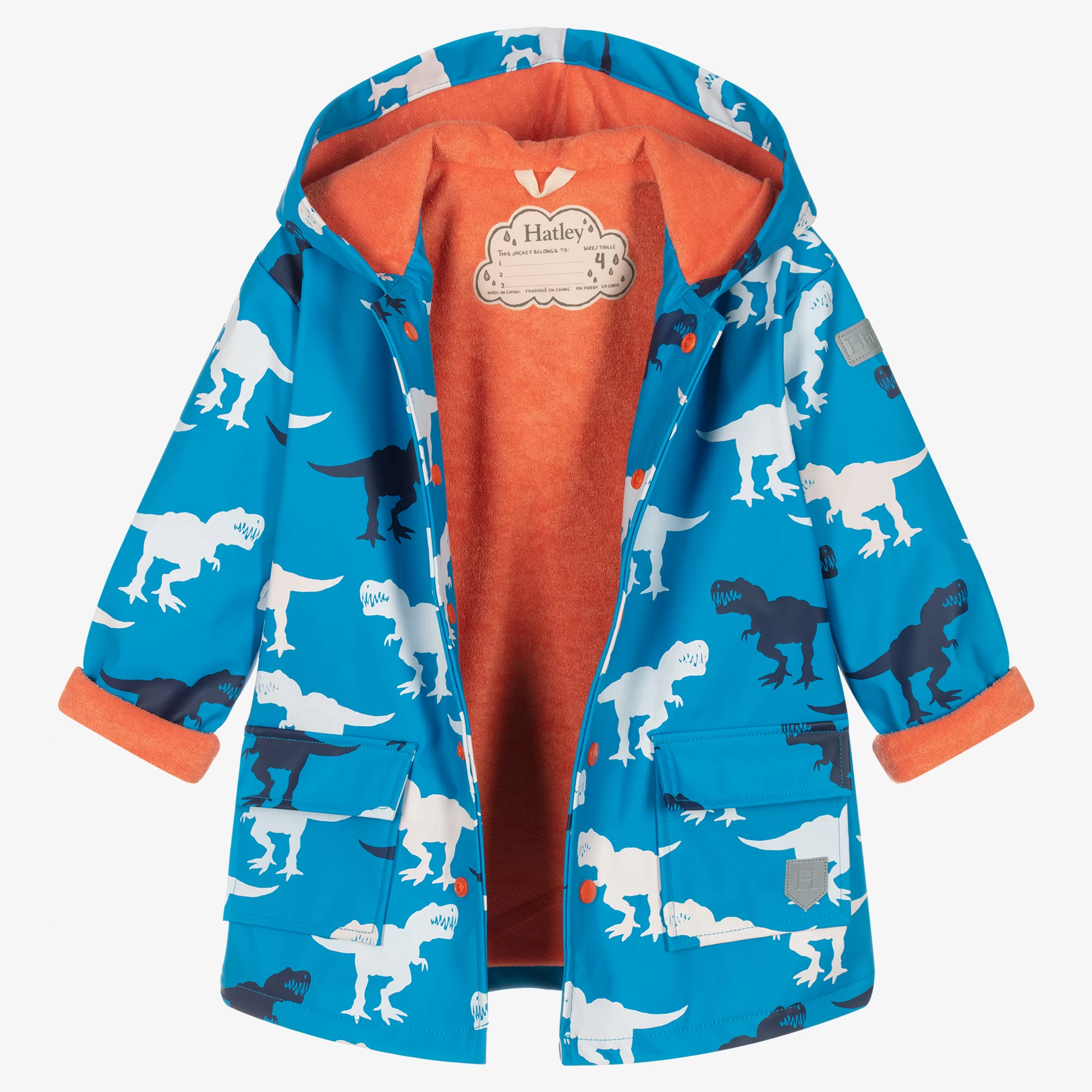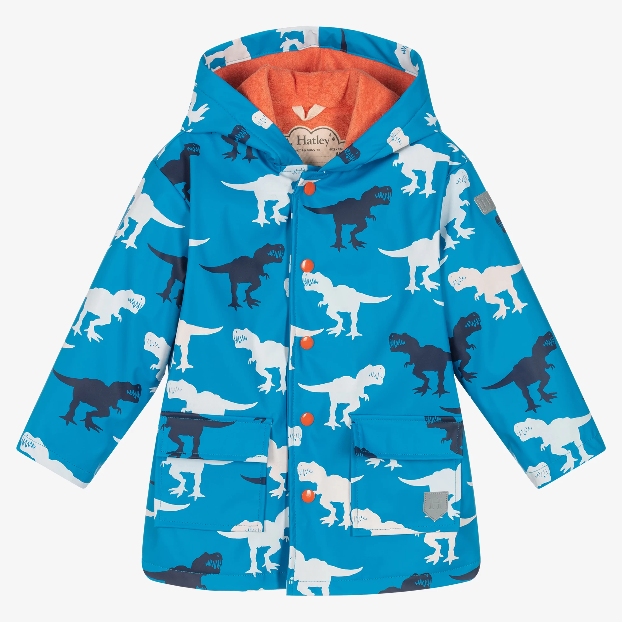Electric blue hooded raincoat for boys from Hatley. Made from impermeable, waterproof materials, this fun raincoat has a navy blue and white T-Rex print all over. Lined in soft, orange microfibre fleece, the outside has a quirky colour changing effect, transforming the dinosaurs into different colours when they get wet. For an added safety feature, it has reflective logo patches on the sleeve and front pocket for extra visibility. It fastens with bright orange poppers and has front flap pockets for little hands.