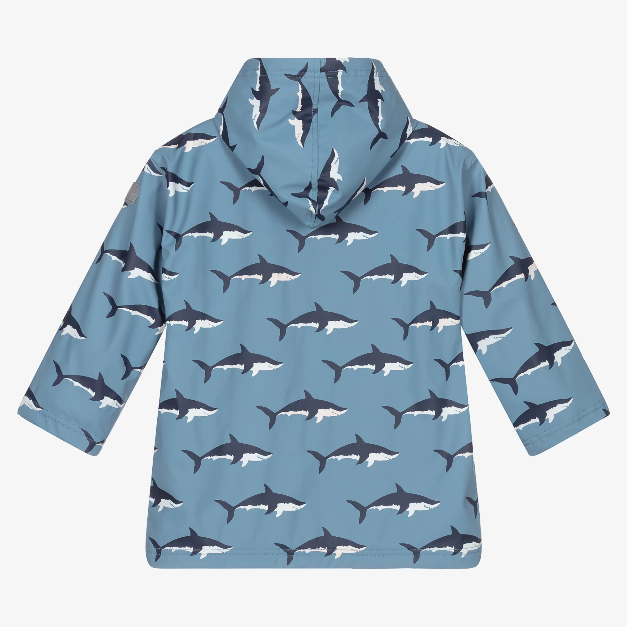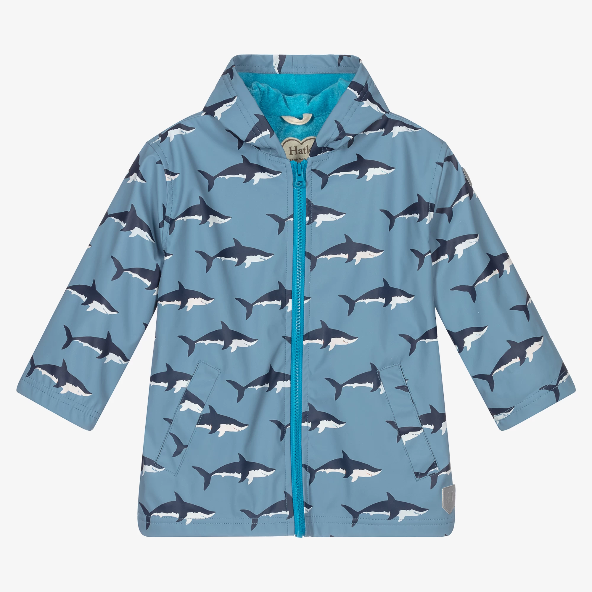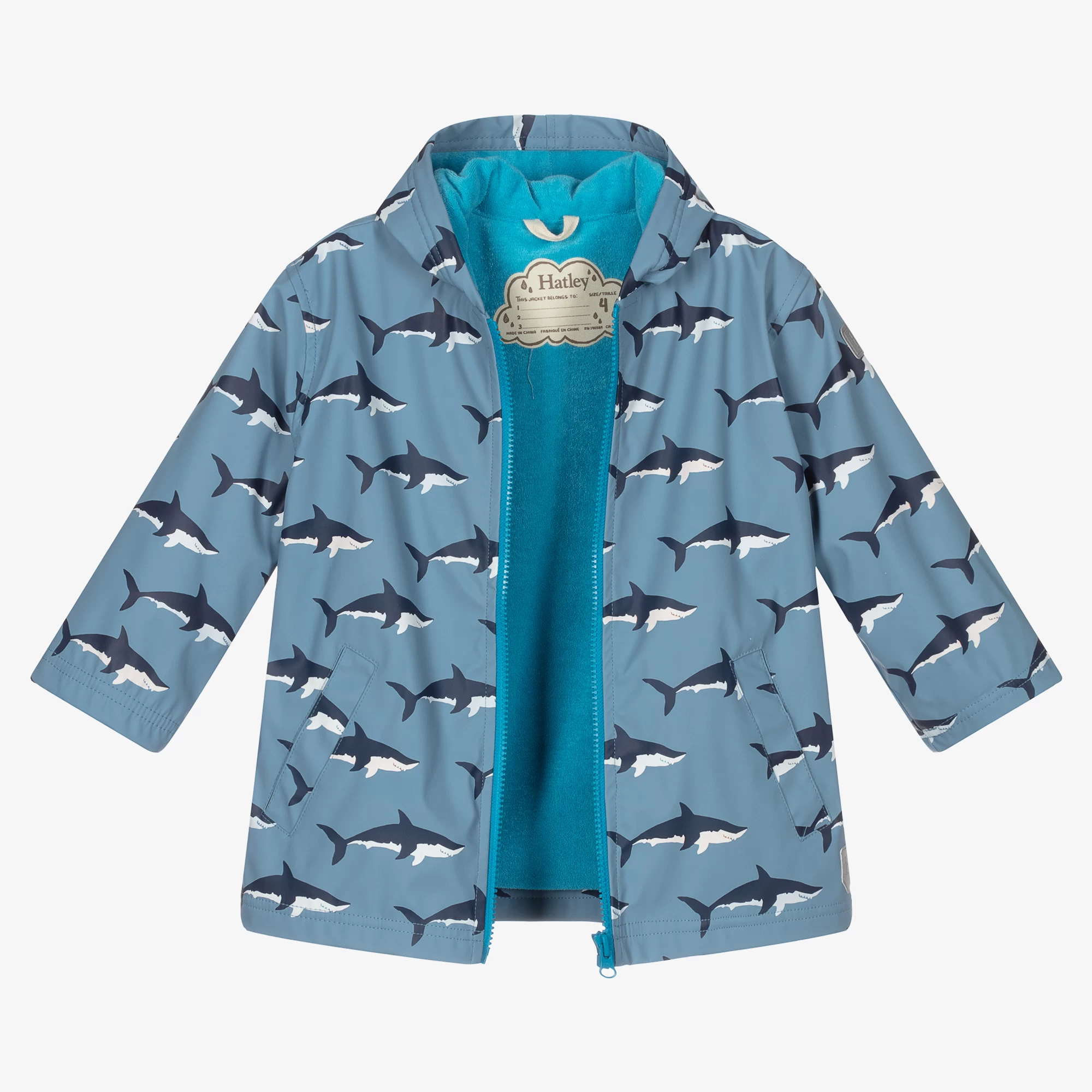 Blue waterproof hooded raincoat for boys by Hatley. It has a super soft PVC-free outer shell, patterned in a navy blue and white shark print which changes colour when wet. Lined in turquoise blue terry towelling, it fastens with a zip on the front and has reflective logo badges.