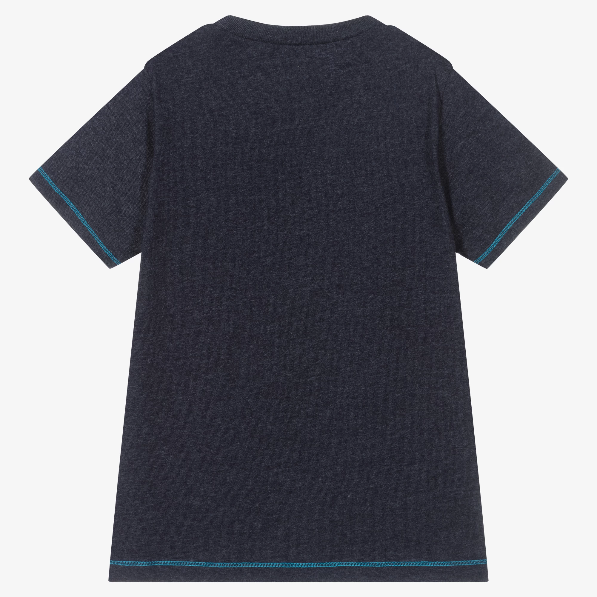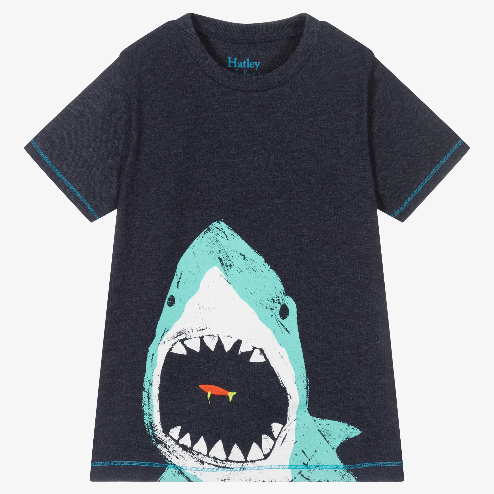 Navy blue marl T-shirt for little girls by Hatley, made in a soft cotton-blend jersey. It has a cool shark print on the front in aqua blue and white, with a small embroidered fish in orange and yellow.