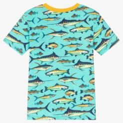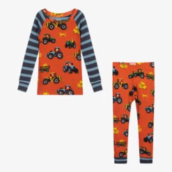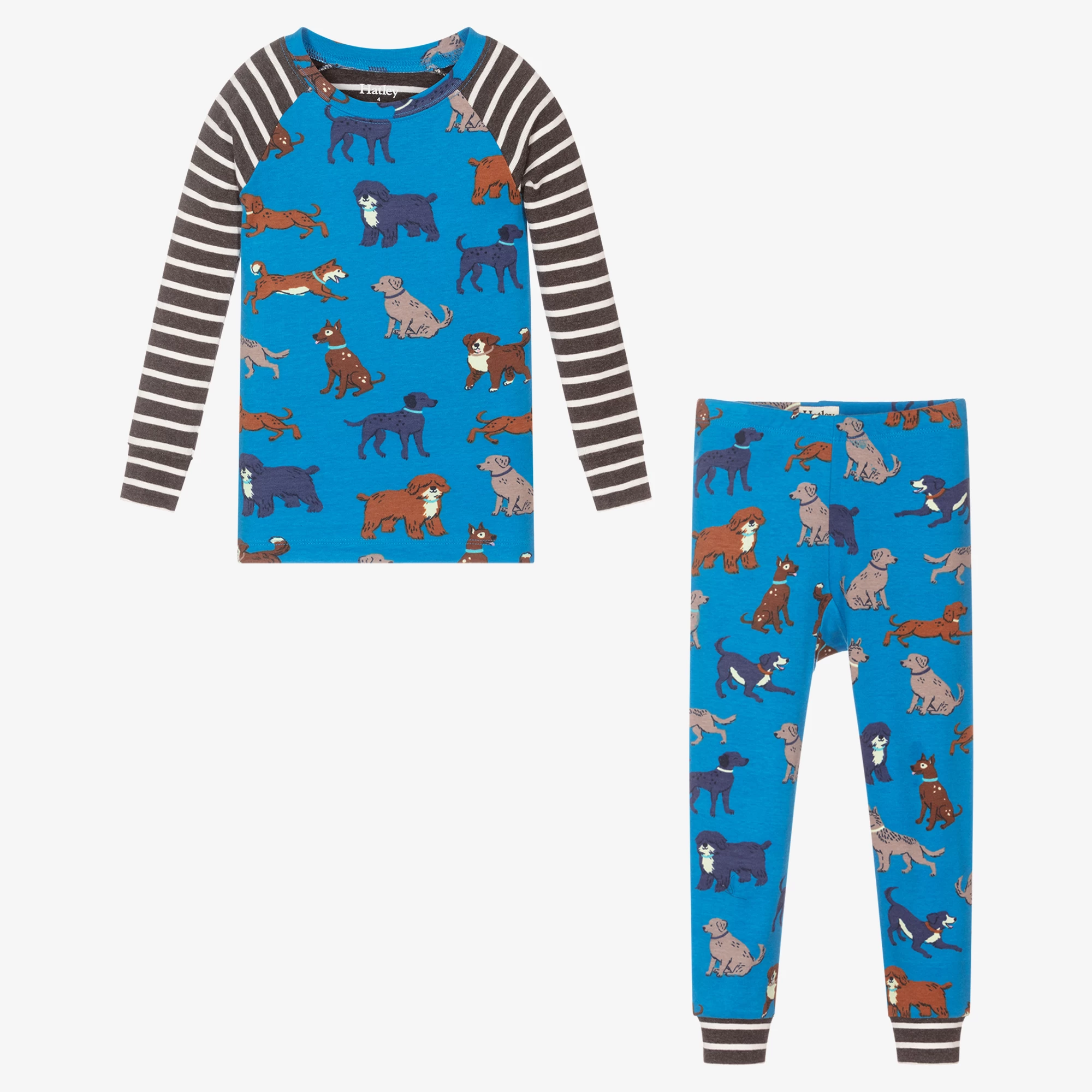 Blue pyjamas for boys by Hatley, made in soft organic cotton jersey. Designed to fit snugly, they have a cute puppies print, contrasting grey and ivory striped sleeves, and a navy blue embroidered logo on the back of the neckline.