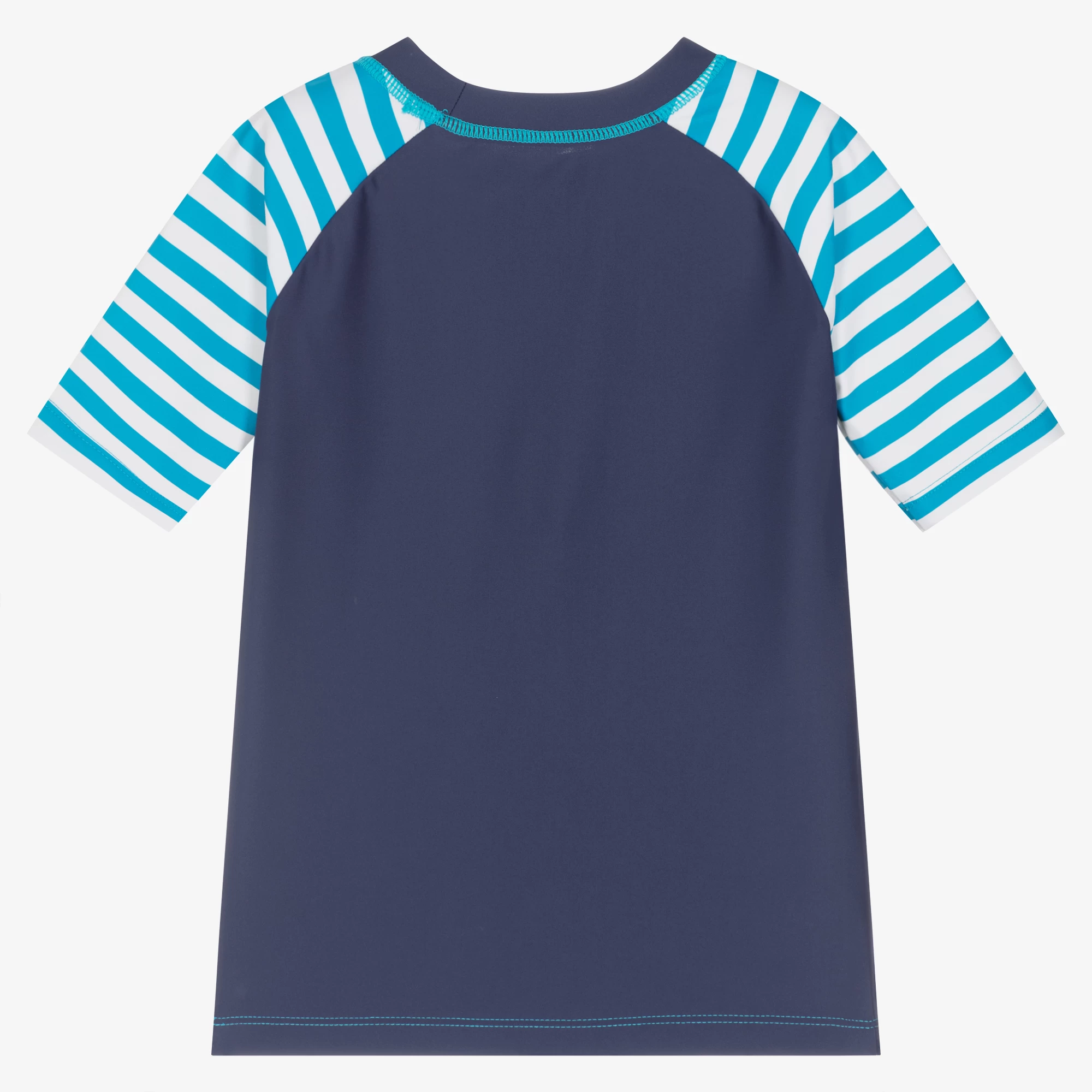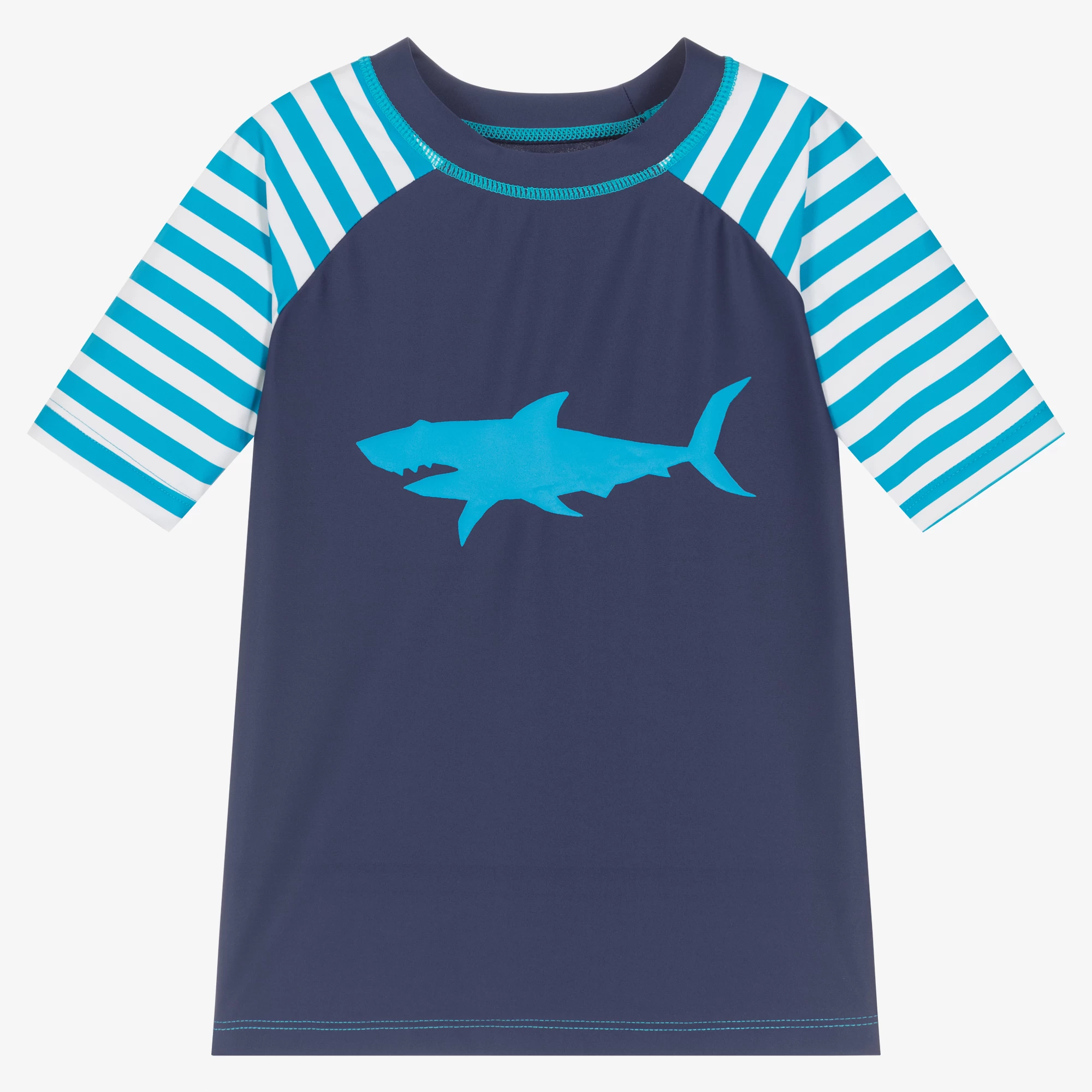 Navy blue UPF50+ swim top for boys by Canadian brand Hatley, with blue and white striped short sleeves. Silky smooth and stretchy, it is ideal for use on the beach, poolside and beyond. The cute blue shark print on the front adds a fun element to this rashguard.