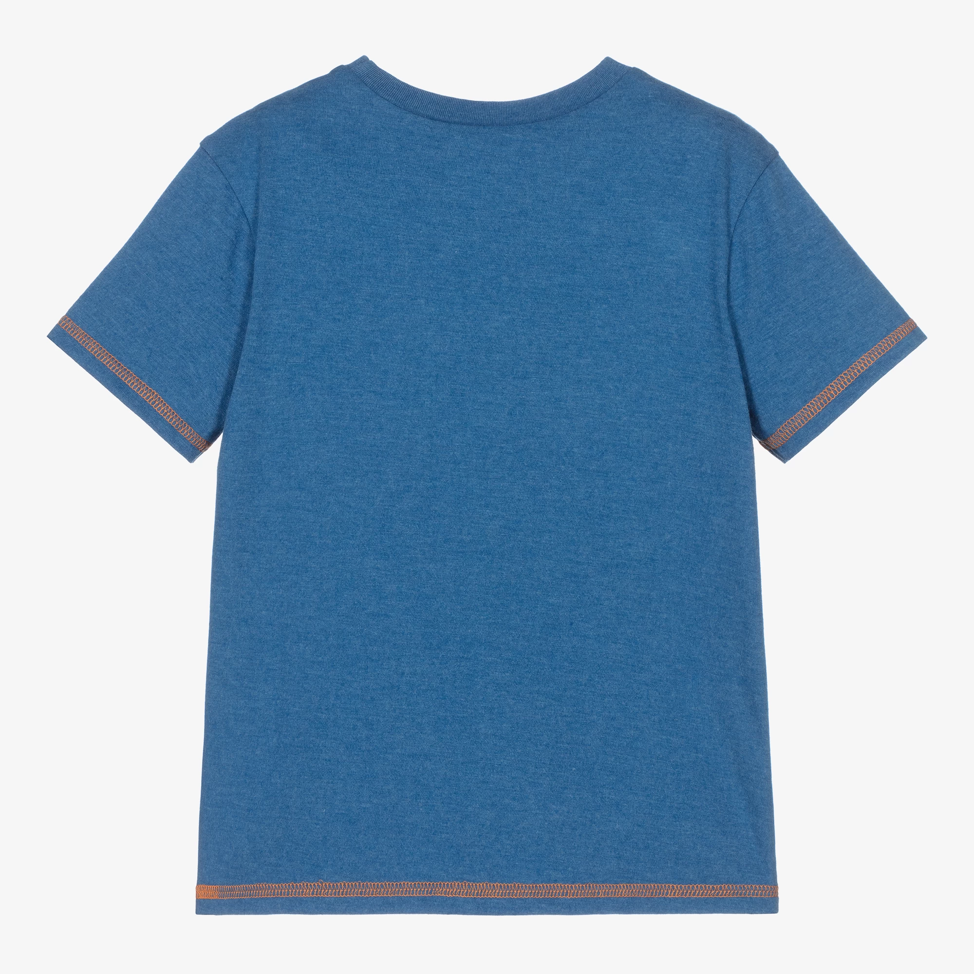 Boys blue marl T-shirt by Hatley, made in soft, stretchy cotton jersey. It has a fun ‘Glow in the Dark’ dinosaur print on the front, with a navy blue embroidered outline. There is orange top stitching on the seams.