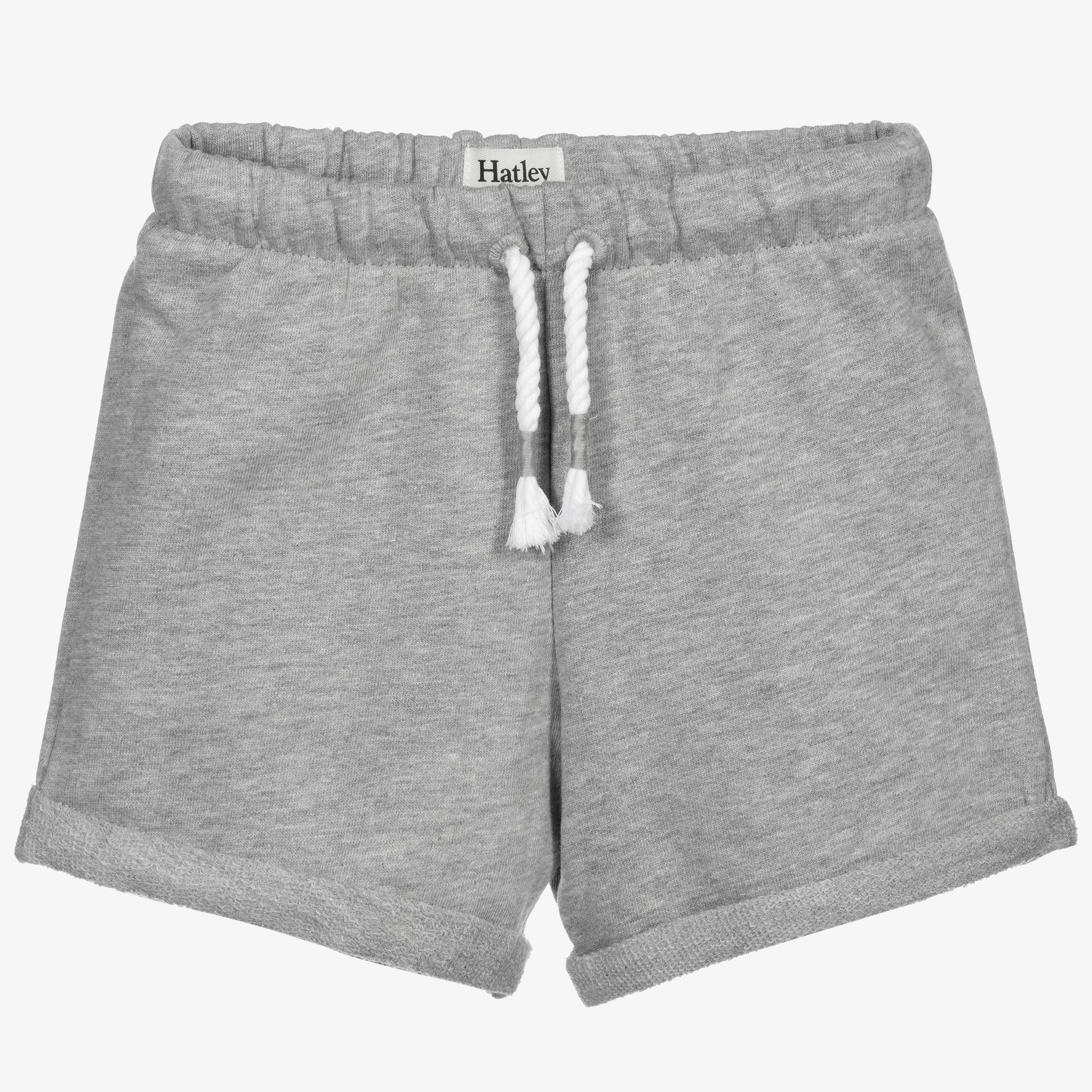Grey shorts for younger boys by Hatley, with a white rope style drawstring on the waist. Soft and stretchy, they are made from cotton sweatshirt jersey with rolled-up cuffs.