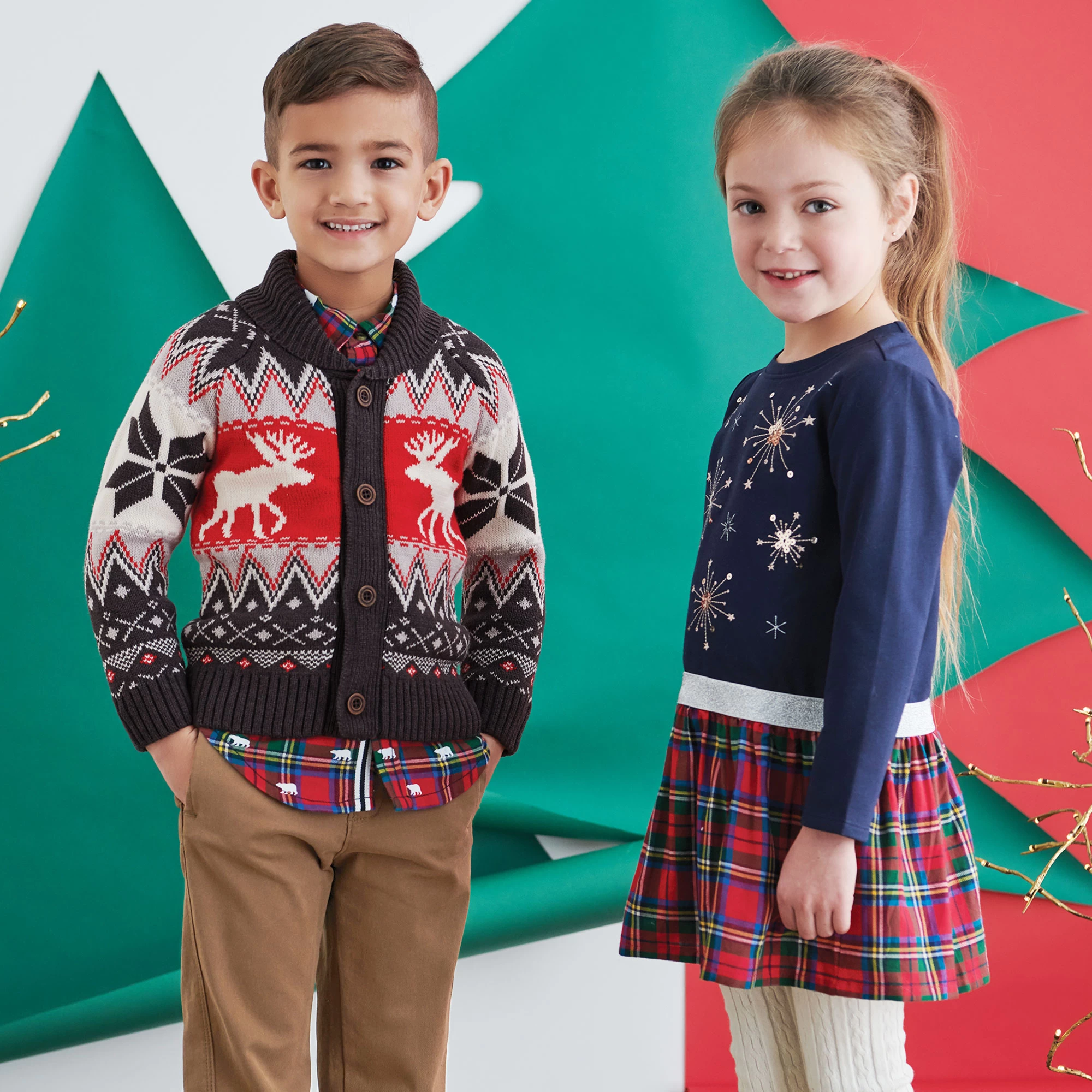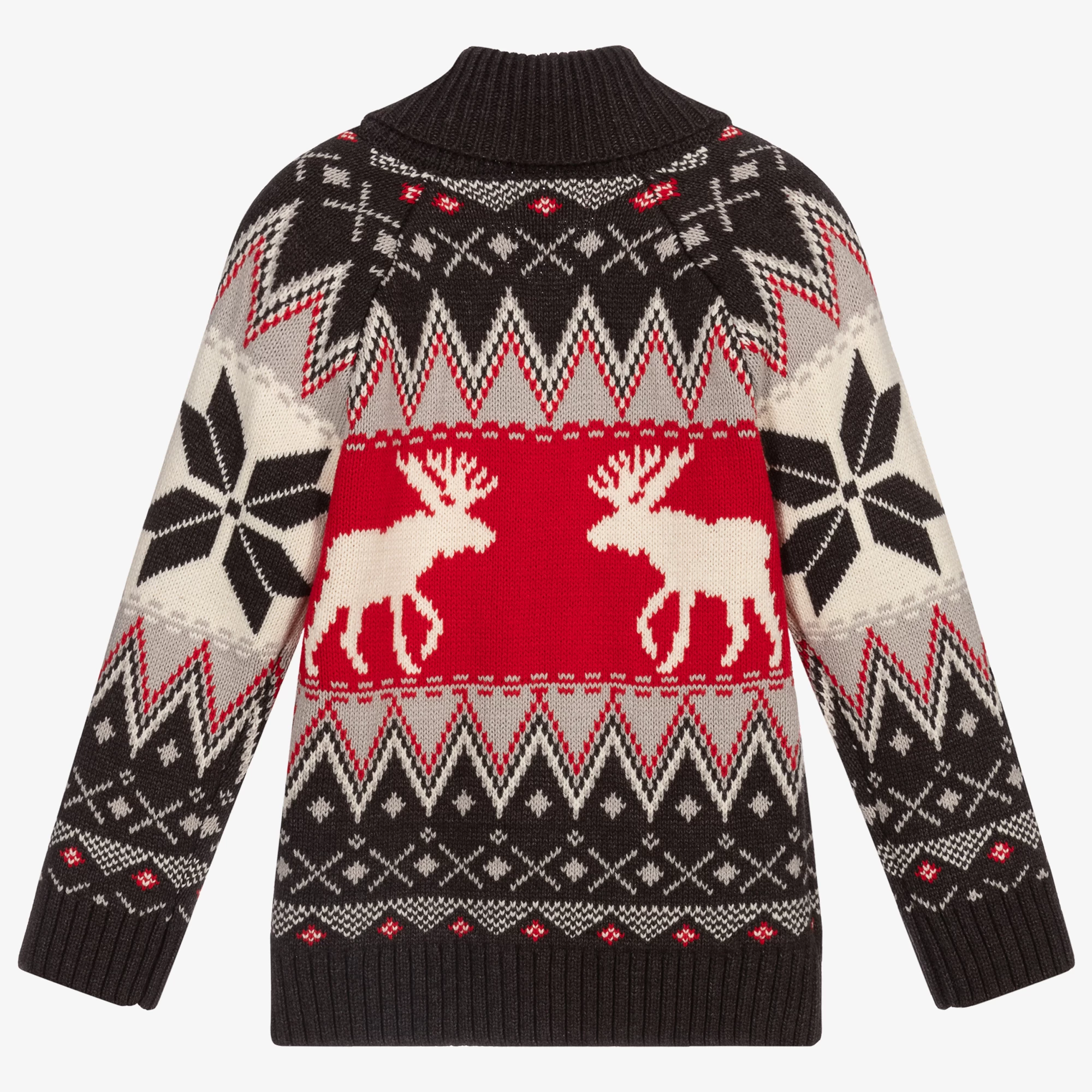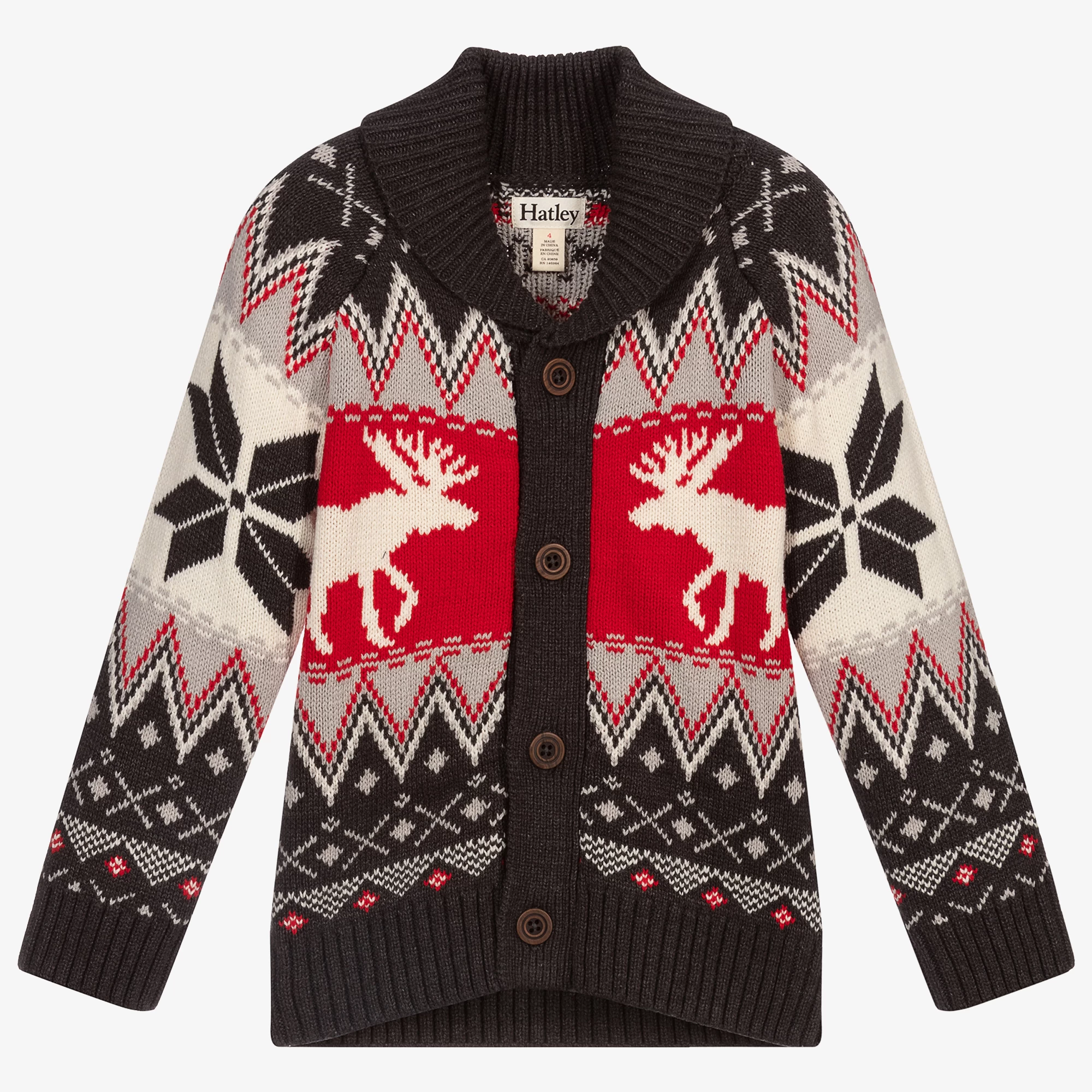 A charcoal grey, red and white Fair Isle cardigan for boys by Hatley. It has a shawl collar, a moose and snowflake design, and fastens with buttons on the front.