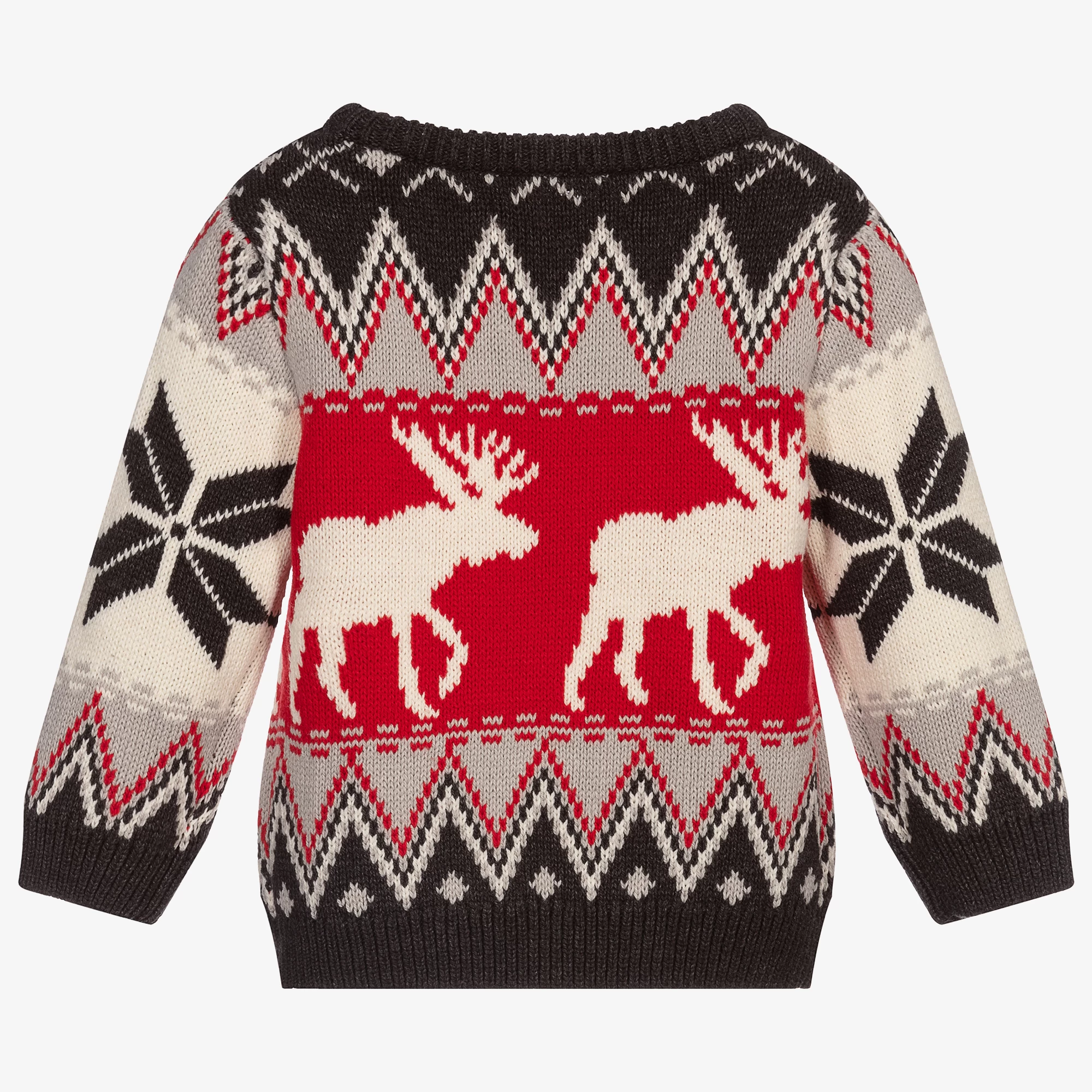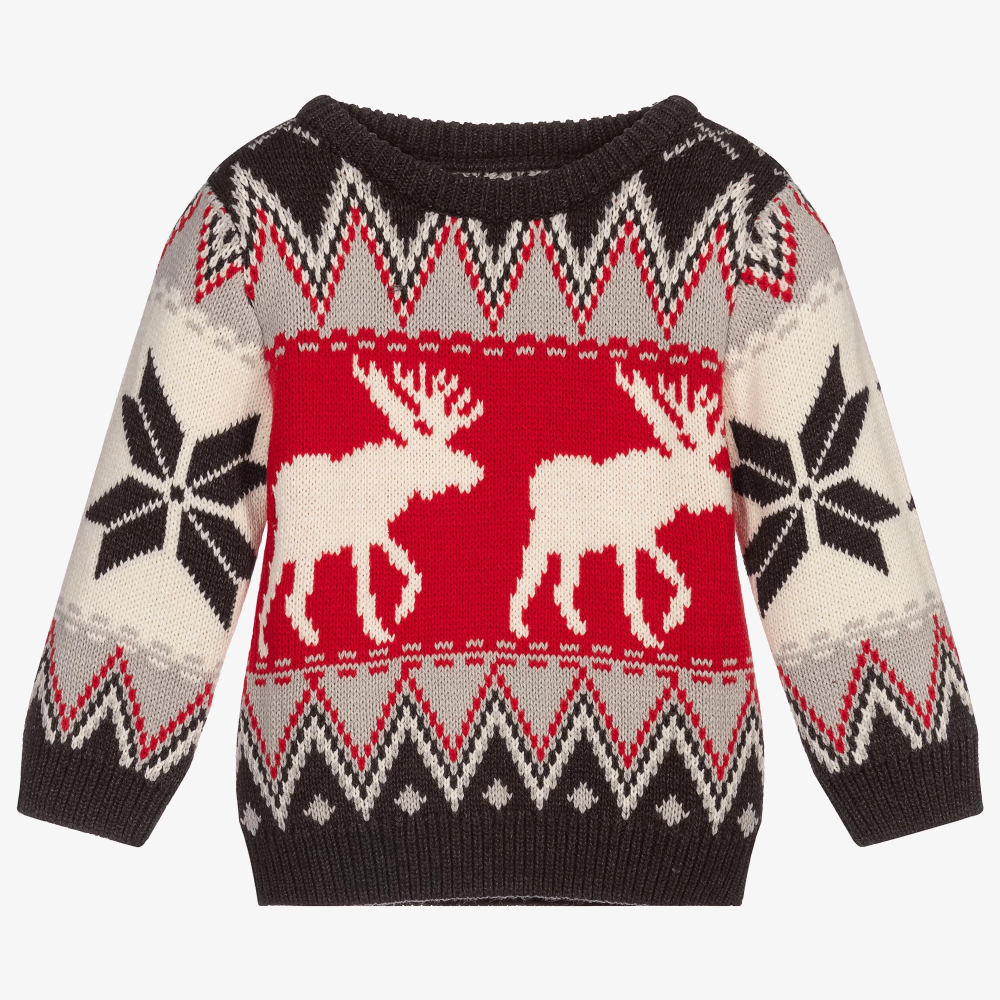 Little boys grey, red and white Fair Isle knit sweater by Hatley. It has a pattern that consists of snowflakes and moose, with charcoal grey trims.
