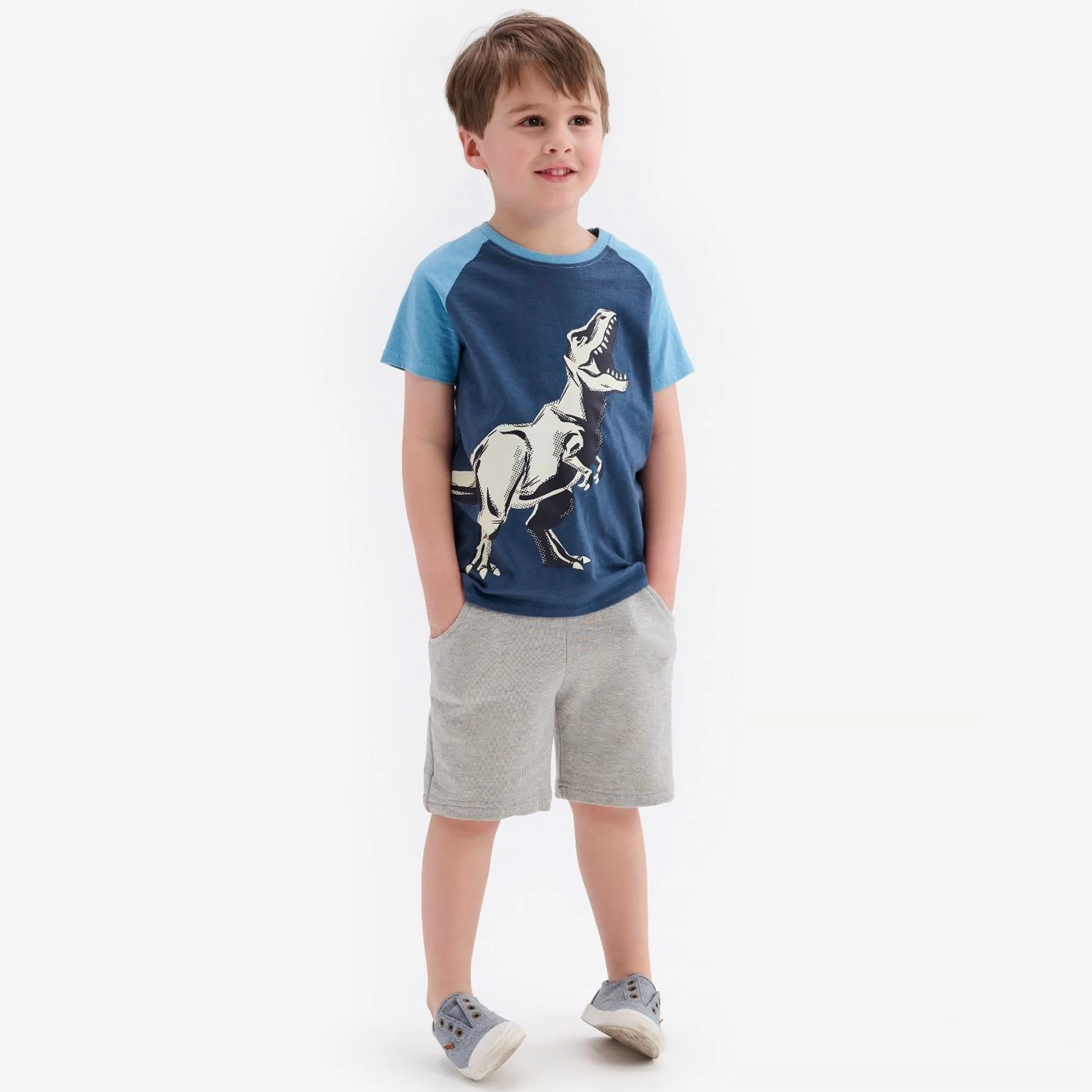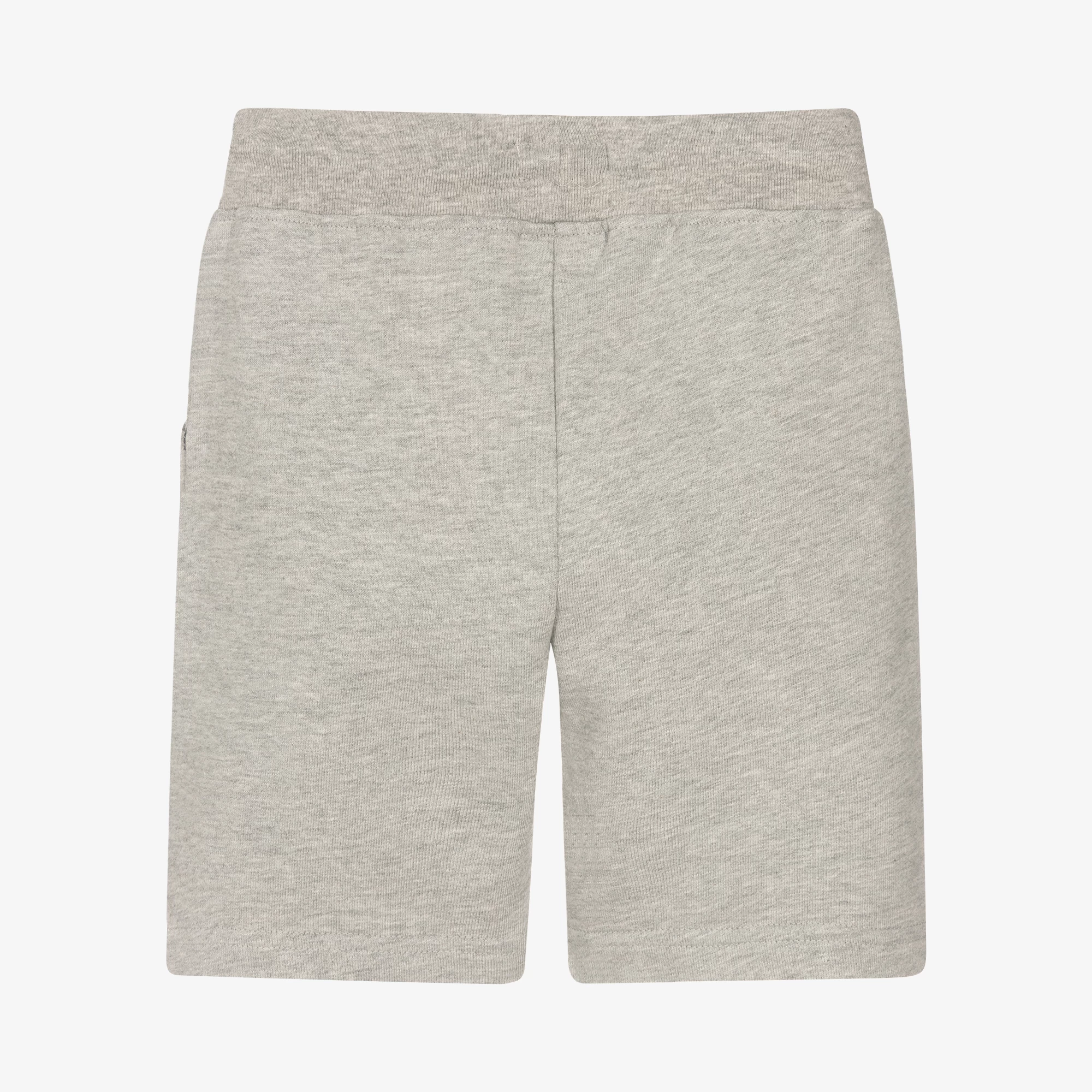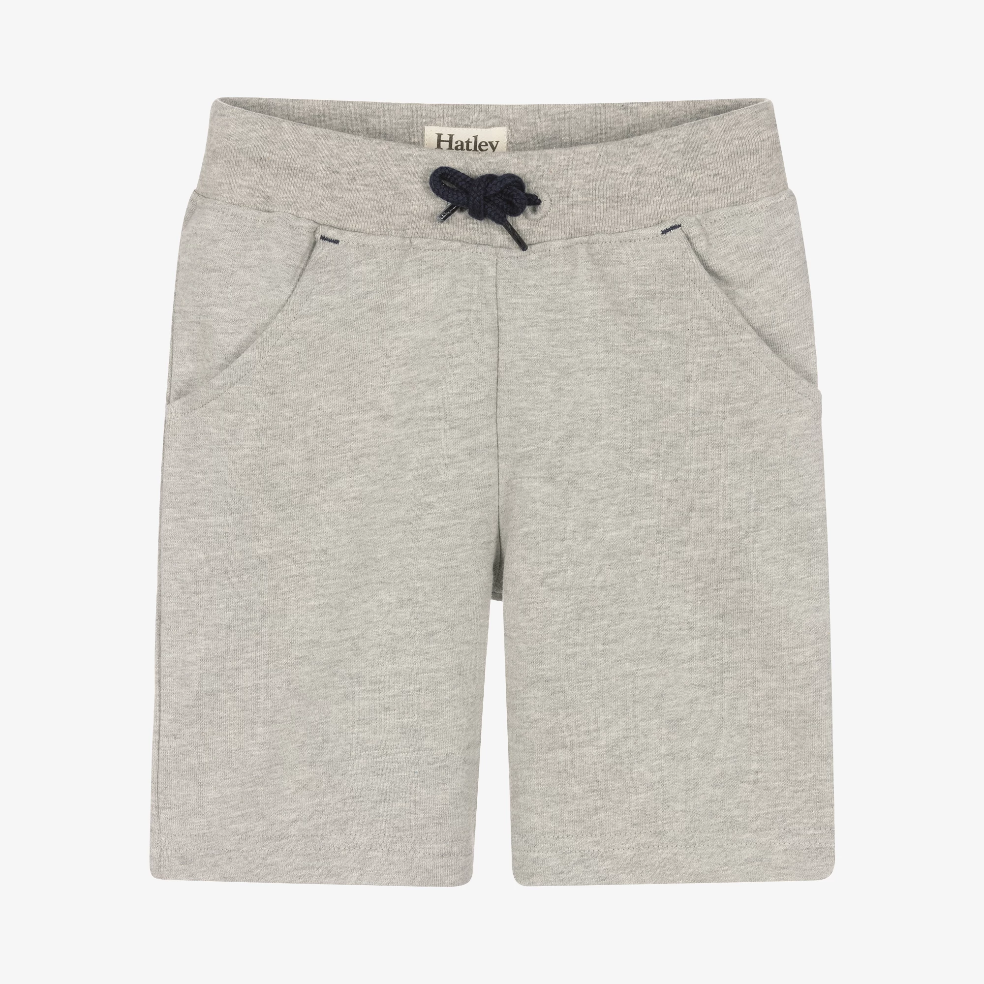 Versatile grey marl shorts for boys by Hatley, made in soft cotton jersey for lounging. They have useful slanted pockets and a navy blue drawstring waist, making them great for casual, laidback days.