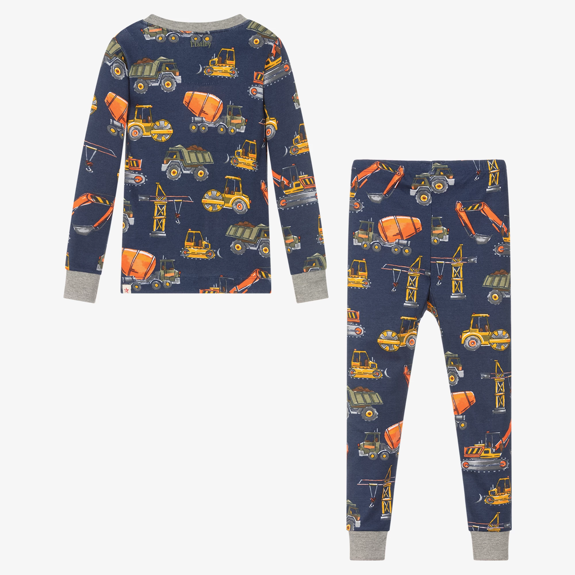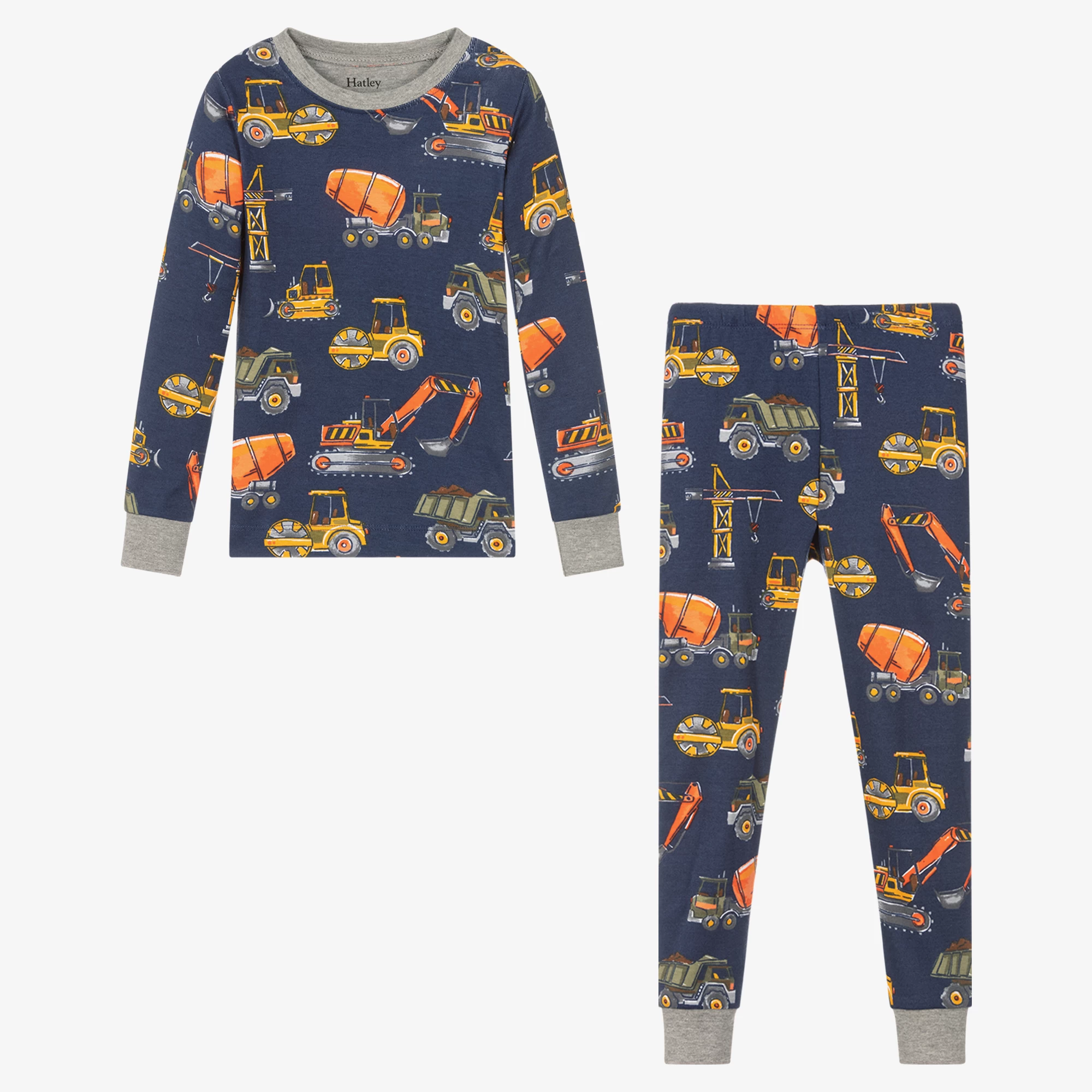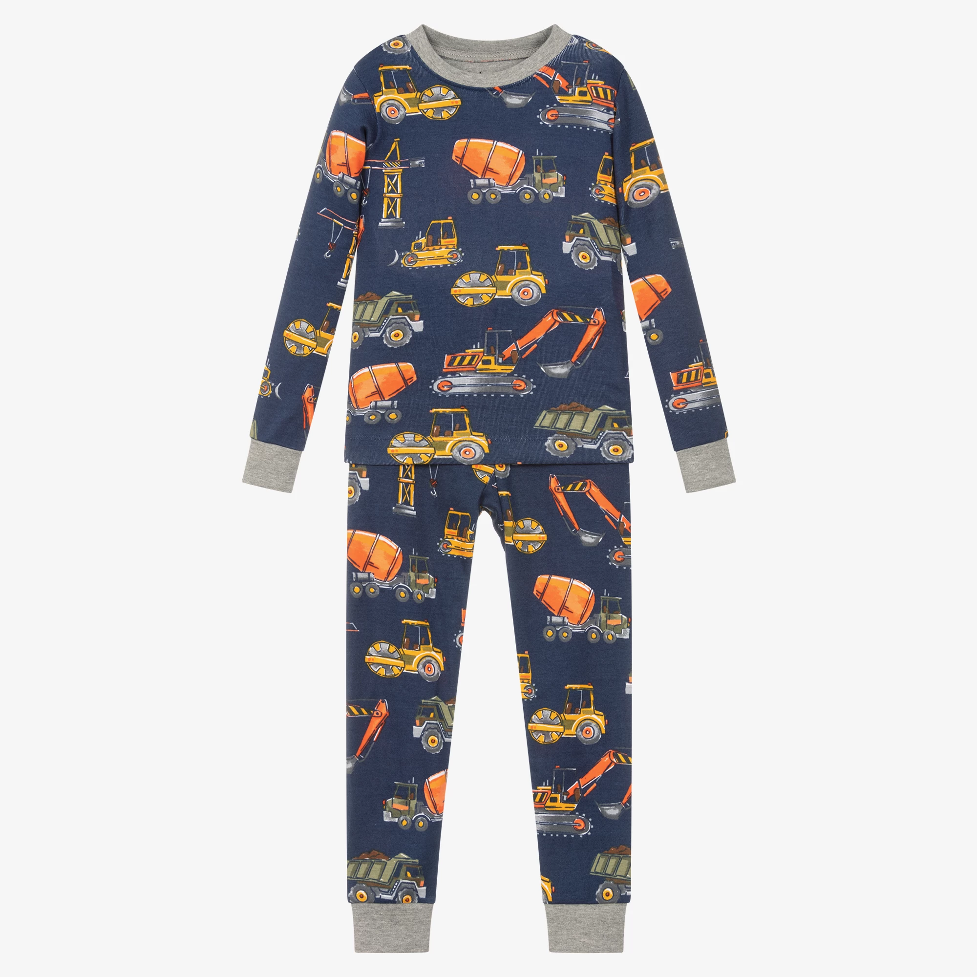 Designed to fit snugly are these boys navy blue pyjamas by Hatley, made in soft organic cotton jersey. Both pieces have ribbed grey trims and an all-over construction vehicle print, ideal for making bedtime cute and playful.