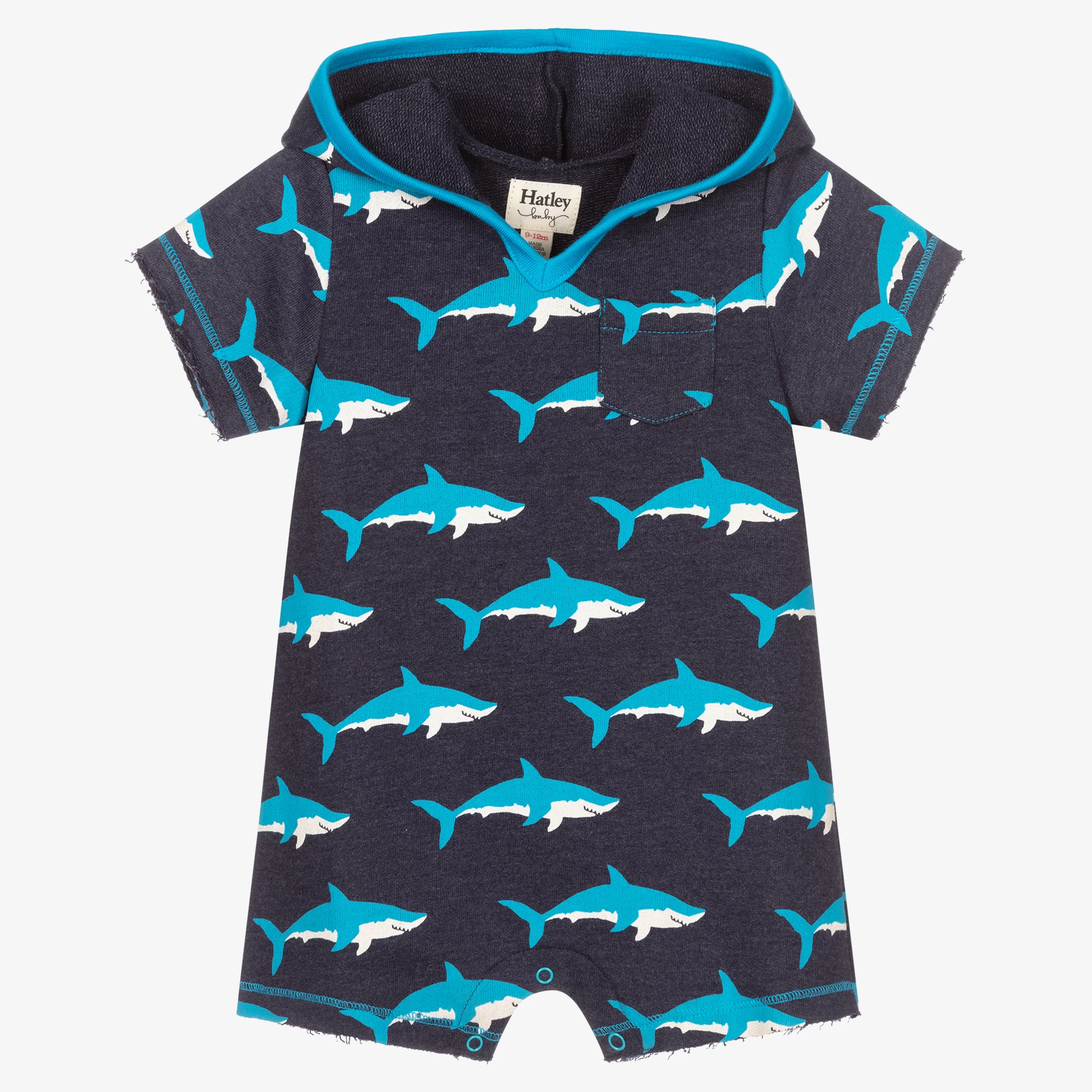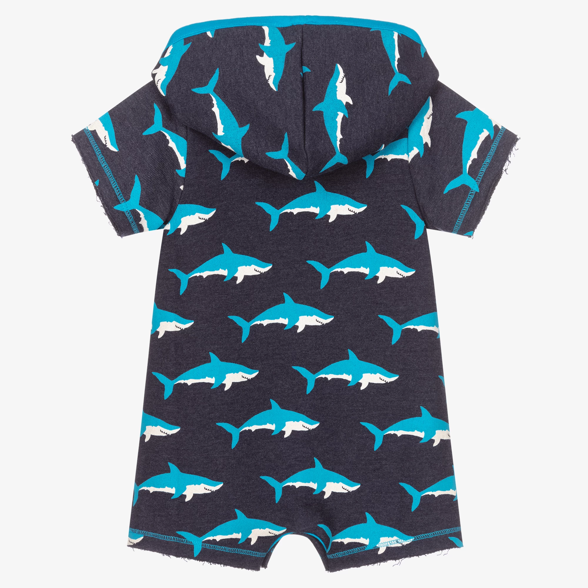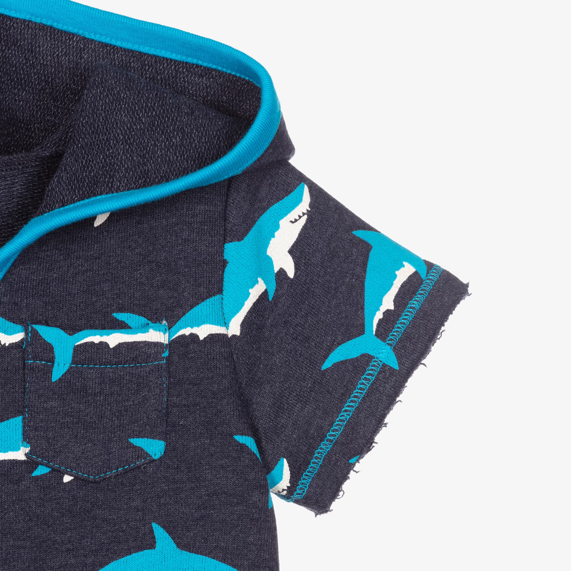 Baby boys navy blue hooded shortie by Hatley, made in soft, comfortable sweatshirt jersey. It has fun shark print in turquoise blue and white with matching blue trim. There are raw edges and popper fastenings between the legs.