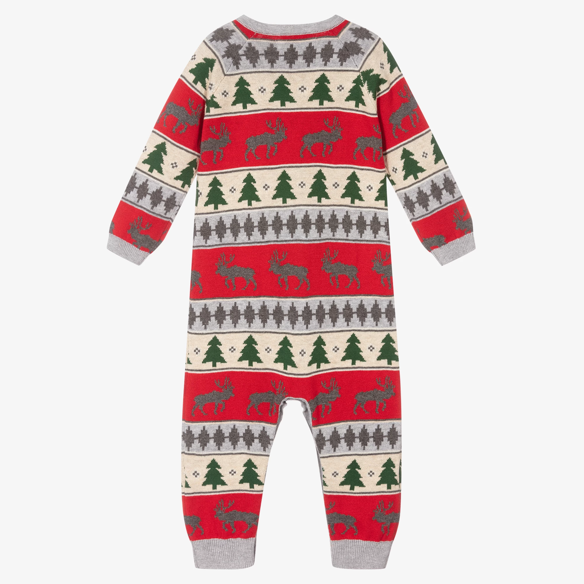 Red, grey, and ivory striped romper for baby boys by Hatley, knitted from soft cotton. Fastening with buttons on the shoulders and poppers between the legs, this cute babysuit has a festive Fair Isle pattern with Christmas trees and elks.