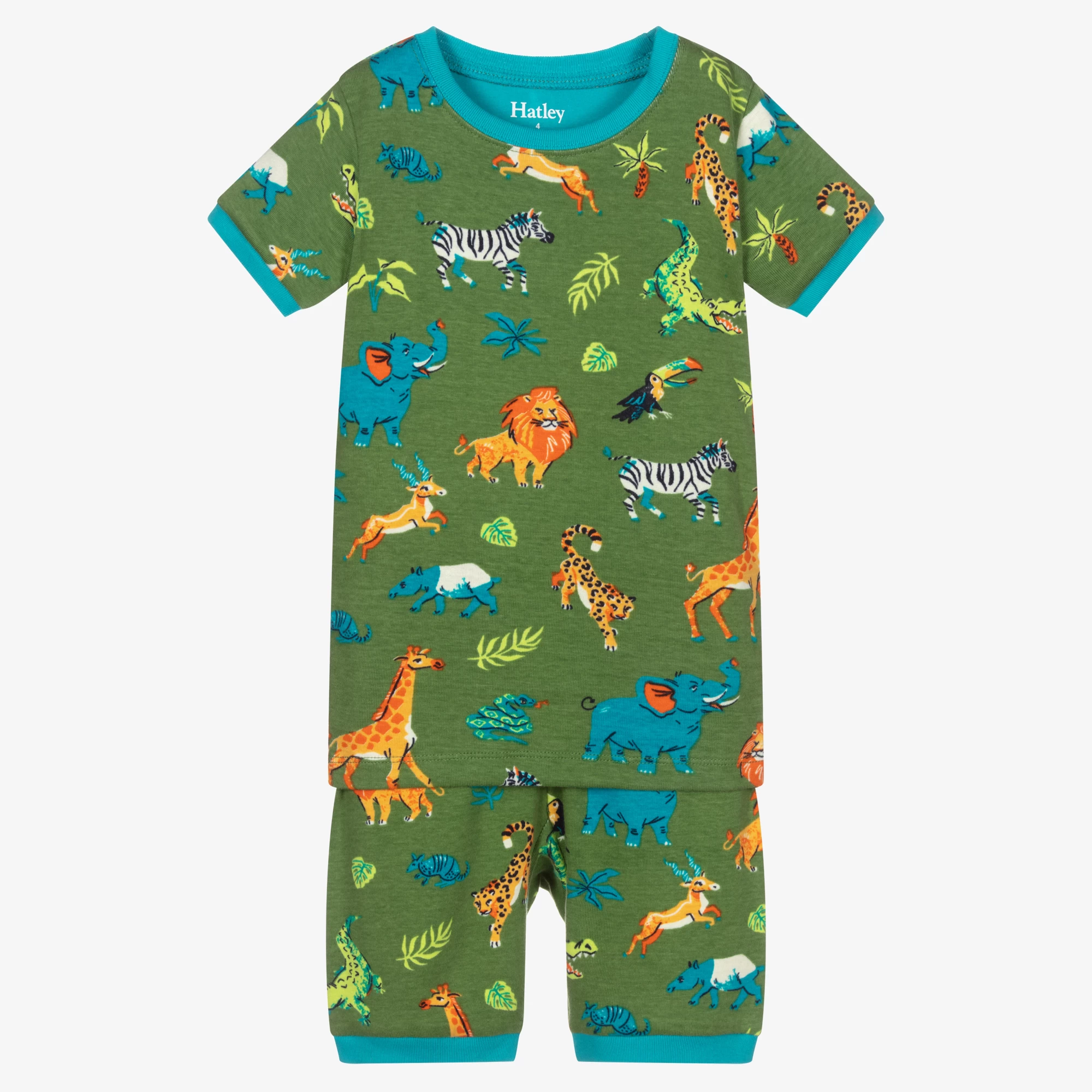 Boys short, snug fitting khaki green pyjamas by Hatley. Made in soft, stretchy organic cotton jersey, they have turquoise blue ribbed trims, with a colourful jungle animal print and a blue embroidered logo on the back of the top.