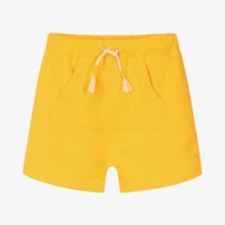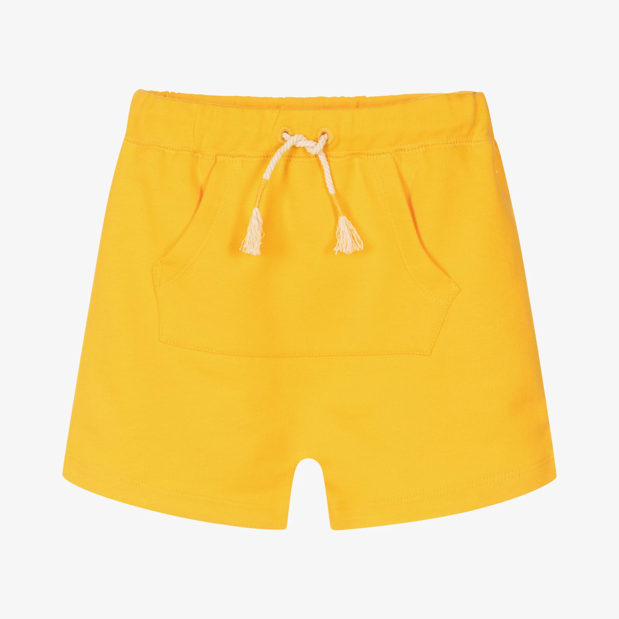 Bright yellow shorts for little boys by Hatley, lovely for everyday casual wear. Made in soft cotton jersey, it has a cute front pouch pocket and rope drawstring waist for comfort.