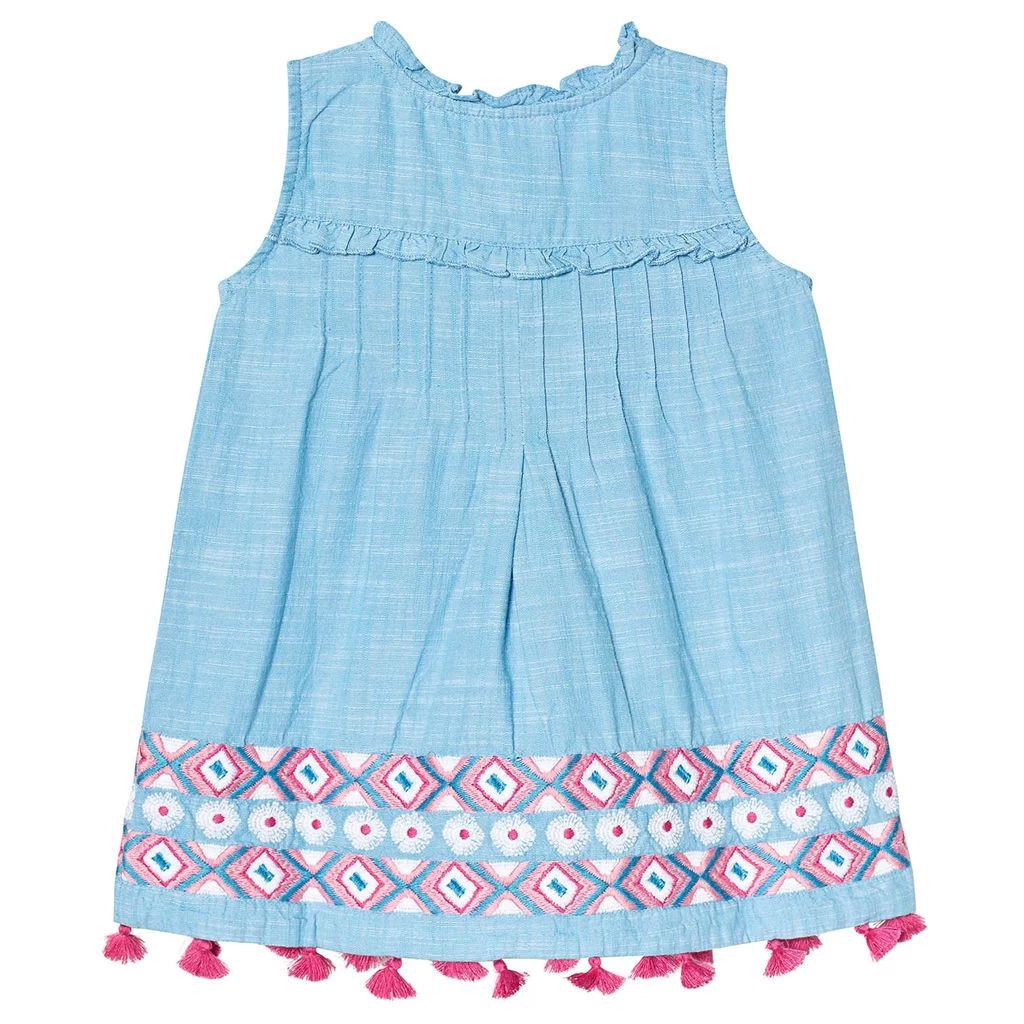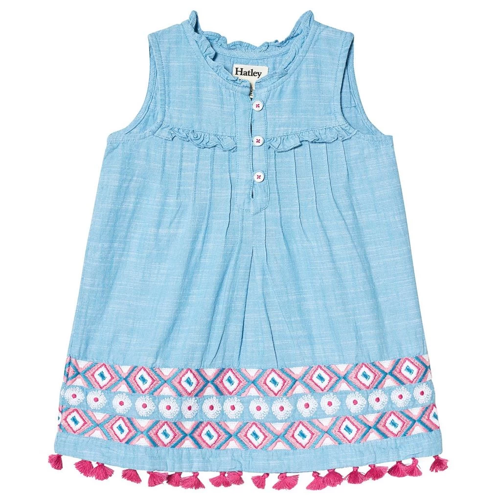 Blue Chambray Floral Pin Tuck dress by Hatley. The dress has an A-line silhouette. It has ruffle detailing and an embroidered hem with a tassel.