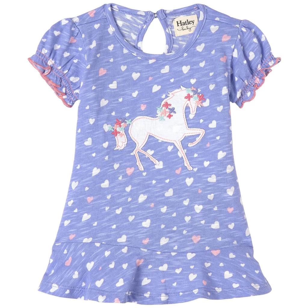 Purple Fancy Unicorn Flounce dress by Hatley. The dress has an all-over print. It has a button closure at the back, puff sleeves and a flounce hem.
