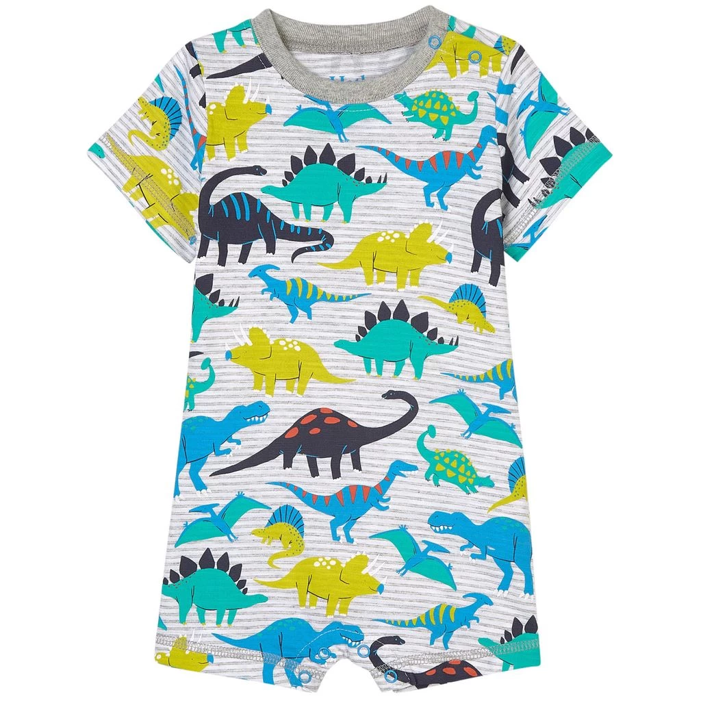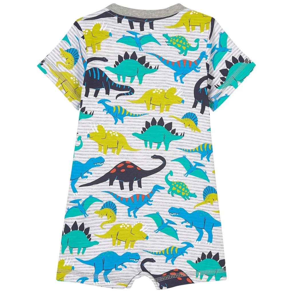 Grey Friendly Dino romper by Hatley. The romper has an all-over print. It has a snap button closure at the shoulder and between the legs.