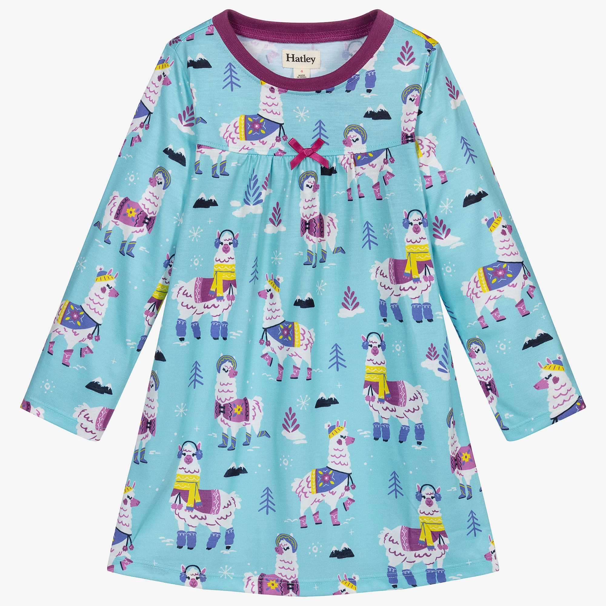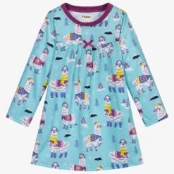 Blue jersey nightdress for girls by Hatley, with a cute white, blue, yellow and purple alpaca print. It has a purple neck trim and a decorative purple bow on the front.