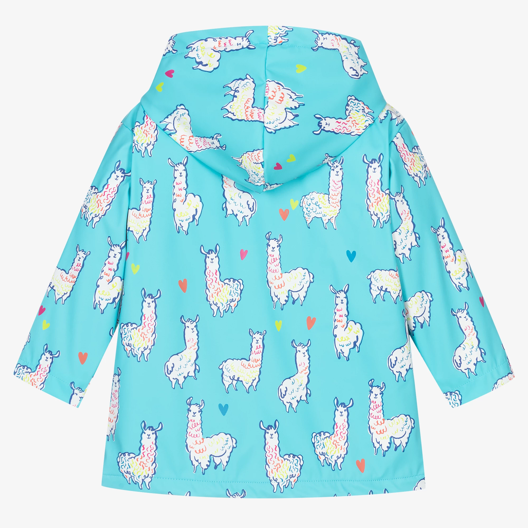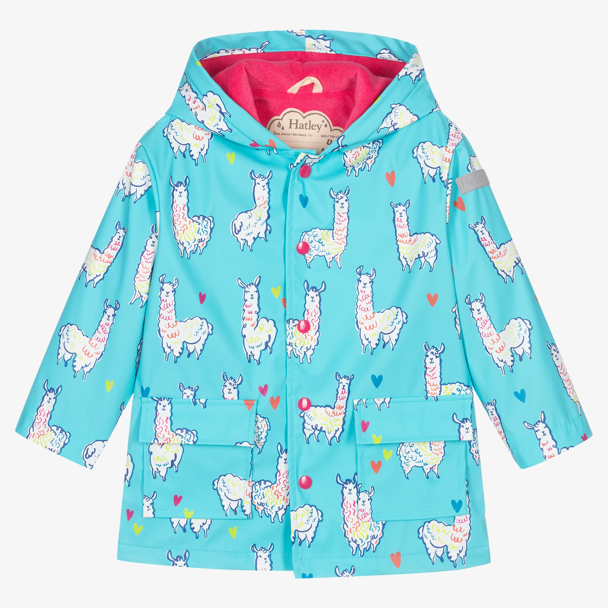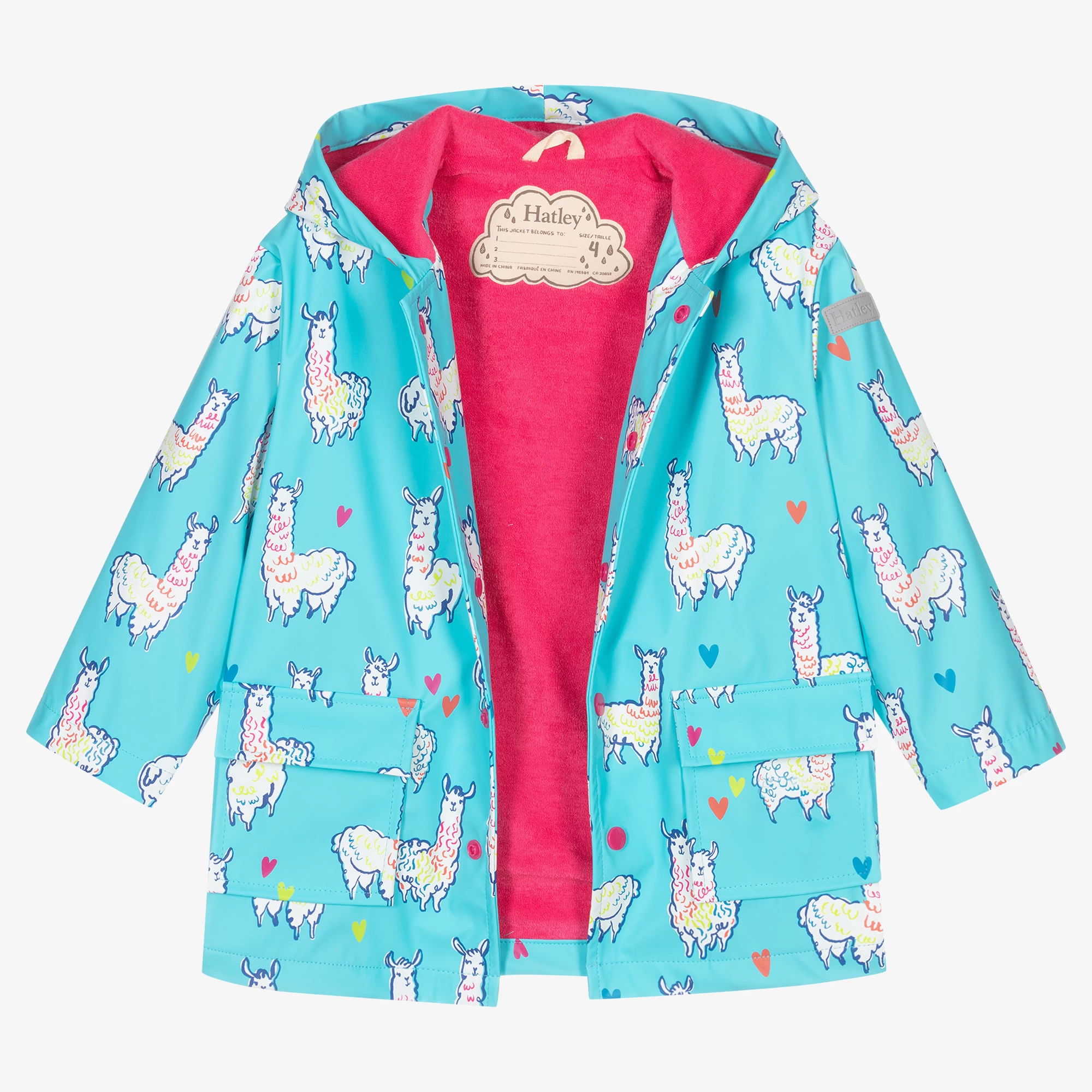 Fun waterproof raincoat for girls by Hatley, with a fixed hood. Made in turquoise blue polyurethane-coated polyester, it is patterned with white, pink and green alpacas and fastens with pink poppers. There is a reflective logo badge on one sleeve and it has a lightweight pink towelling lining.