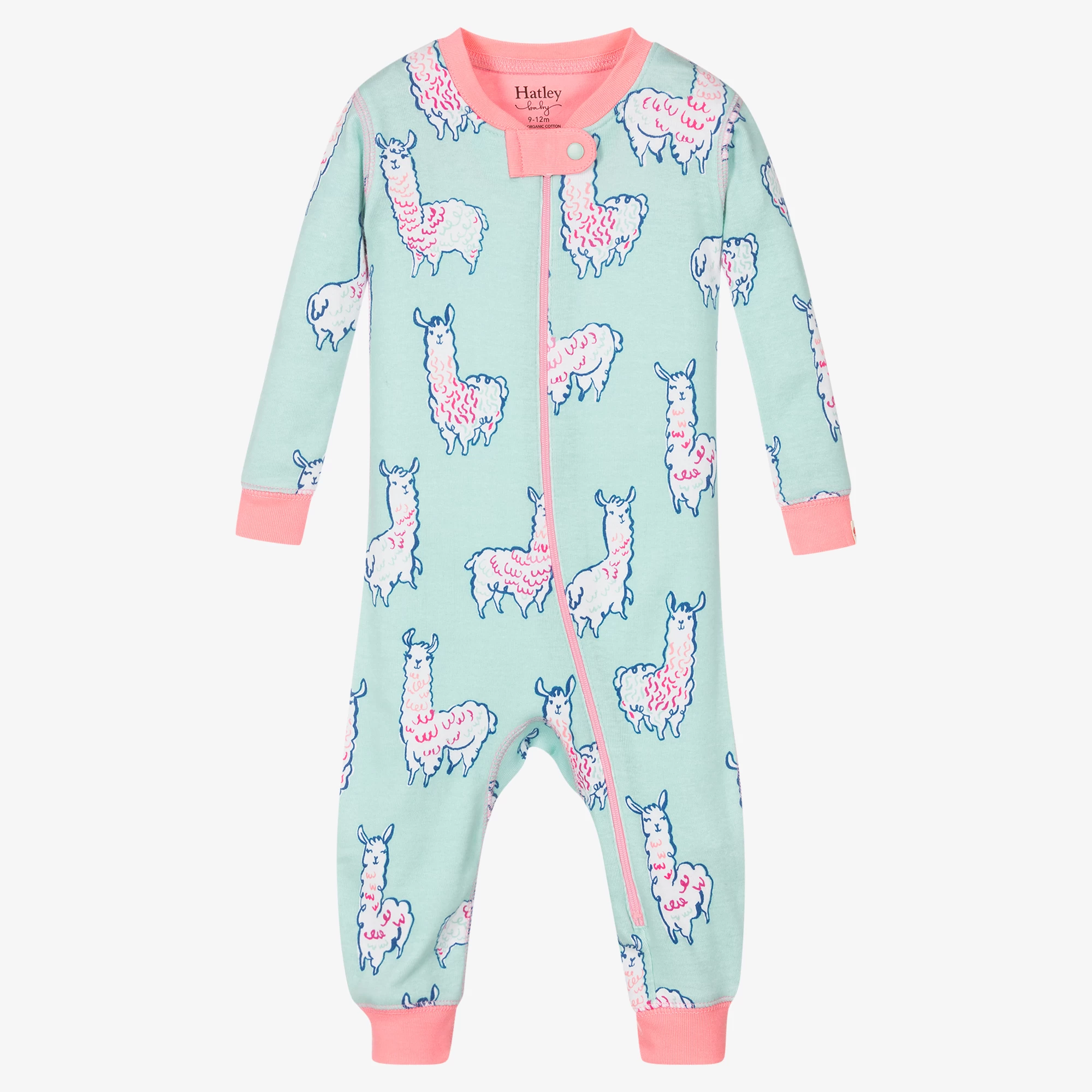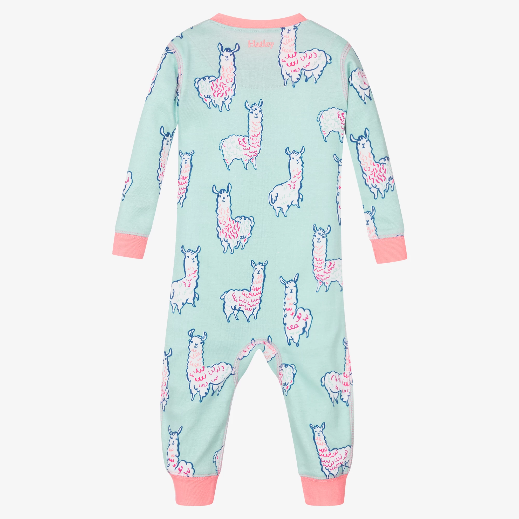 Aqua blue romper for girls by Hatley, made in soft organic cotton jersey. It has an all-over alpaca print, with pink ribbed trims. It fastens with a zip on the front and has a popper fastening neckline.