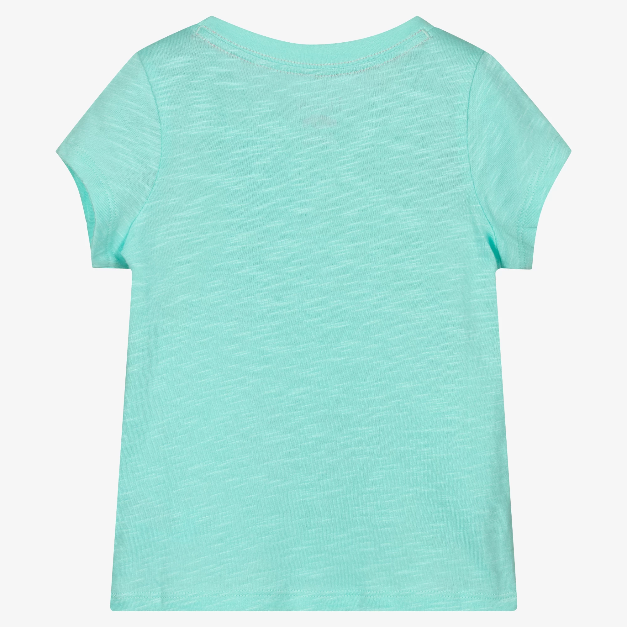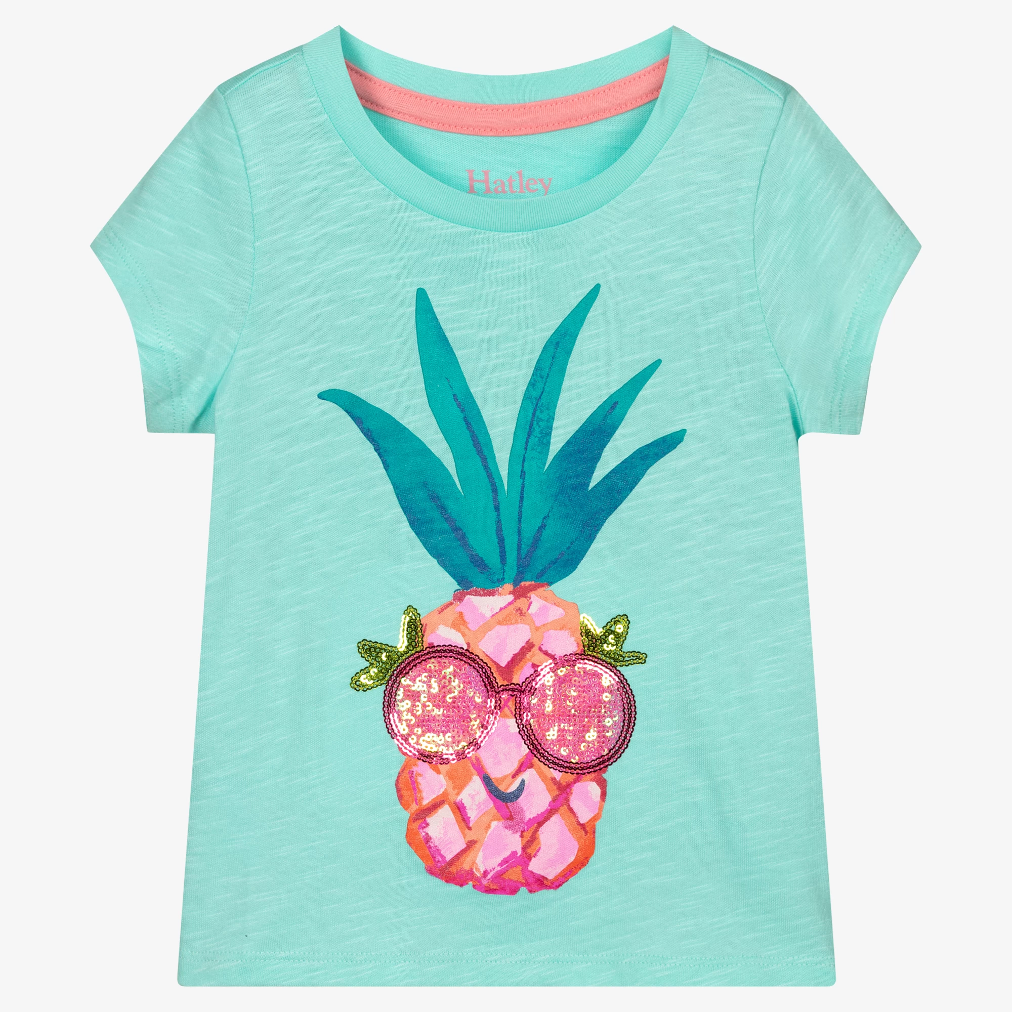 Aqua blue T-shirt for girls by Hatley, made in soft cotton jersey. It has a fun pineapple print on the front, with sequinned eye glasses in pink and green.