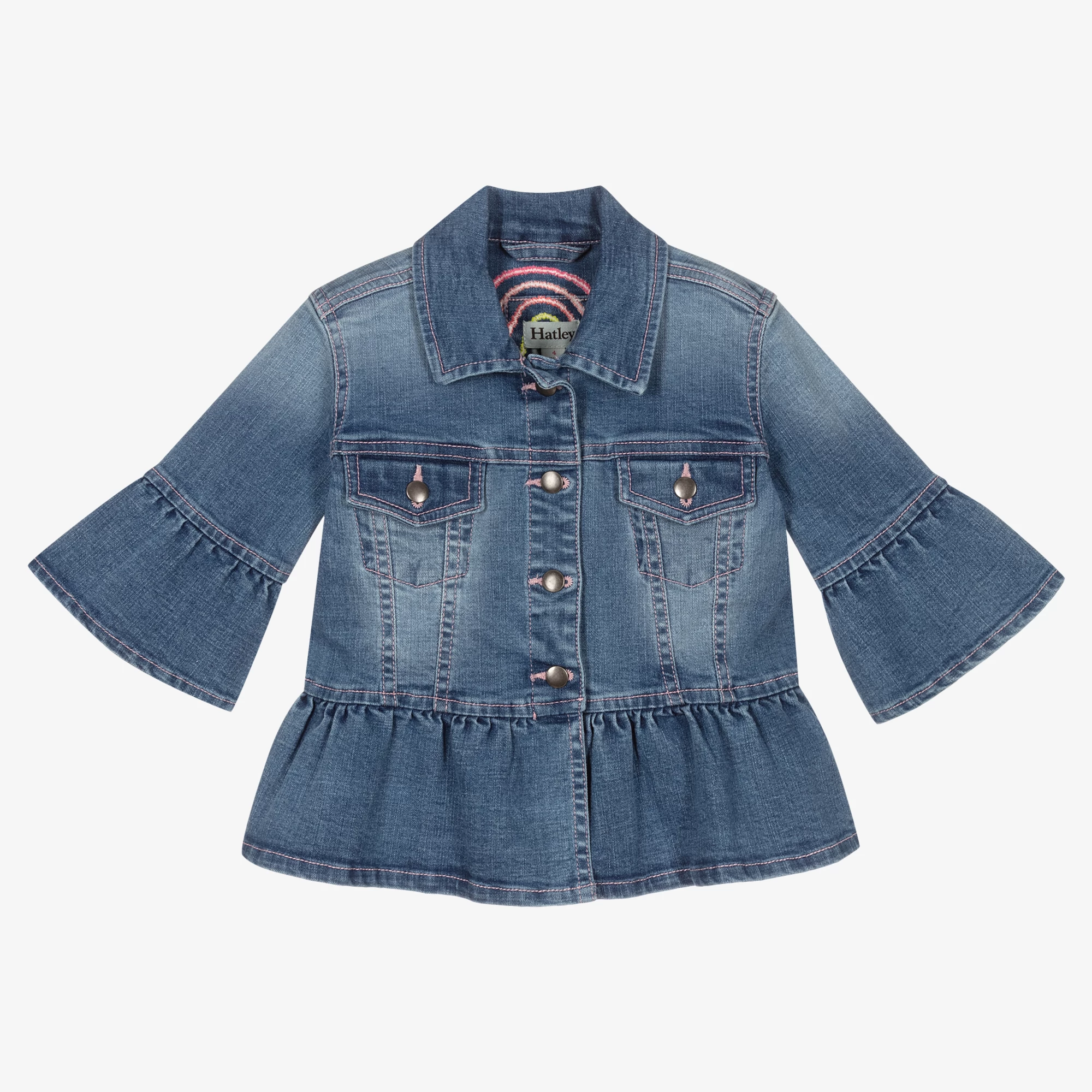Blue denim jacket for girls by Hatley, with a washed and faded look. It has a pretty ruffled hem and cuffs, with popper fastenings on the front. The back has a fun and colourful embroidered design that includes a rainbow, cloud and sunshine.