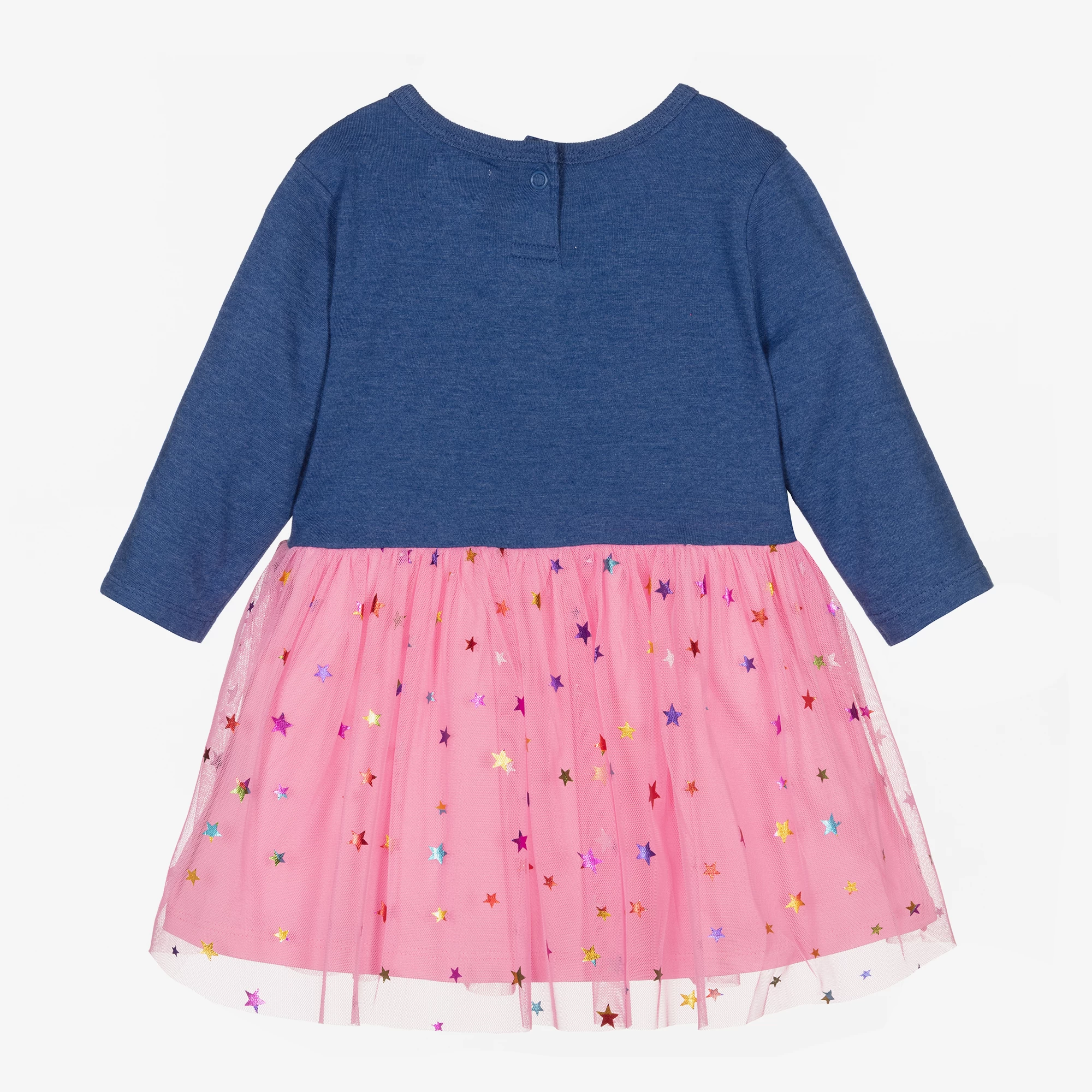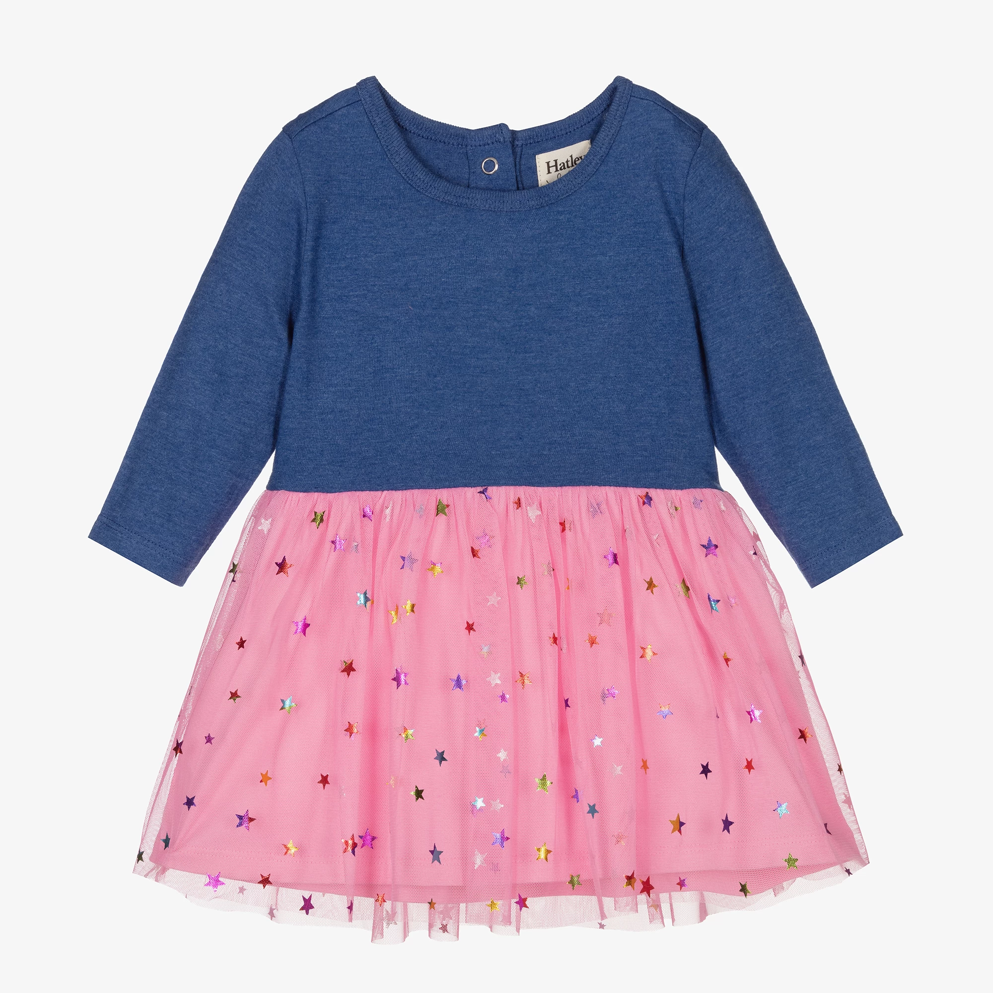 Blue and pink dress for little girls by Hatley, made in soft jersey with a tulle overlay. The bodice is blue jersey and the skirt is printed with rainbow foils stars. The skirt lining is made of soft and stretchy jersey.