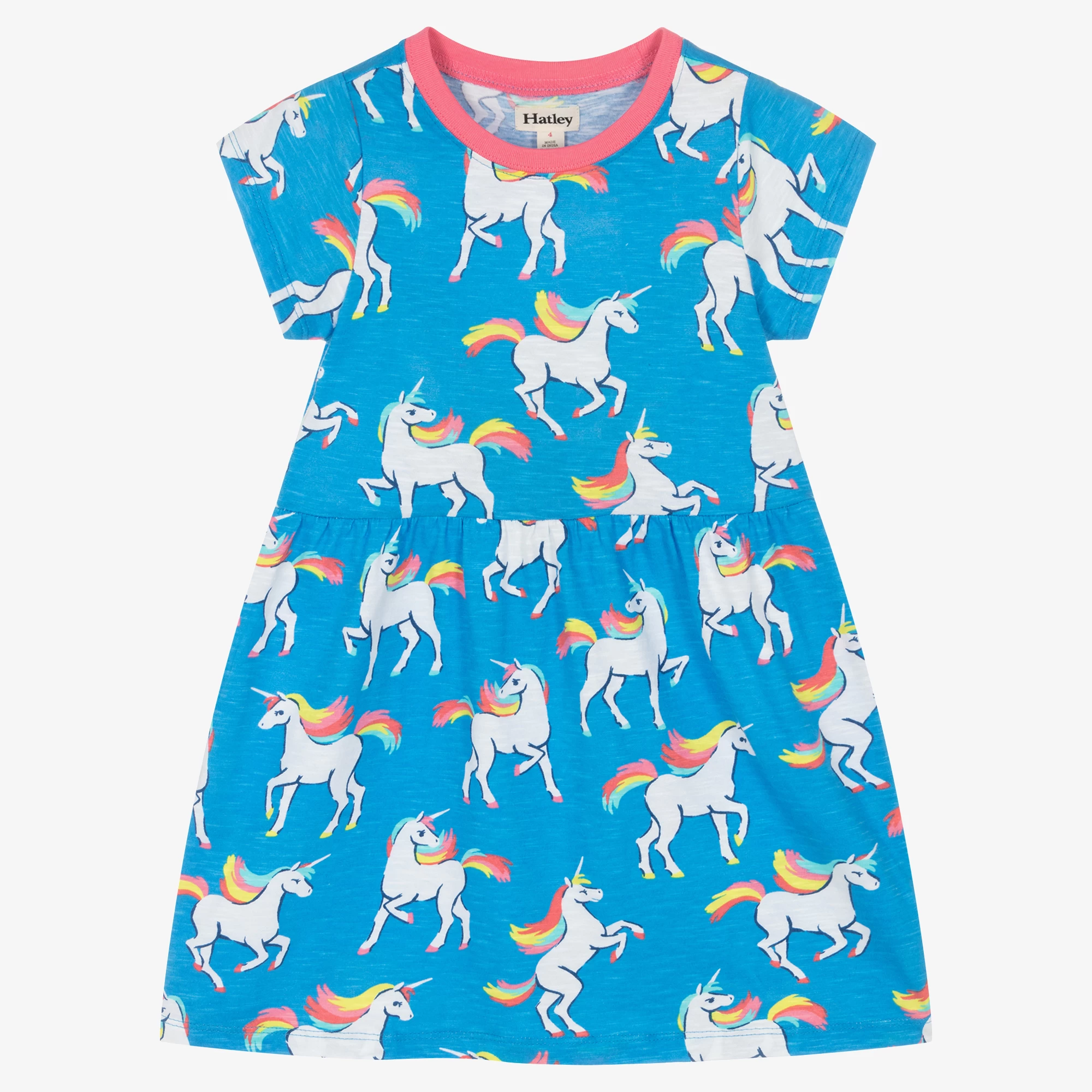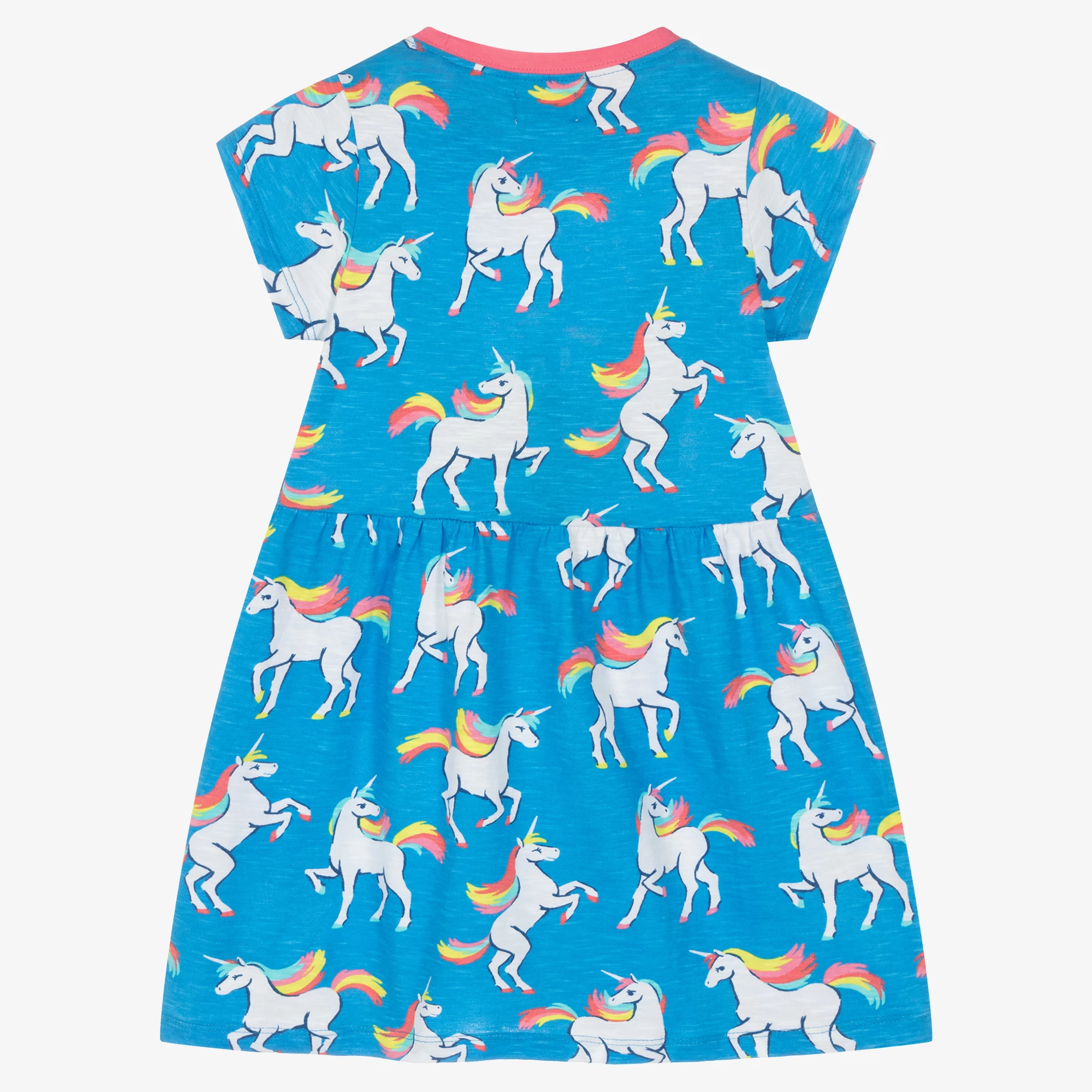 Soft and comfortable dress for girls by Hatley, made in stretchy slub cotton jersey. The blue fabric has a lovely all-over dancing unicorn print and a gently gathered waist. The crew neckline is ribbed and pink for a pretty contrast.