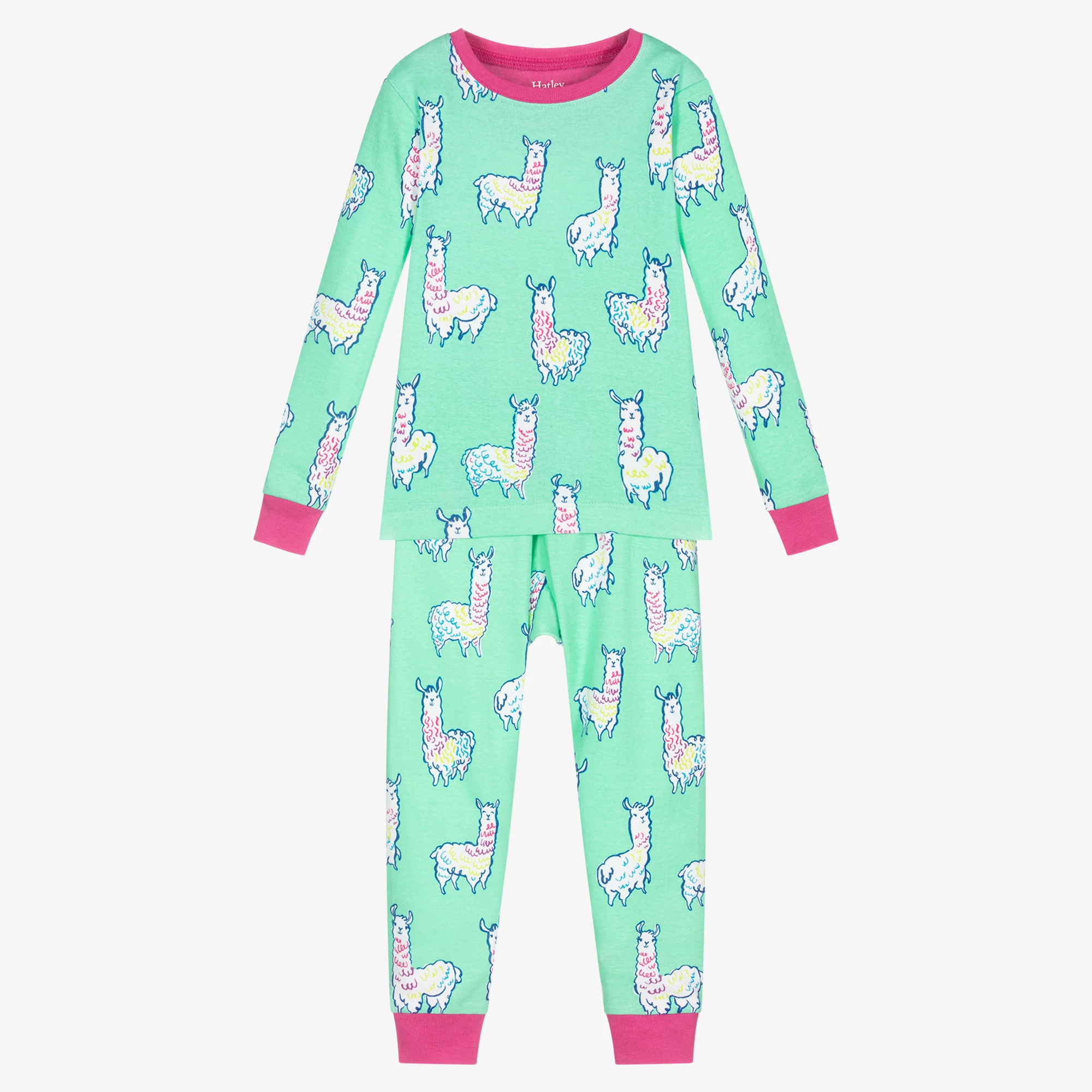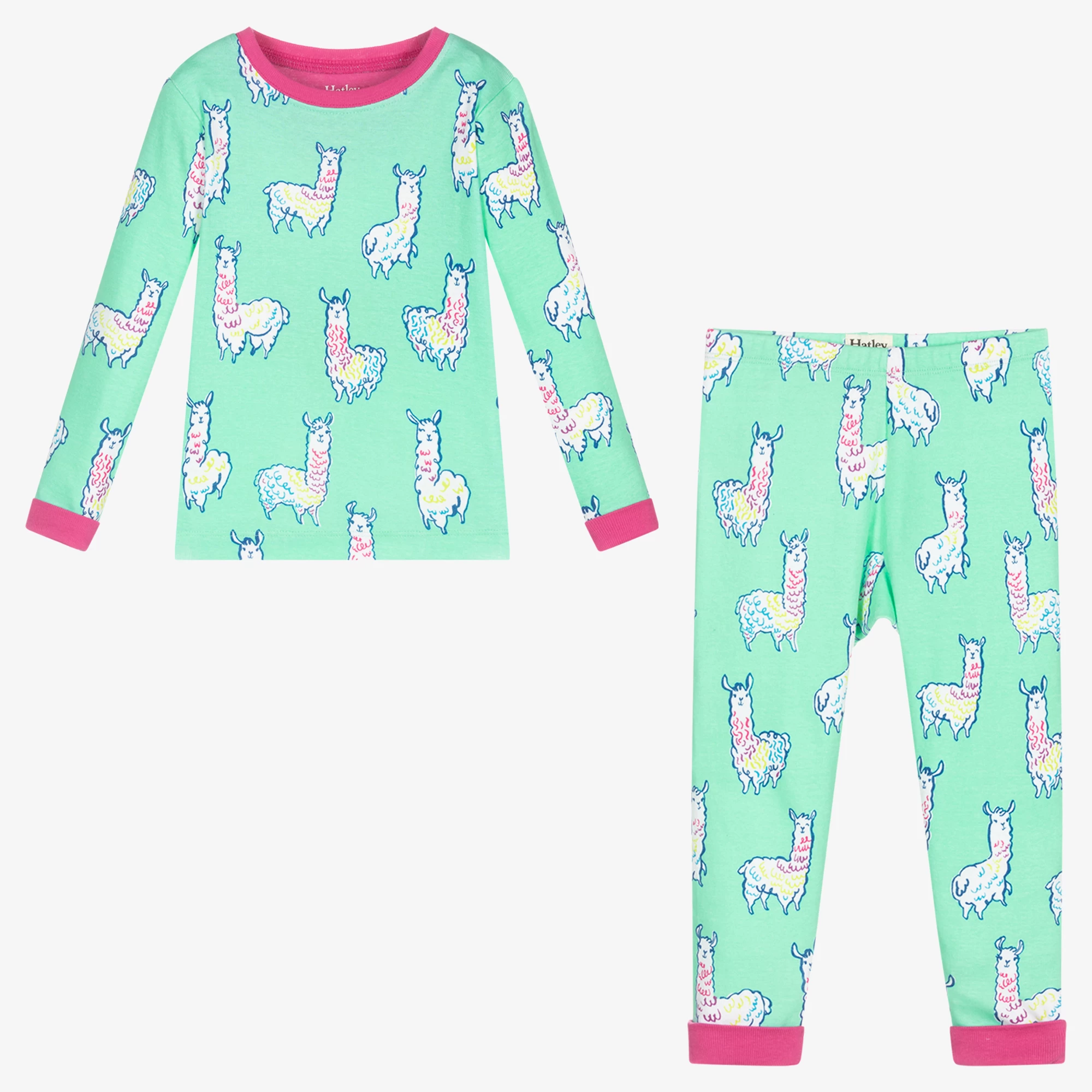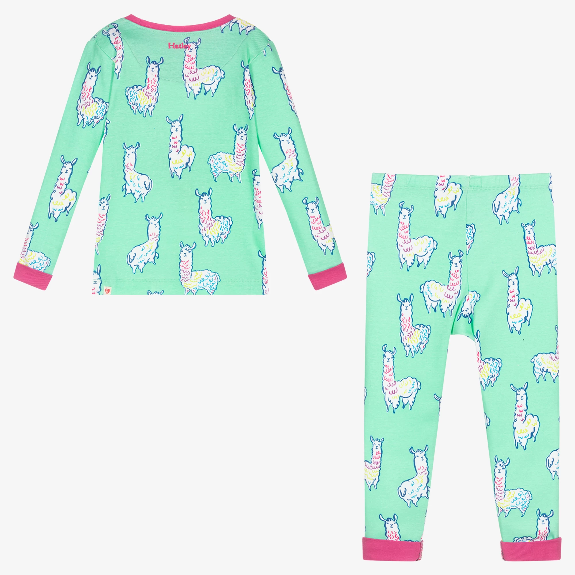 Pretty green long pyjamas for girls by Hatley, made in organic cotton jersey and designed to fit snugly. They have fuchsia pink trims and an adorable colourful alpacas print, with matching pink logo embroidery on the back of the neckline.