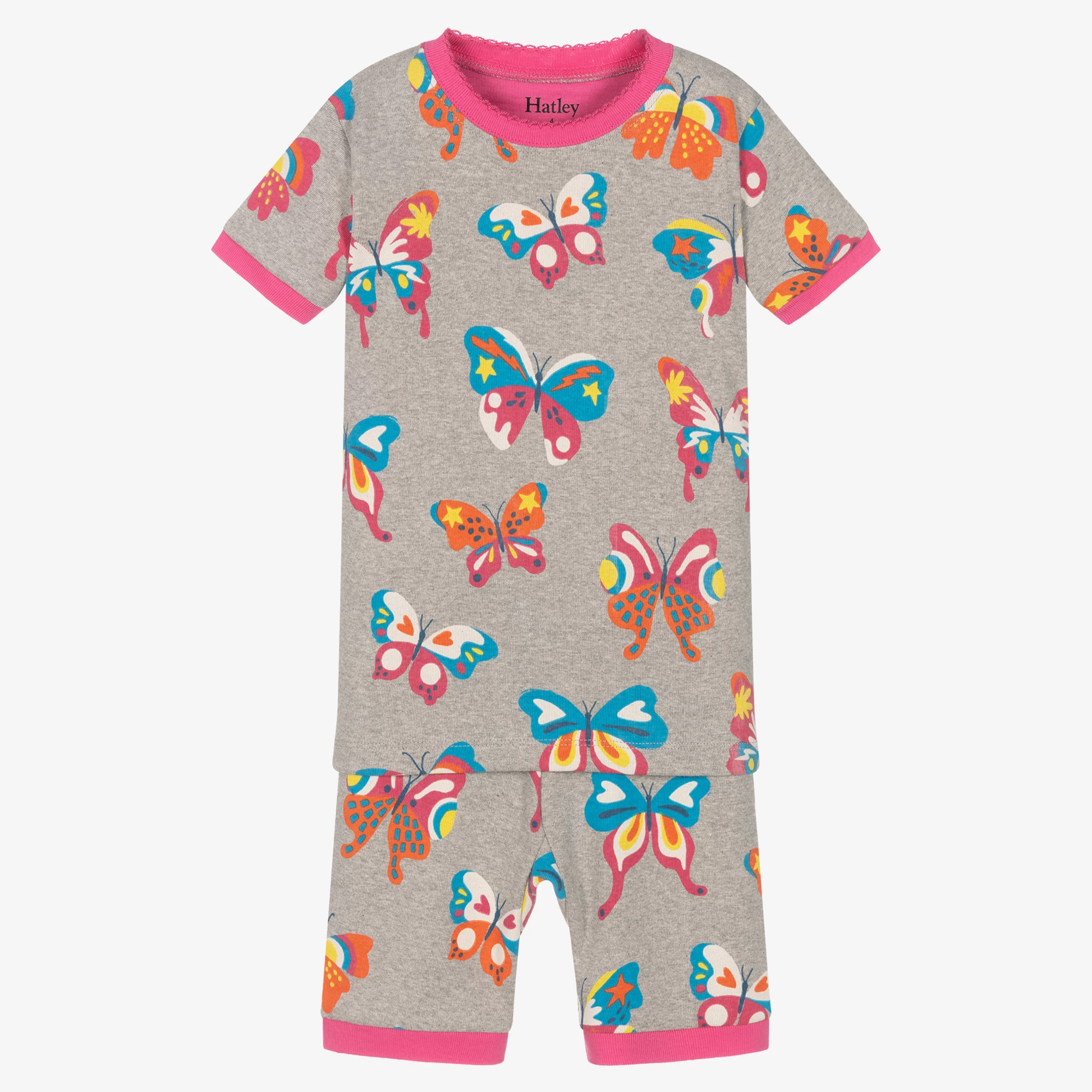Lovely grey marl pyjamas for girls by Hatley, made in soft cotton jersey. Patterned with a pretty, colourful butterfly print all-over, they have contrasting pink piped trims for a girly look. Snug fitting, the shorts have a stretchy waistband to keep your little girl comfortable during bedtime.