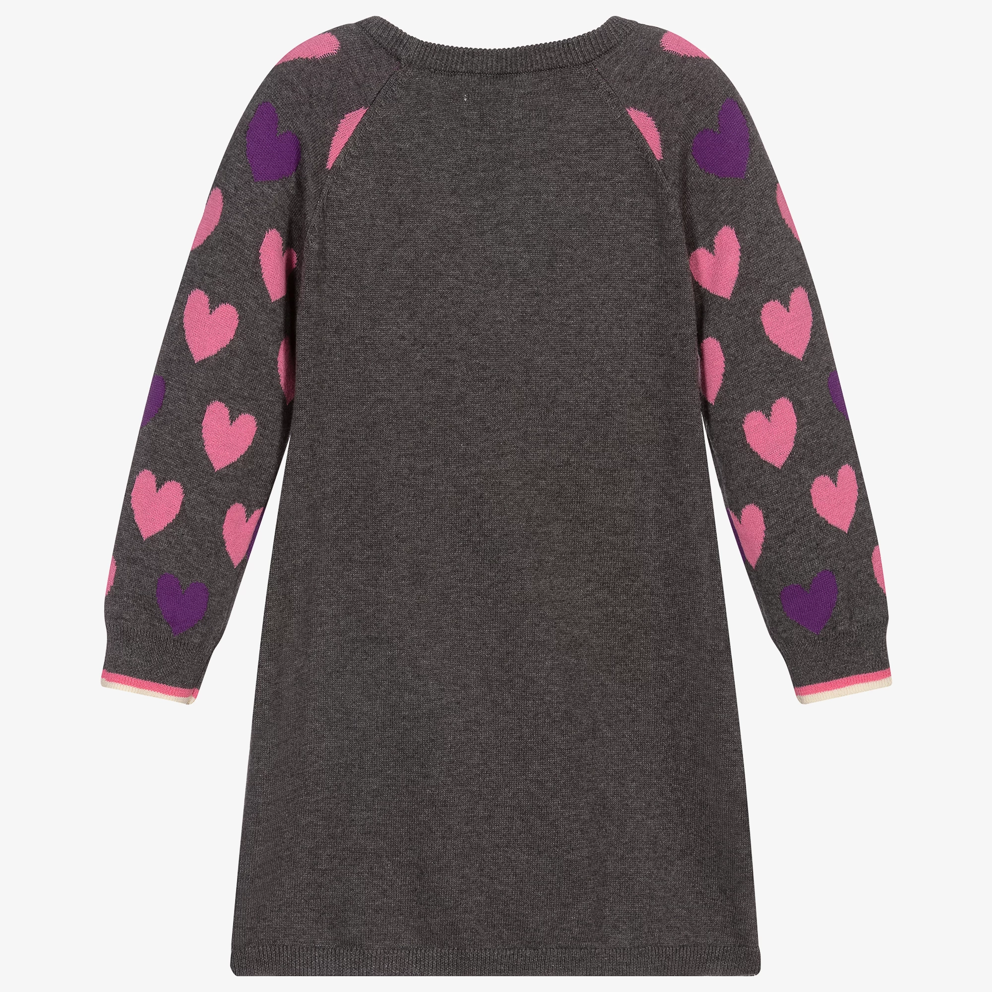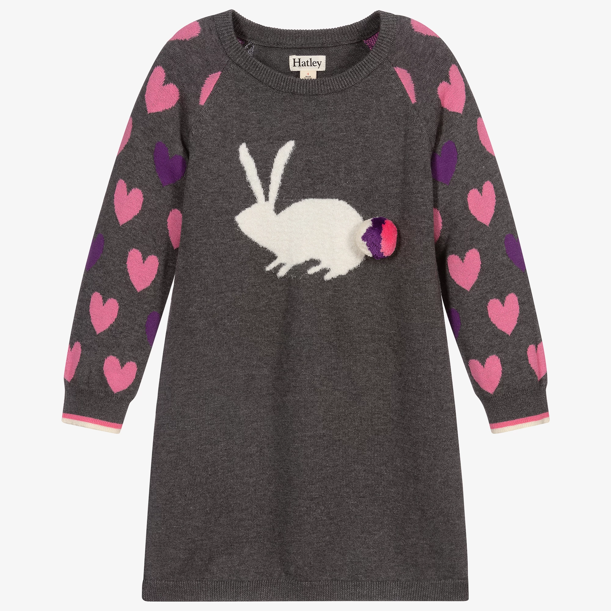 Charcoal grey cotton sweater dress for girls by Hatley, with pink and purple heart patterned sleeves. It has an ivory bunny design knitted on the front, complete with an ivory, purple and pink pom-pom tail.