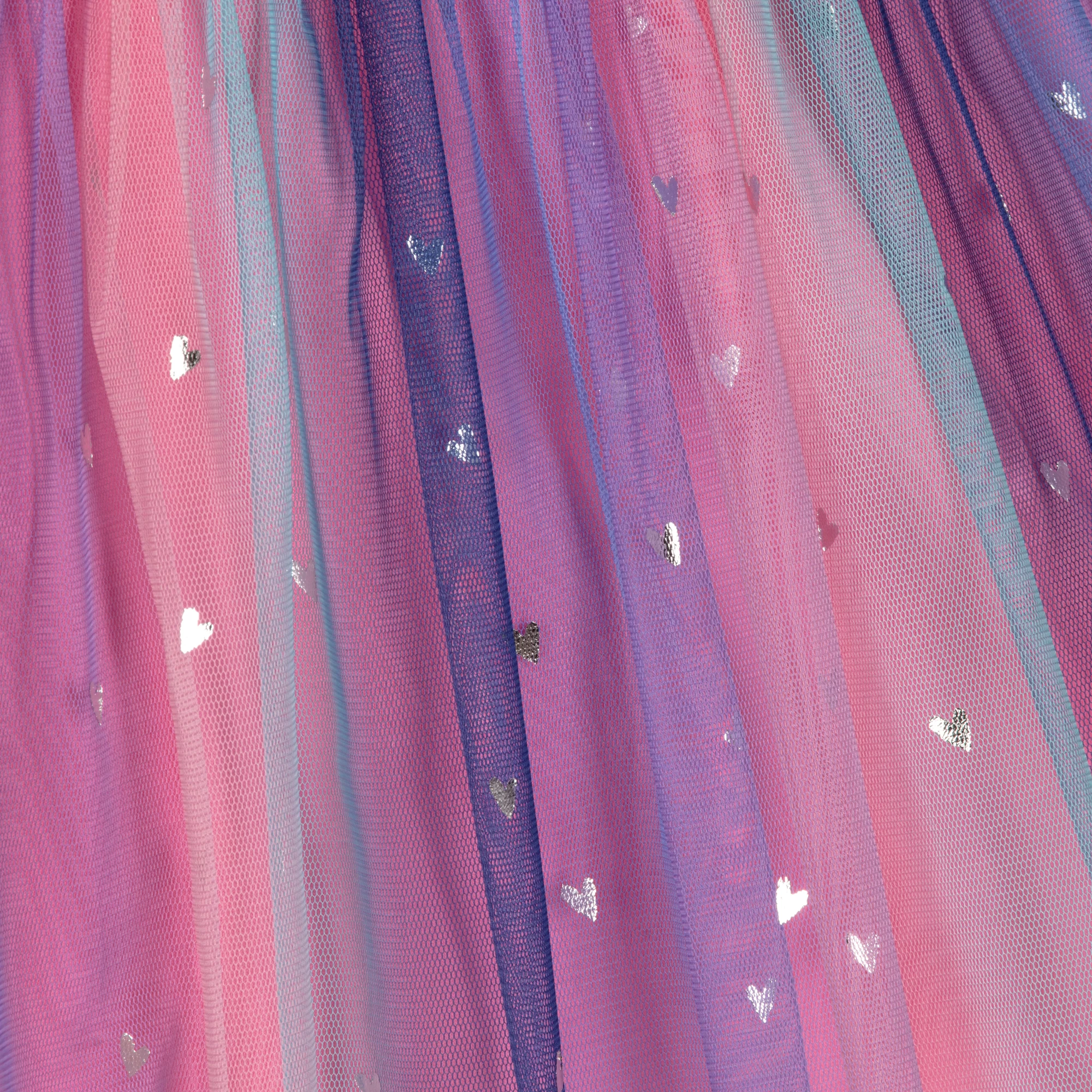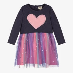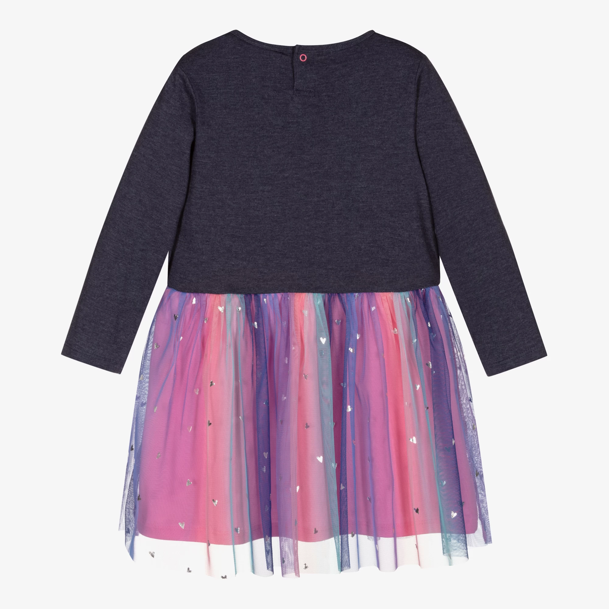 Girls dark blue-grey and pink dress from Hatley. The bodice is made in soft cotton blend jersey with a lovely pink heart appliqué on the front. The skirt is made in pink cotton jersey and has a gathered tulle overlay in green, pink and purple with a sparkly silver heart print.