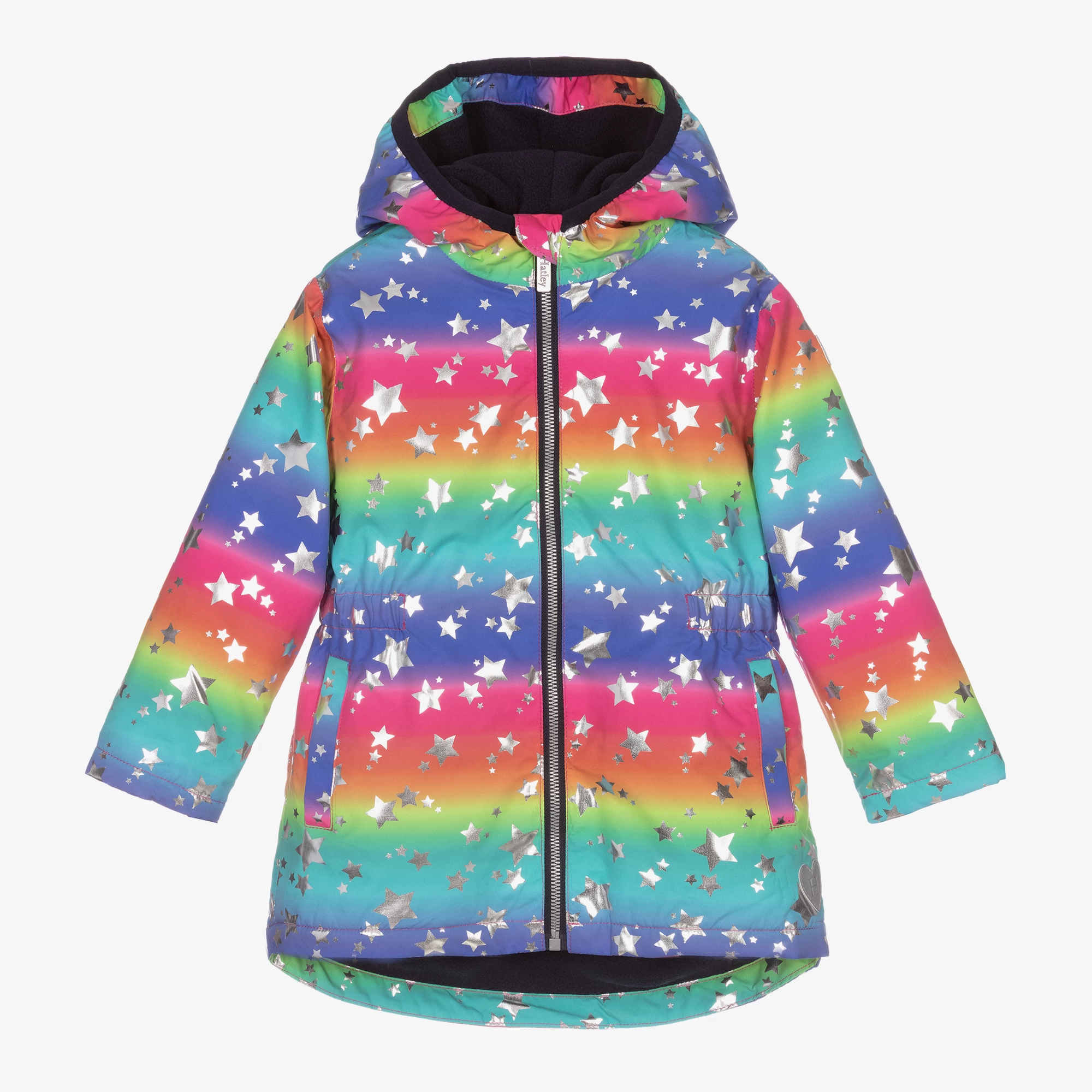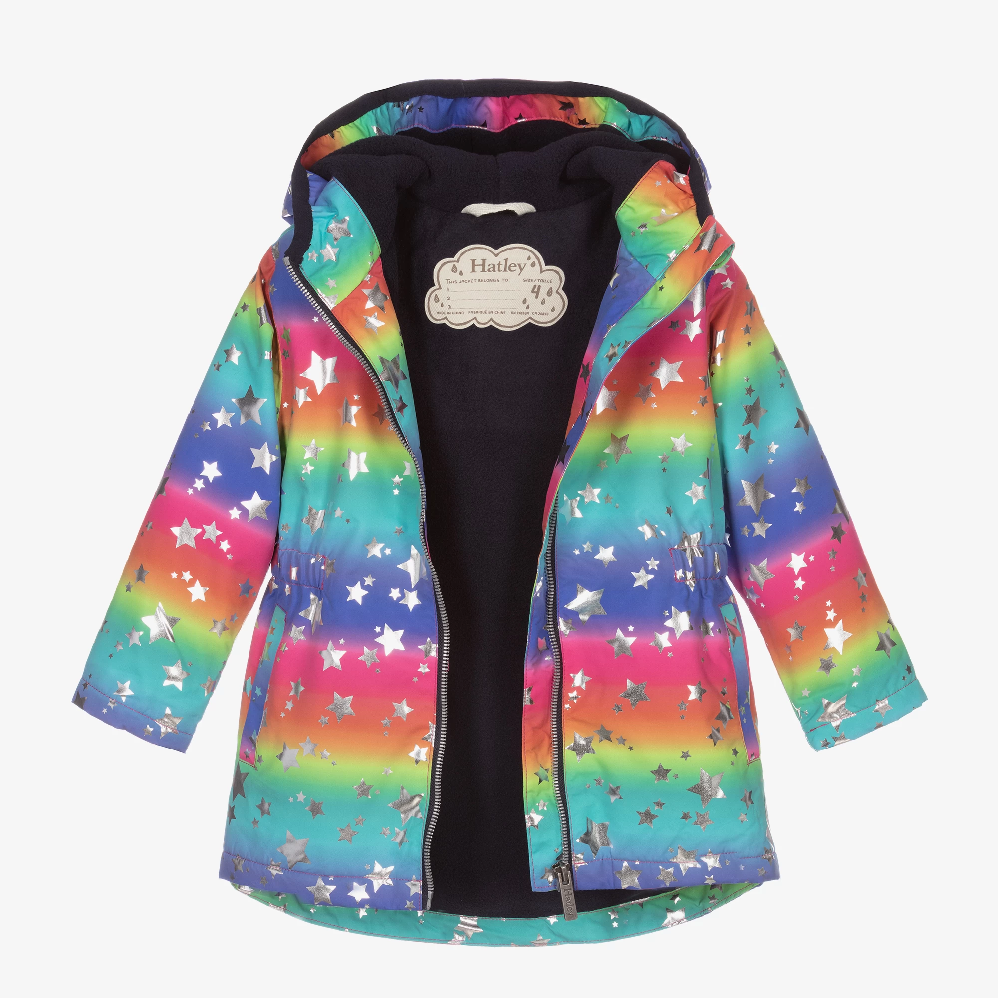 Fun multi-coloured hooded raincoat for girls by Hatley. Showerproof, it is made in smooth polyester with a polyurethane coating. Fastening with a zip, it has two front pockets, an elasticated waist, and soft polar fleece lining. There is a metallic silver star pattern and light reflective logo patches above the hem and on one sleeve.