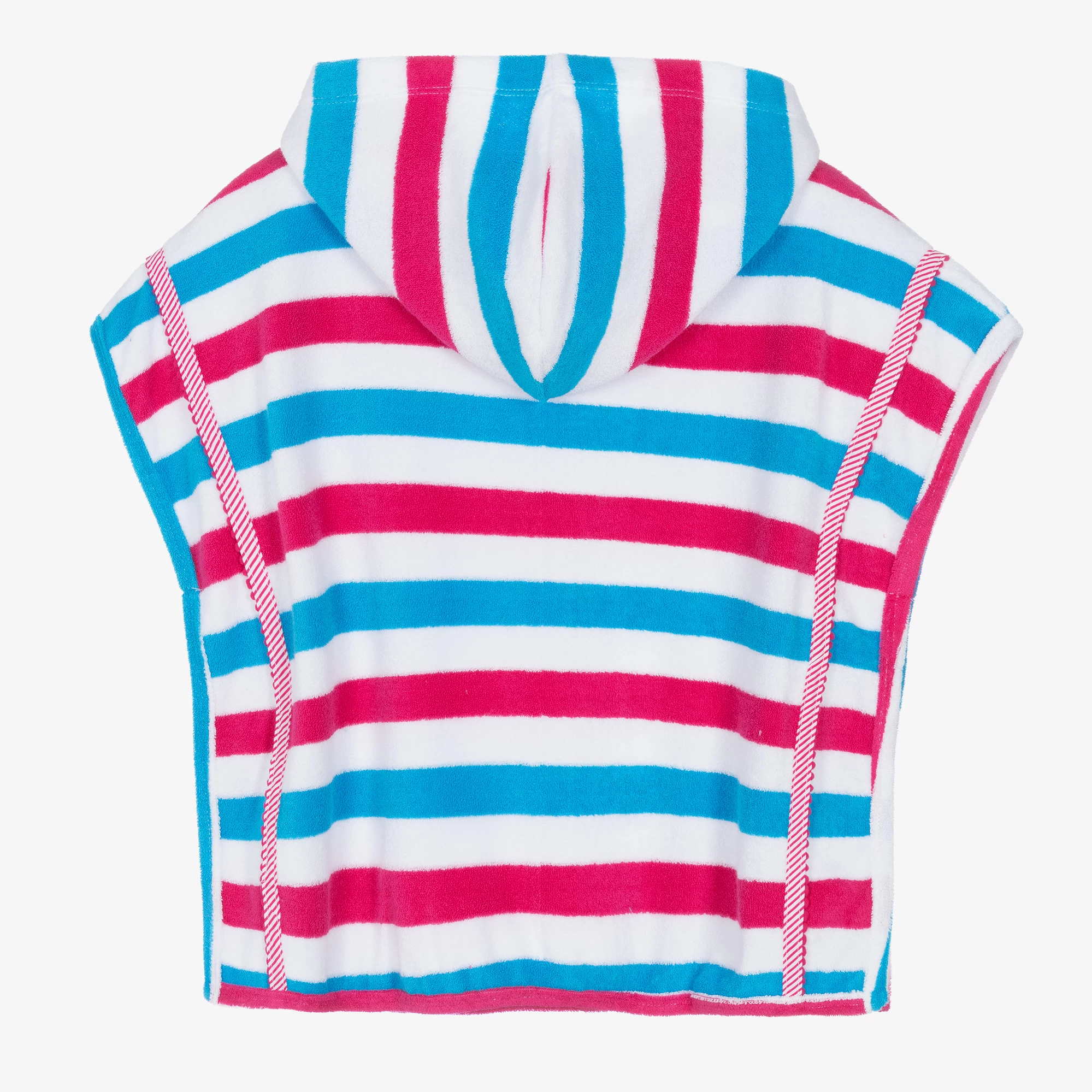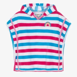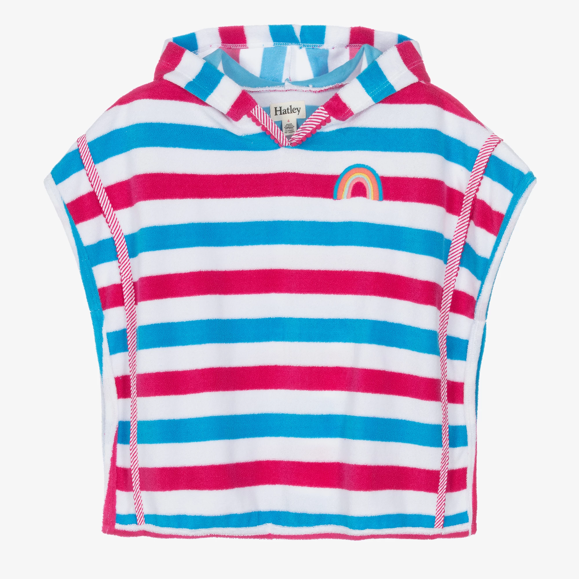 A white, blue and fuchsia pink striped towel for girls by Hatley, made in soft cotton towelling with a jersey underside. This poncho-style towel has a cosy hood, great for keeping your child warm after swimming or bath time. It has a colourful rainbow embroidered on the chest, with pom-pom trims.