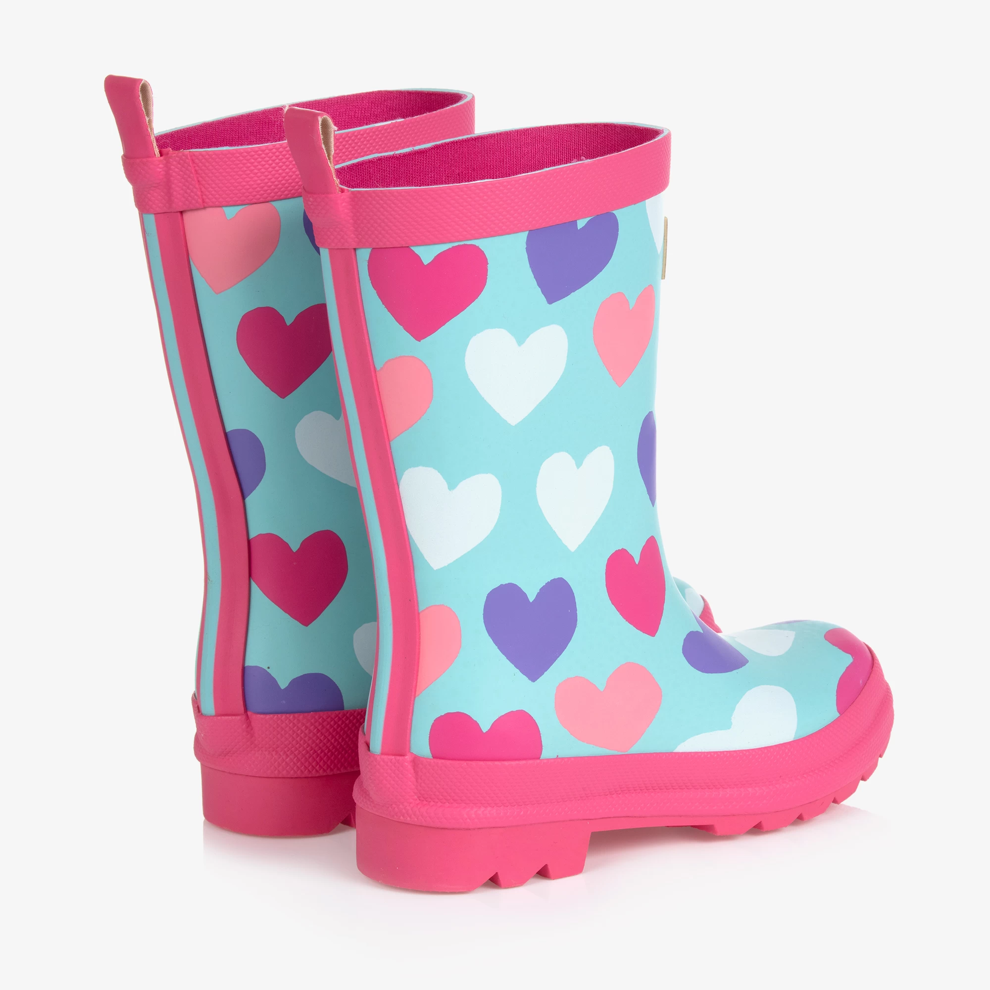 Bright pink and aqua blue rain boots for girls by Hatley, with a colourful hearts pattern. Made in PVC-free rubber with a soft cotton jersey lining, they have removable insoles and slip-resistant outer soles. Just right for splashing in puddles, these waterproof boots have a useful pull tab on the back and a reflective logo patch on the front.