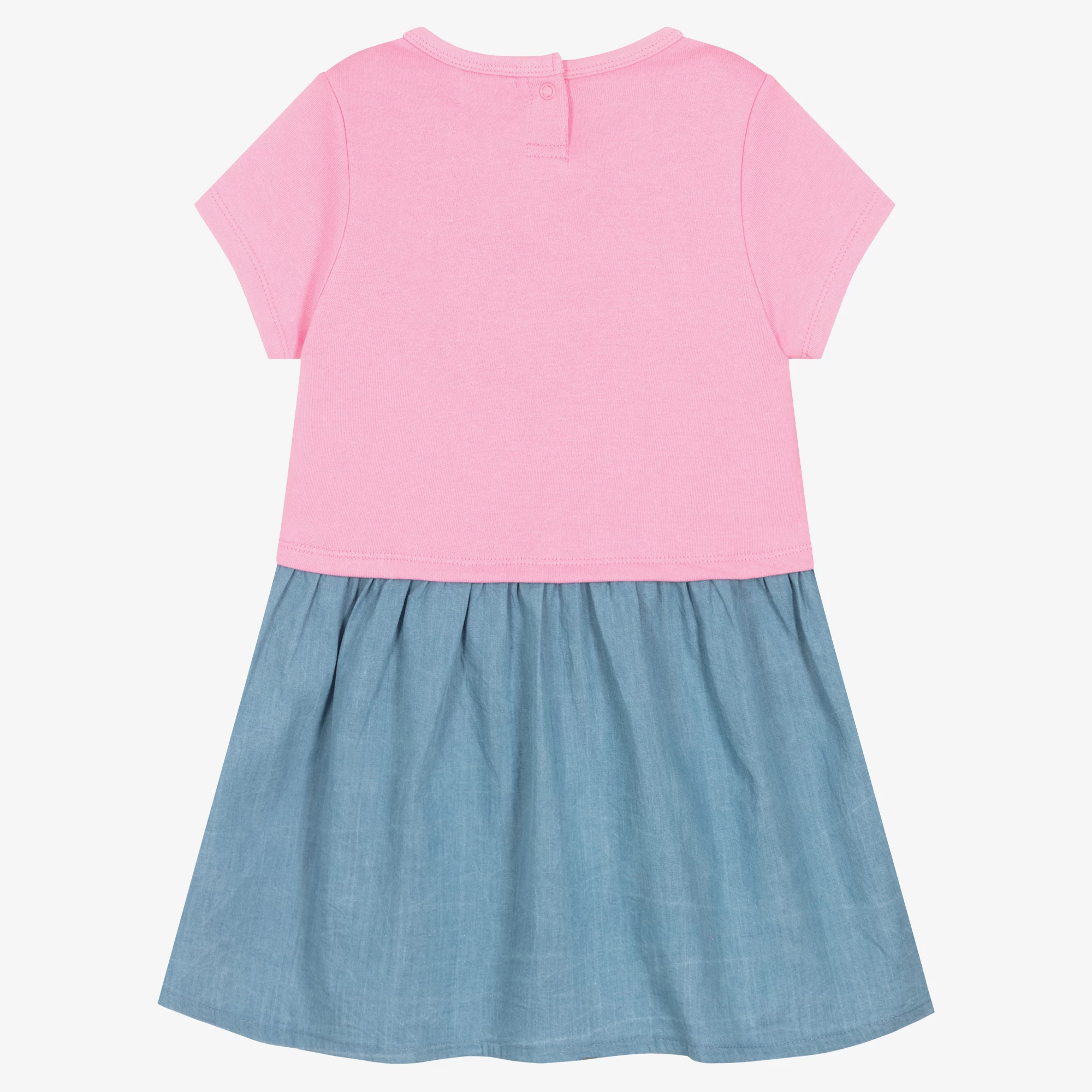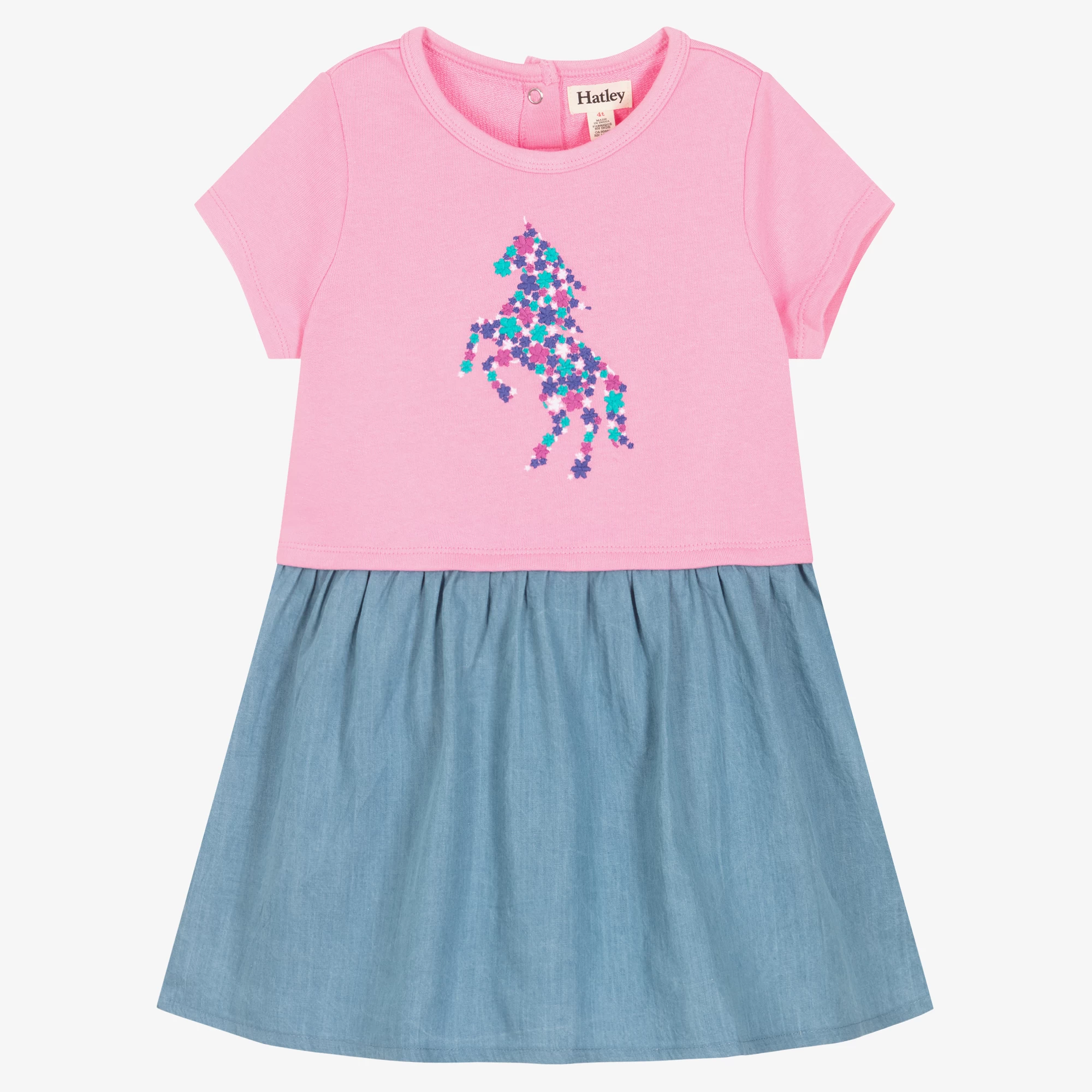 Girls pink and blue dress by Hatley. The top half is made in soft cotton jersey in a T-shirt style, with an attached cotton chambray skirt. The front of the top has an embroidered unicorn motif and it fastens on the back with a single popper.